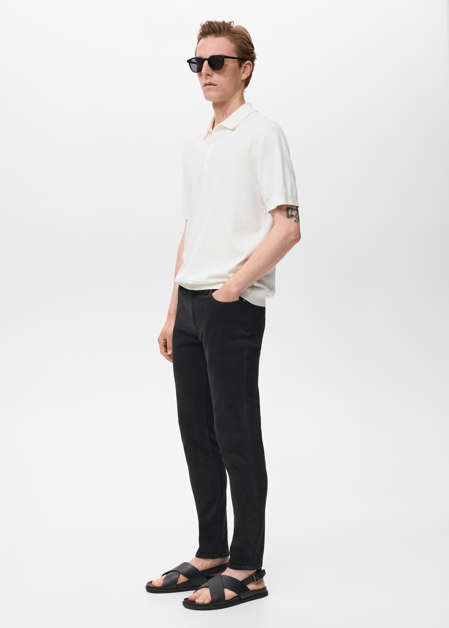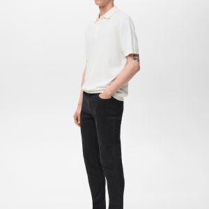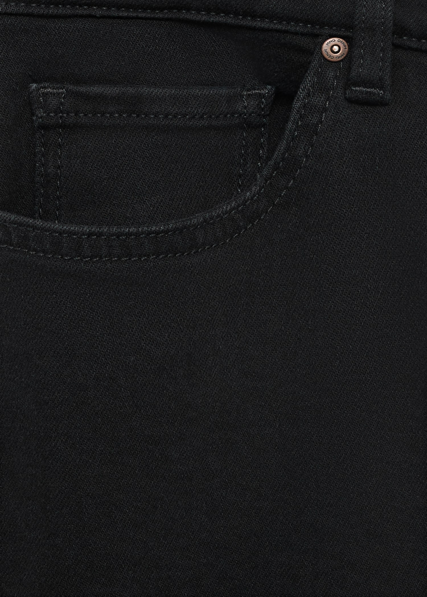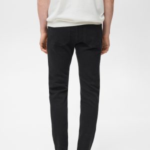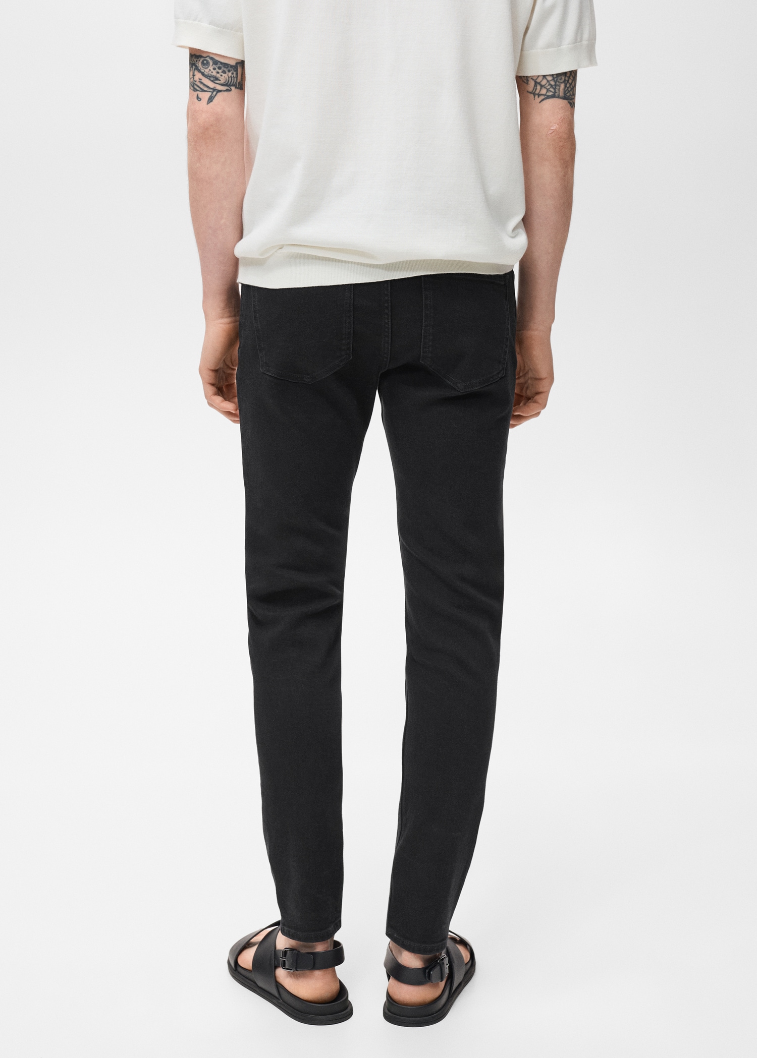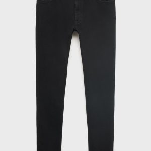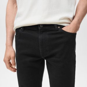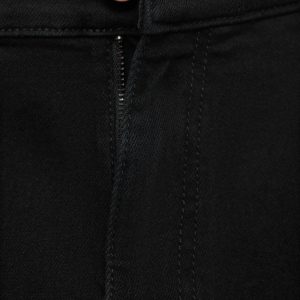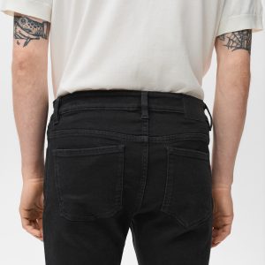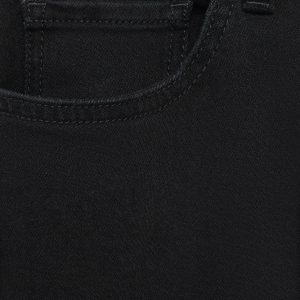 Cotton fabric. Black. Belt loops. Zip and button closure. Two side pockets. Coin pocket. Two patch pockets at the back. Denim jeans style. Skinny fit: the tightest fitting jeans