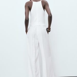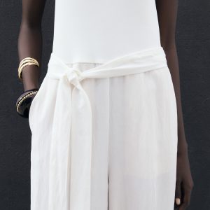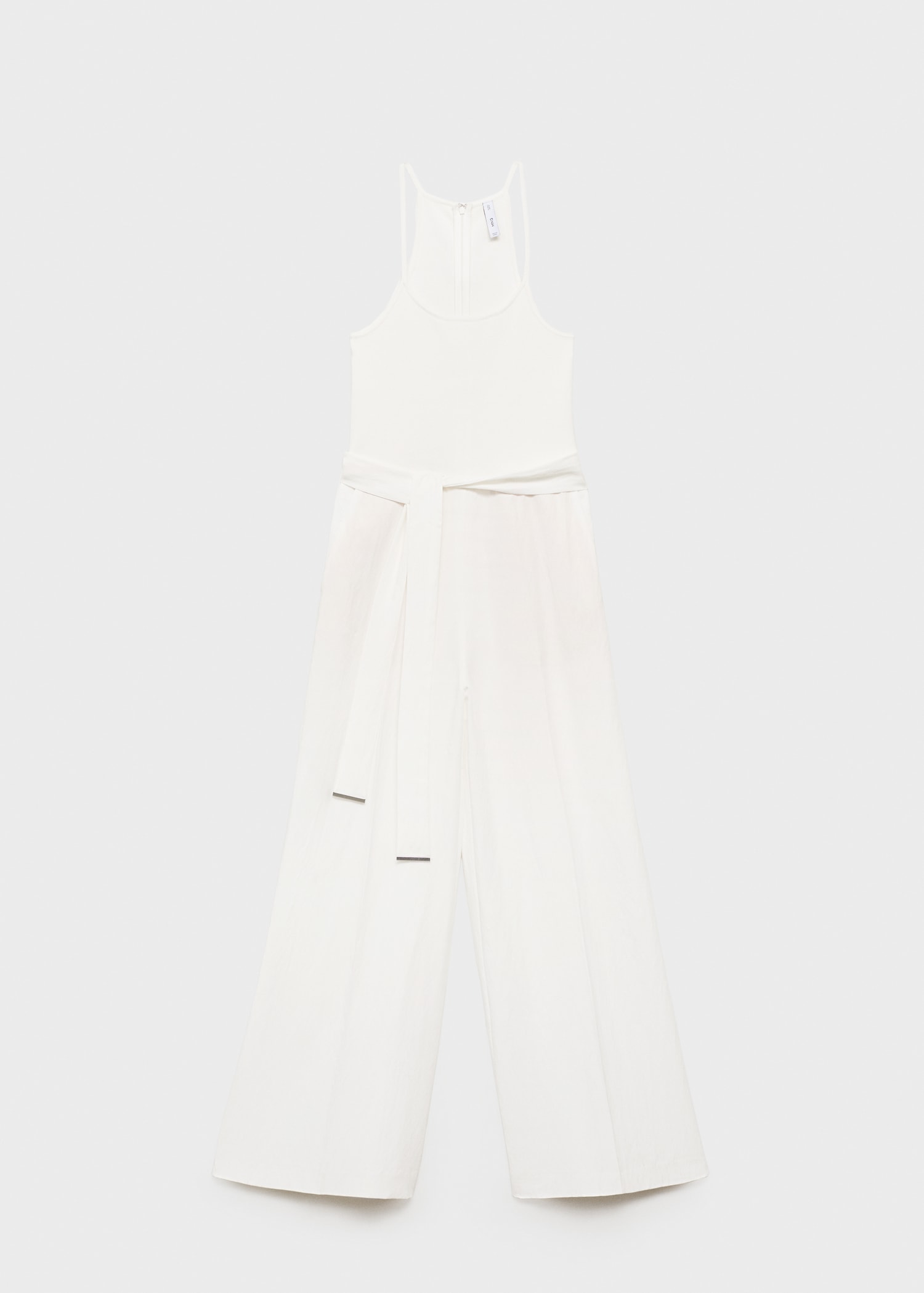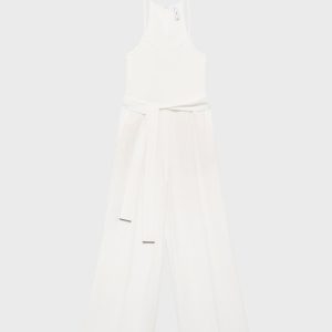 Lyocell fabric. Long design. Straight Design. Combined design. Low neckline. Sleeveless. Thin straps. Decorative belt. Two side pockets. Back zipper closure. Online Exclusive
