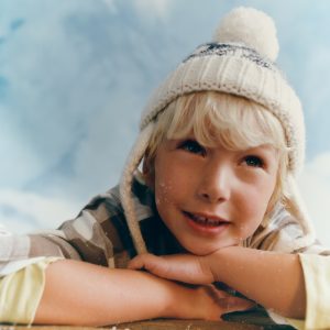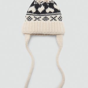 Knitted fabric. Embroidered design. Heart drawing. Turn-up detail. Decorative tassel. Tie closure. Available set. This hat has a matching scarf available