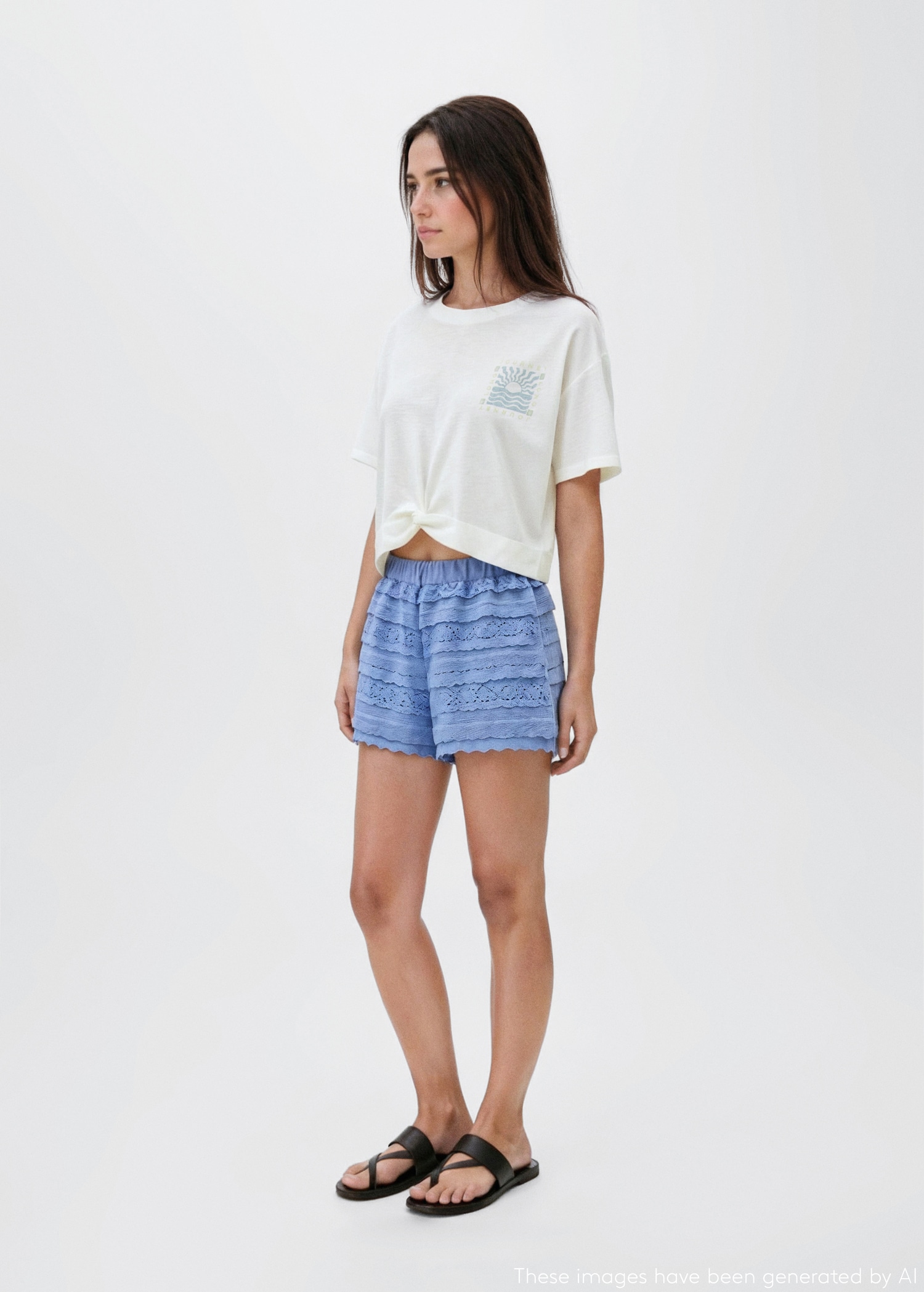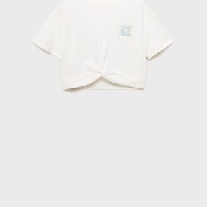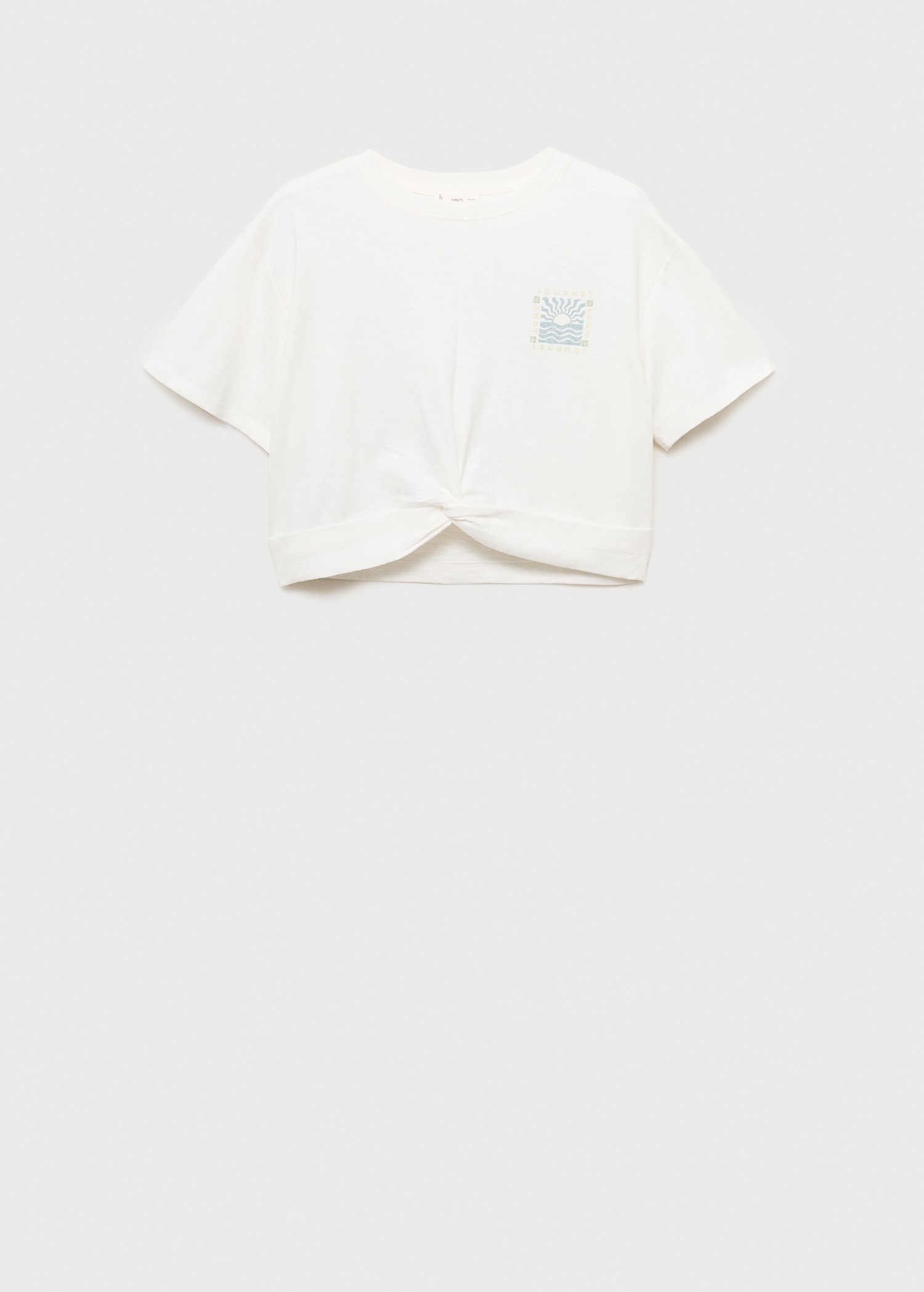 100% cotton fabric. Short design. Crop design. Crew neck. Short sleeve. Printed graphic on the chest. Knot detail on the bottom of the t-shirt