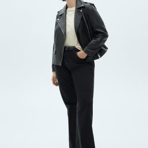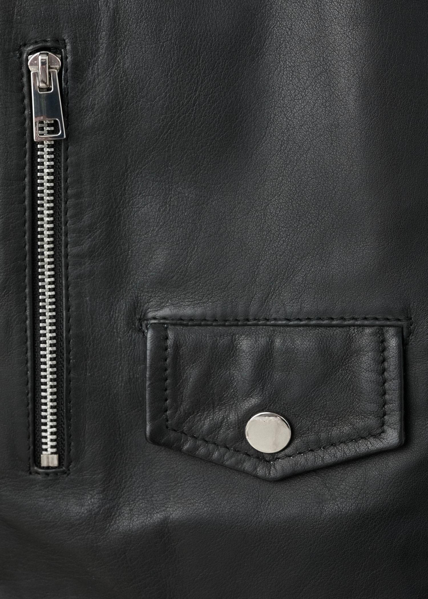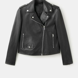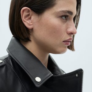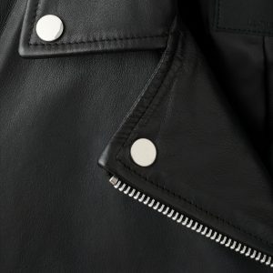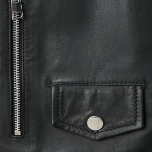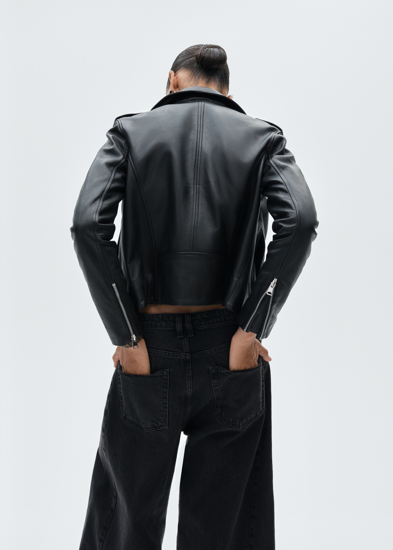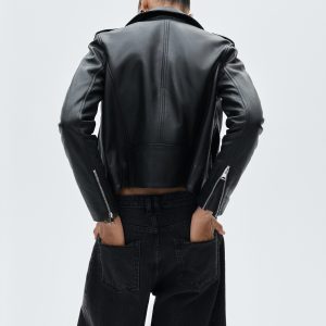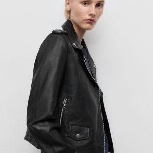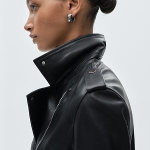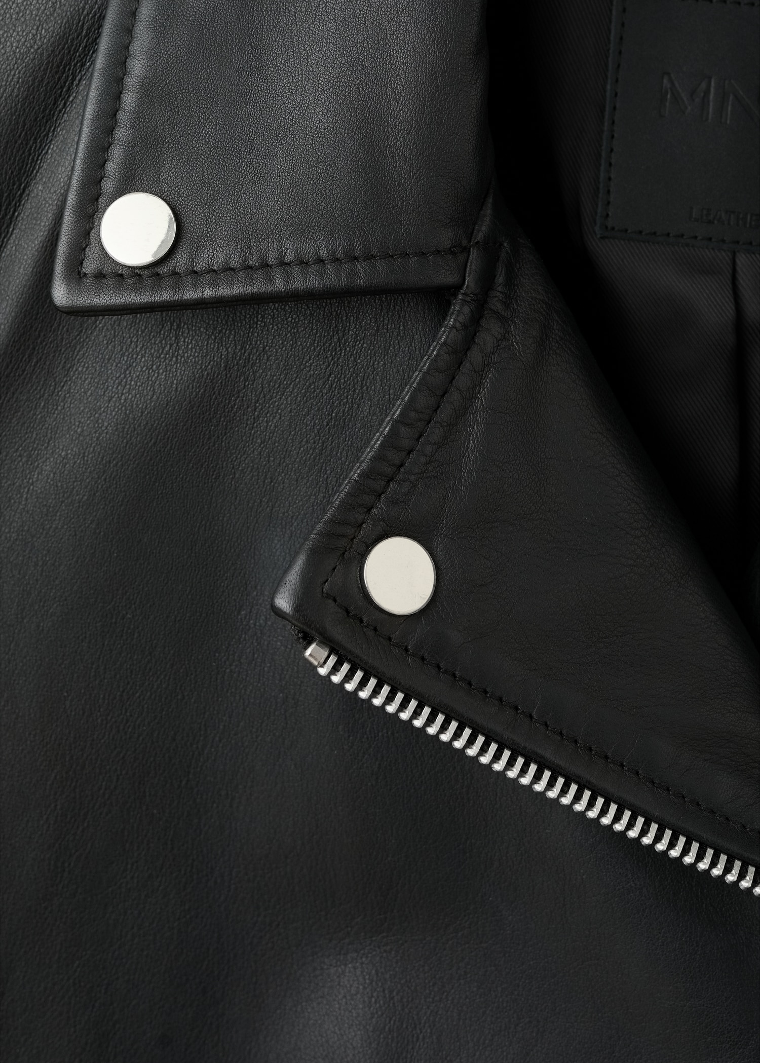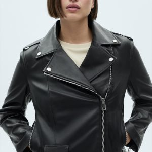100% ovine leather. Biker design. Straight Design. Lapel-collar V-neck collar. Long sleeves with zipped cuff. Zipper pockets on both sides. Front zipper closure. Inner lining. Available Plus. Nappa leather. Inner lining. Standard Length. Slim Silhouette. Front Closure Location. Padding Lining Only Lining. Heavy Flat Structure. Peak Lapel. Material Nappa