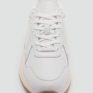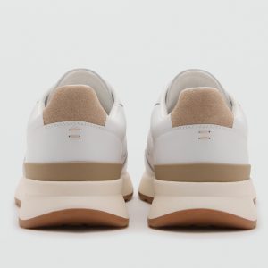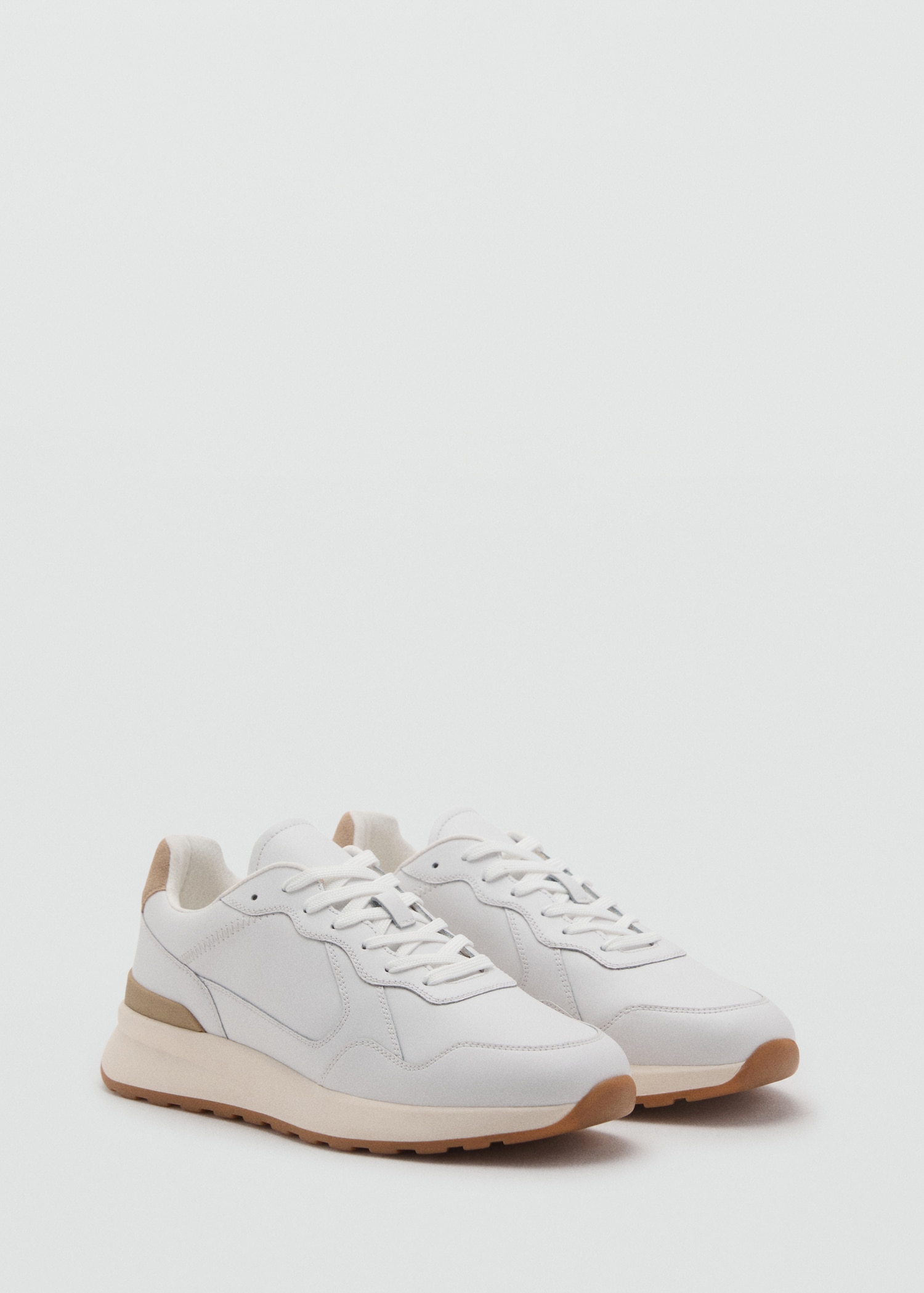 Running style. Leather cut. Combined pieces of color and material in the cut. Rounded toe. Six-pass lace-up closure. Toothed rubber sole