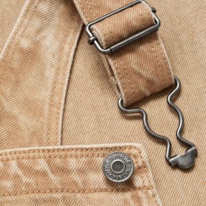 100% cotton fabric. Denim fabric. Long design. Straight Design. Straight neckline. Adjustable straps. Front patch pocket. Two side pockets. Side button closure. Two patch pockets at the back