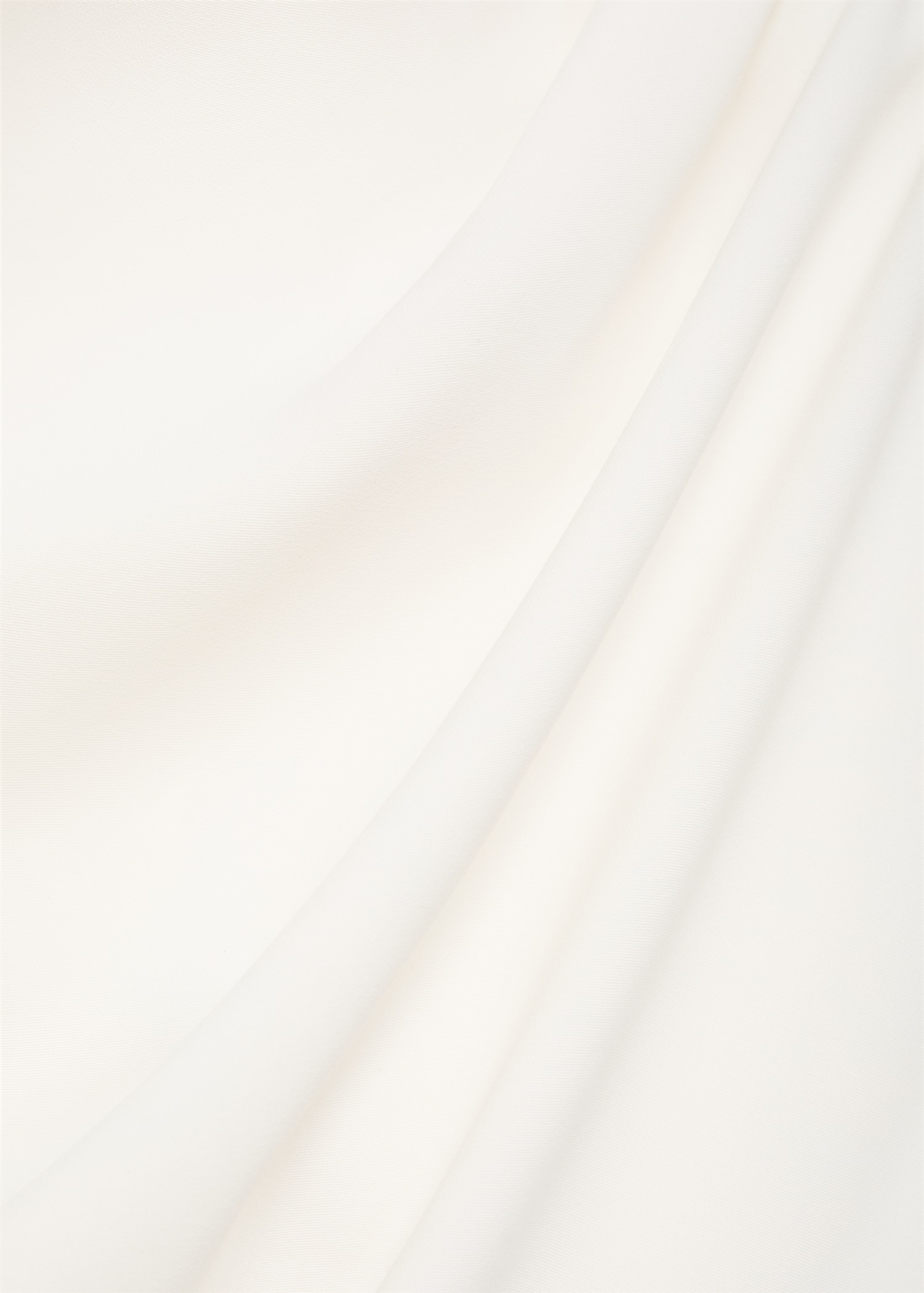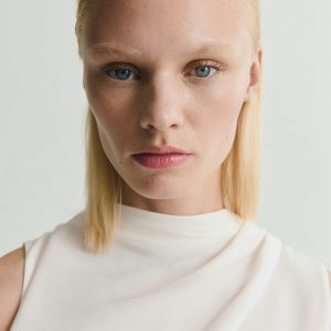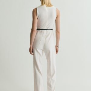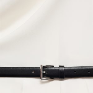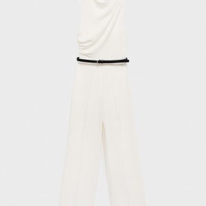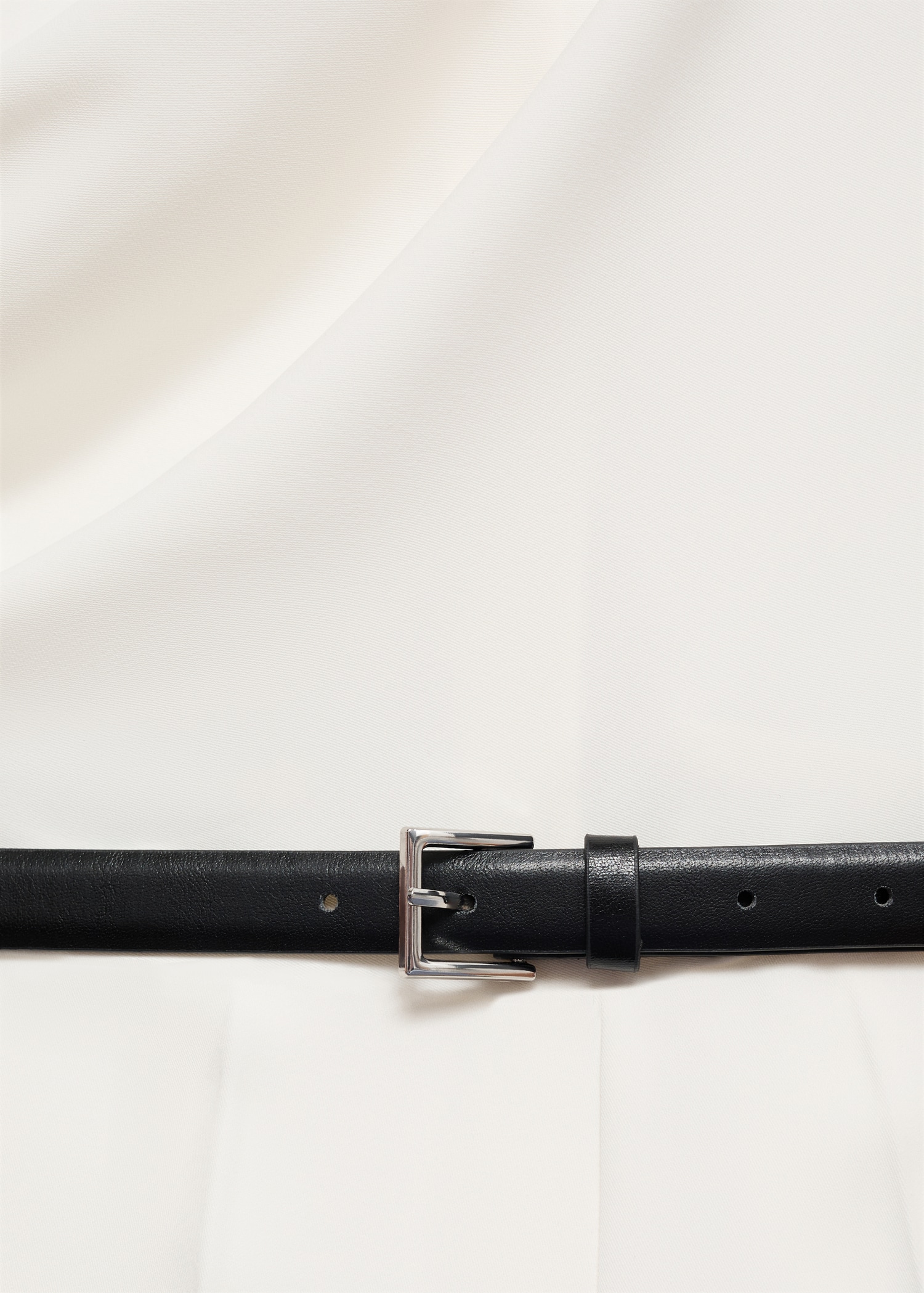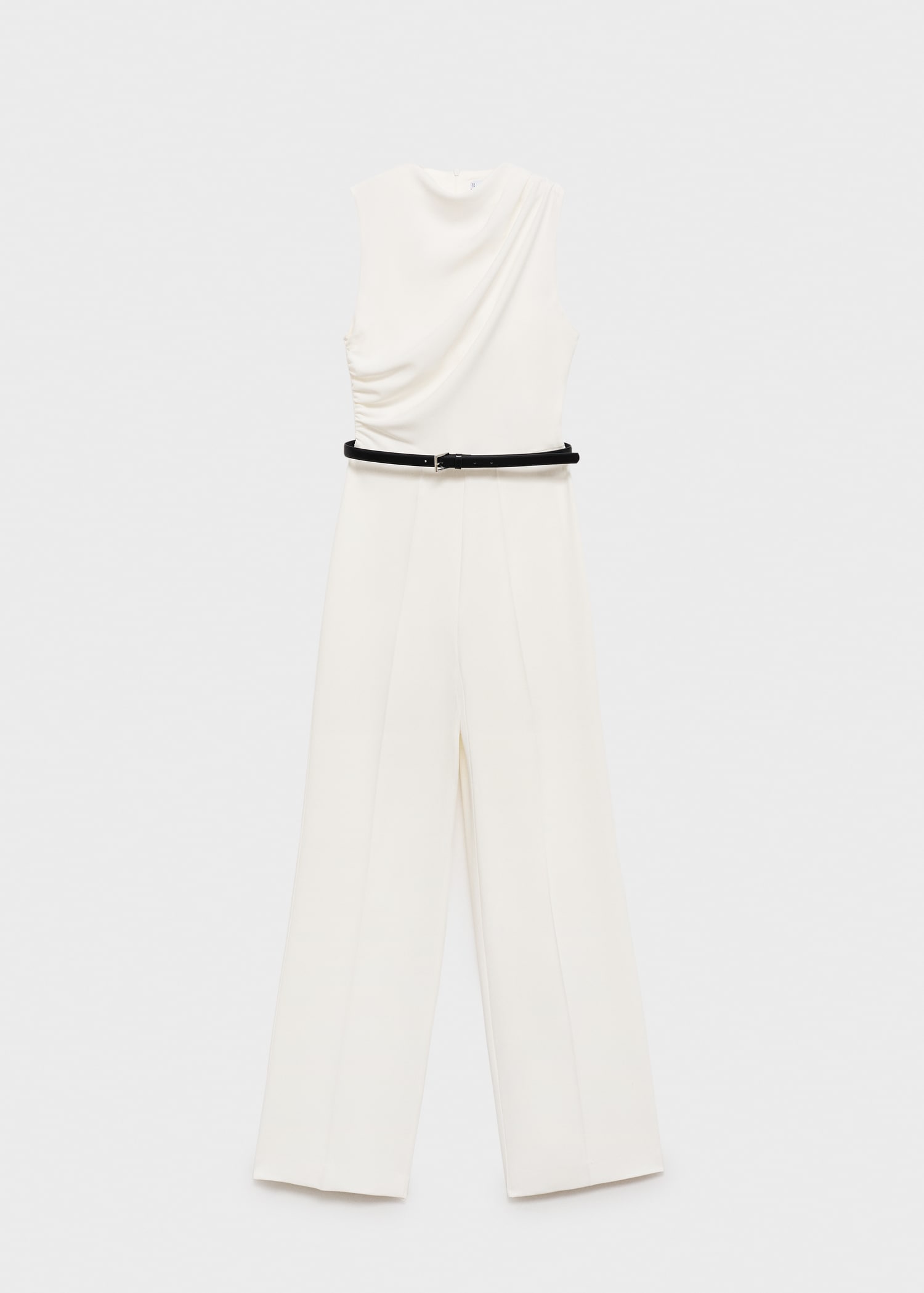 Long design. Straight Design. Draped neckline. Sleeveless. Wide straps. Belt loops. Belt buckle fastening. Removable belt. Back zipper closure