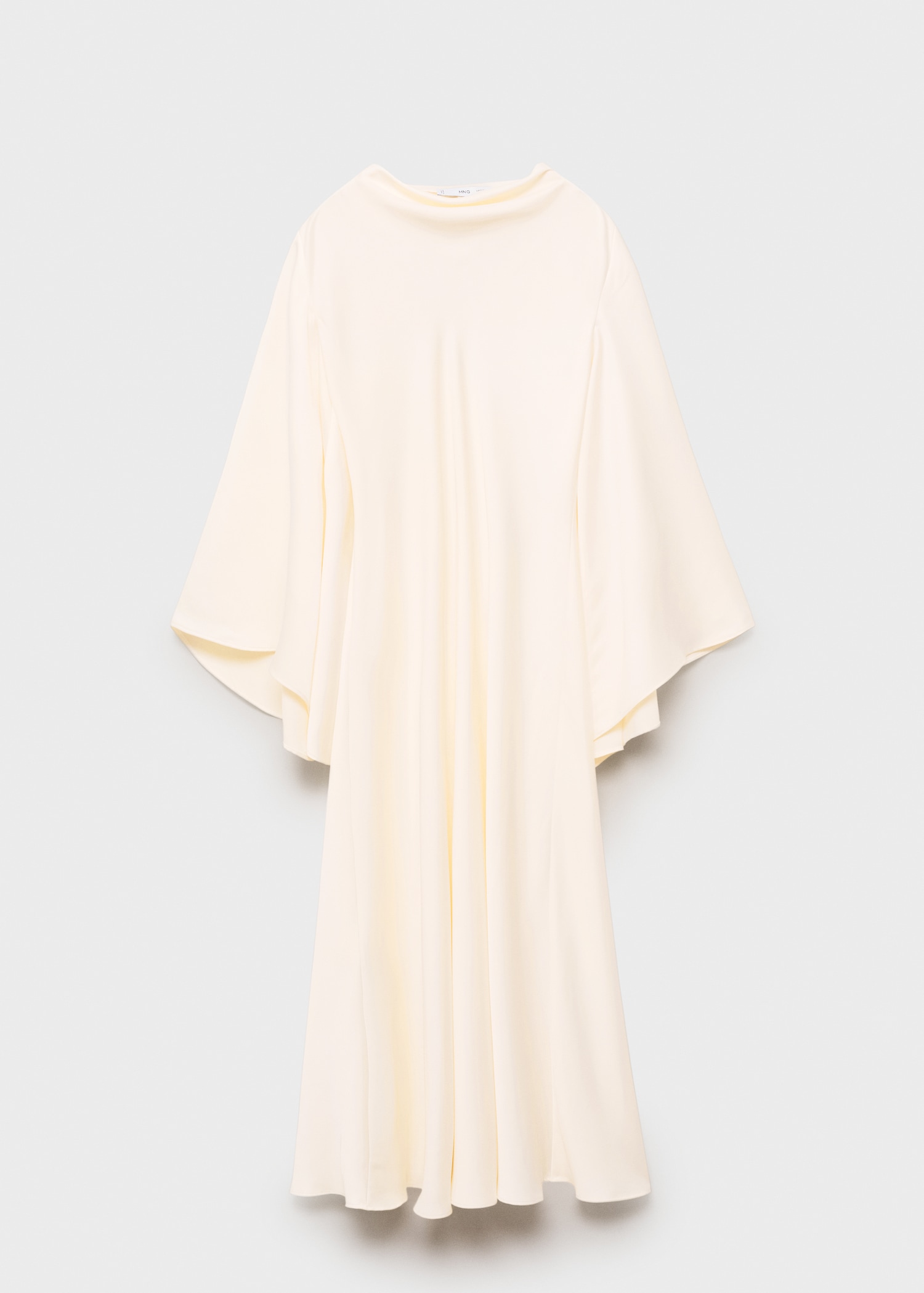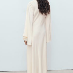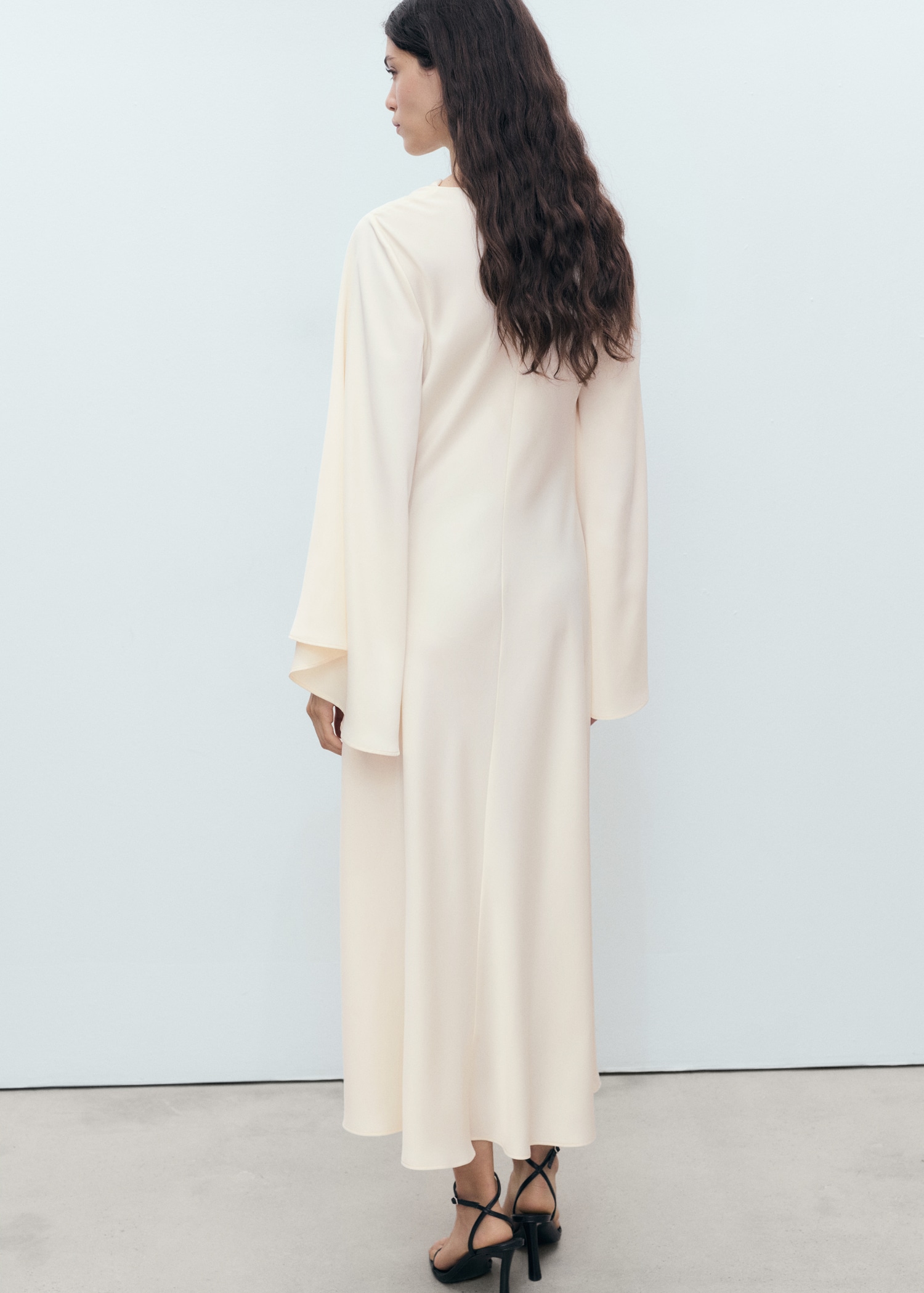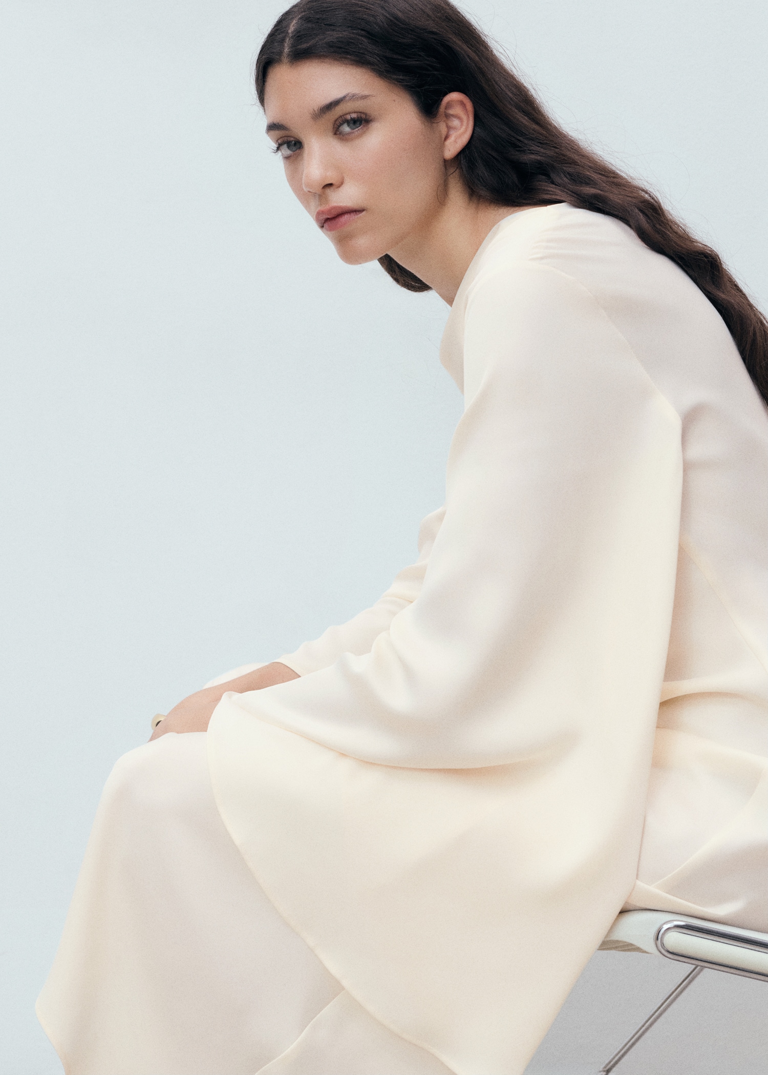 Satin weave. Long design. A-line design. Draped neckline. Long flared sleeve. Back zipper closure. This garment is part of our event collection, designed to make you the perfect guest at any party, wedding, or ceremony.. Fluid fabric with satin finish. Ramadan Collection