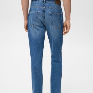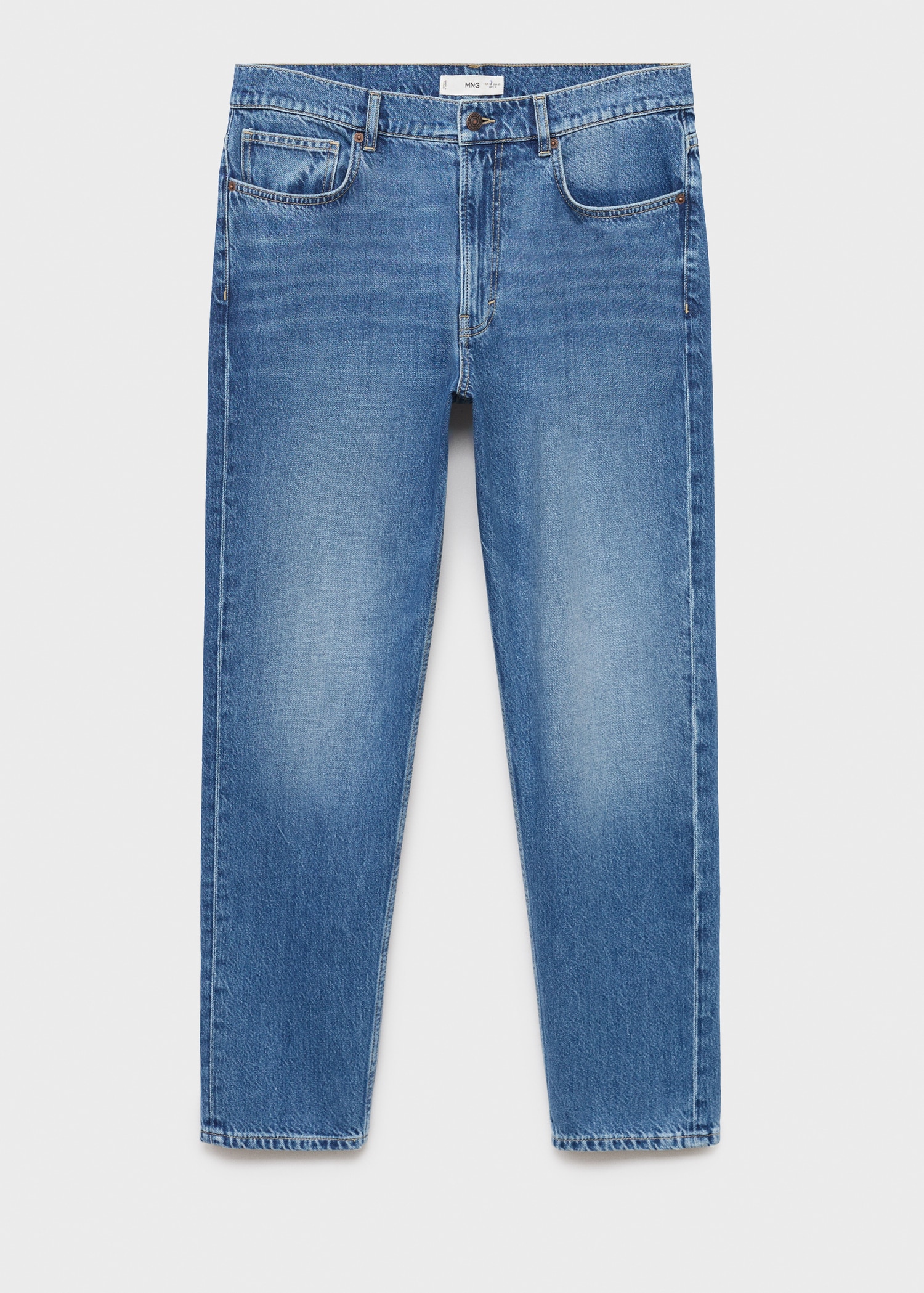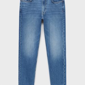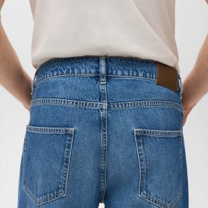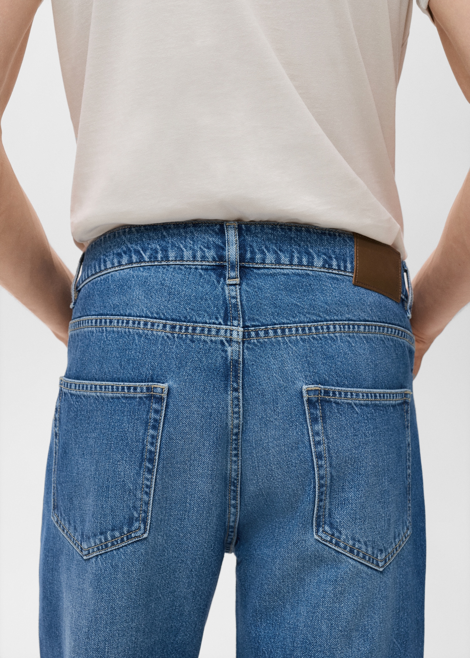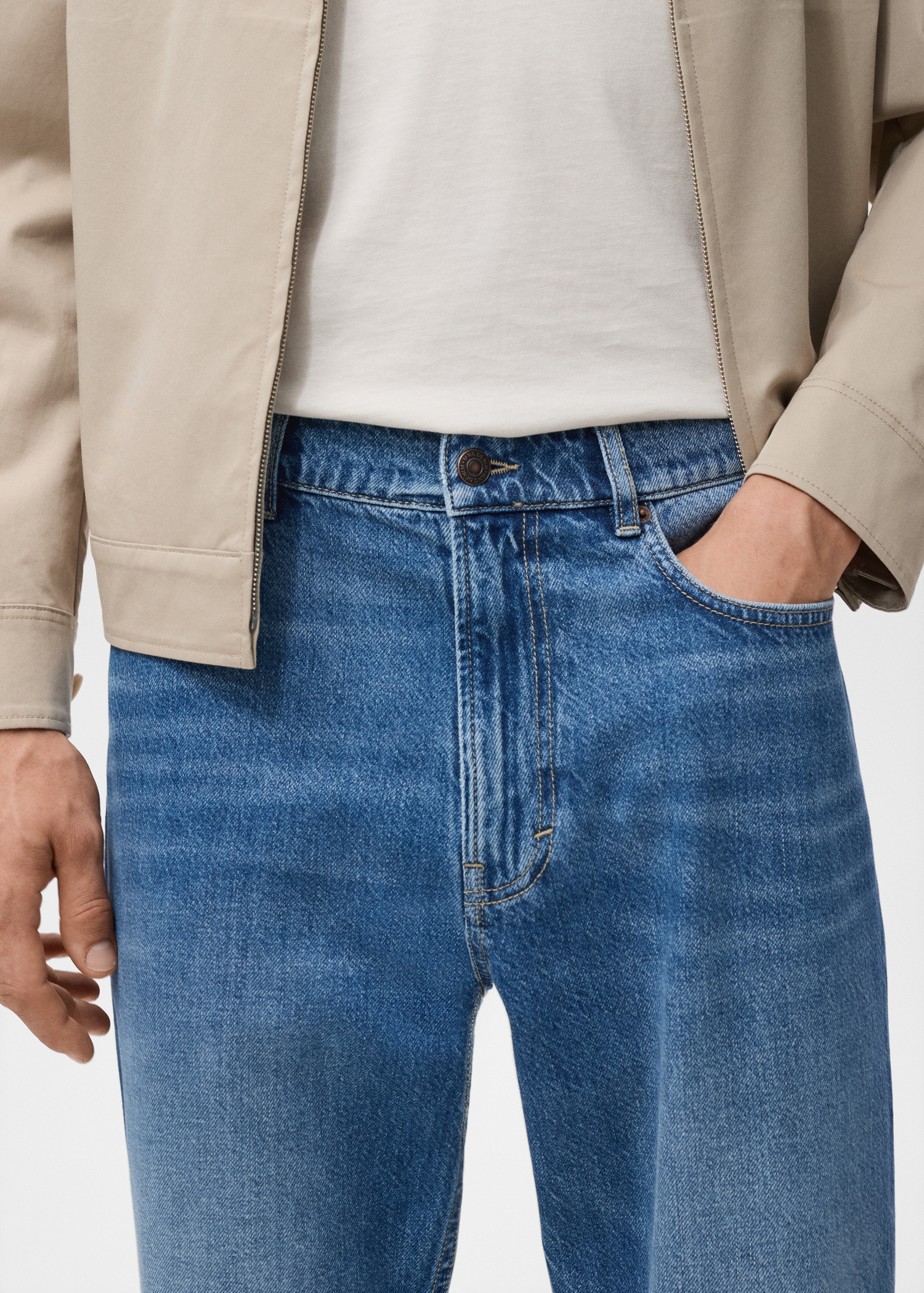 100% cotton fabric. Tapered fit. Dark wash. Two front patch pockets. Coin pocket. Two patch pockets at the back. Belt loops. Zip and button closure