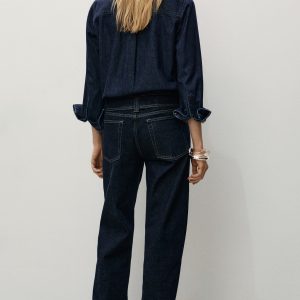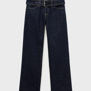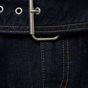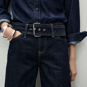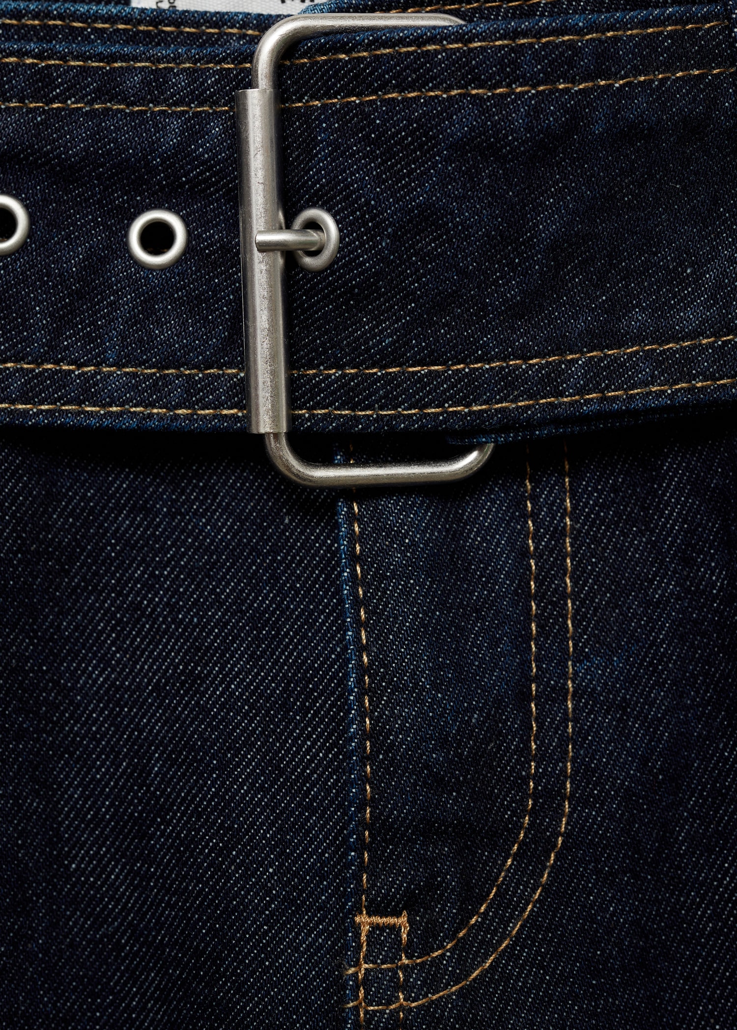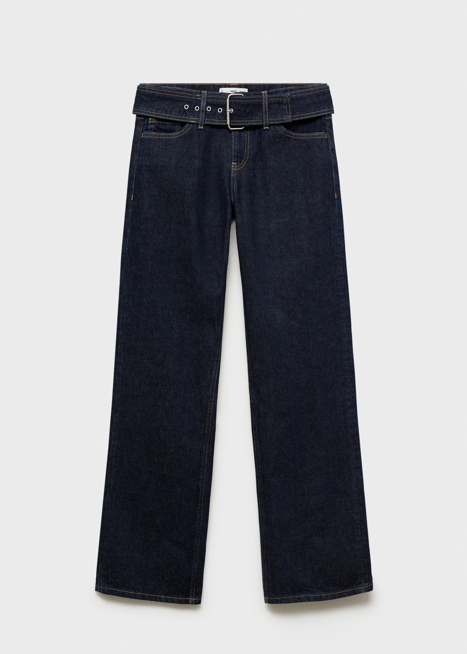 100% Cotton. Cotton denim fabric. Straight Design. Long design. Low waist. Adjustable belt. Five pockets. Zip and button closure. Belt loops. Inside length 31.1 in