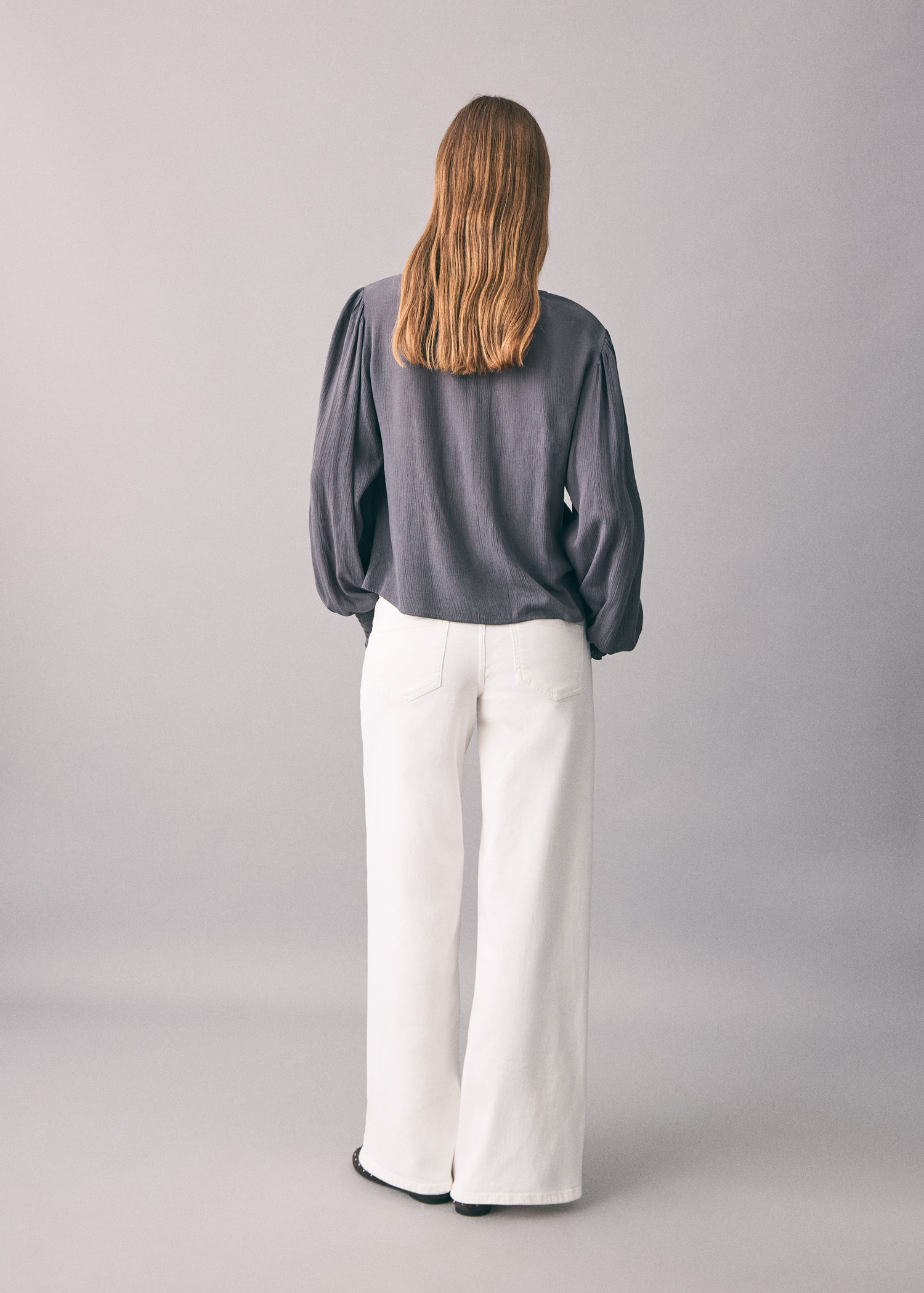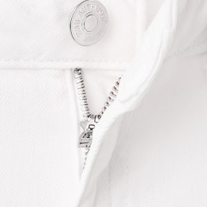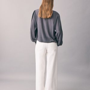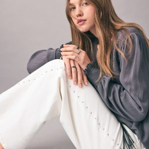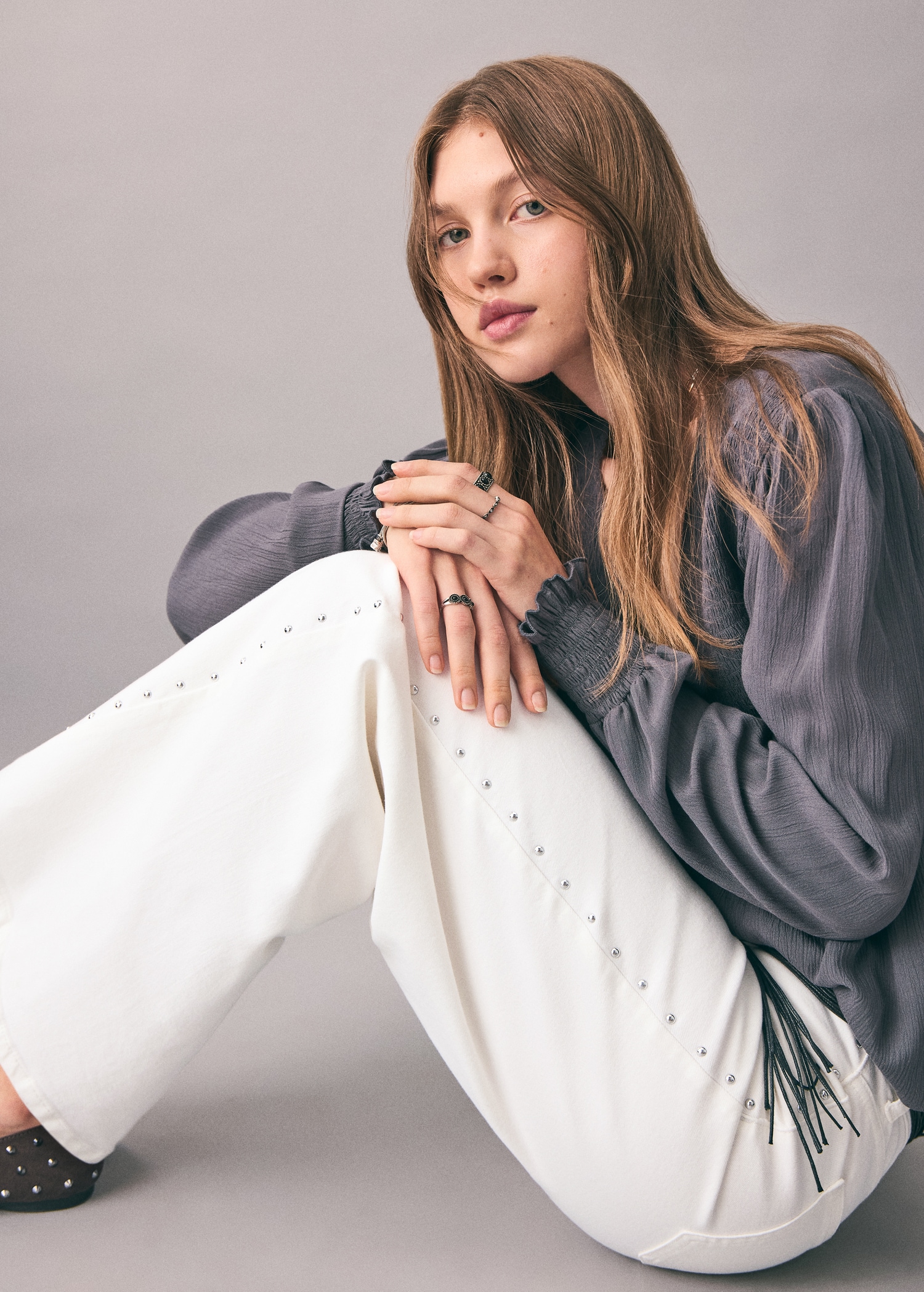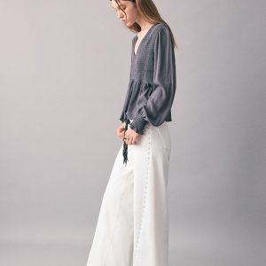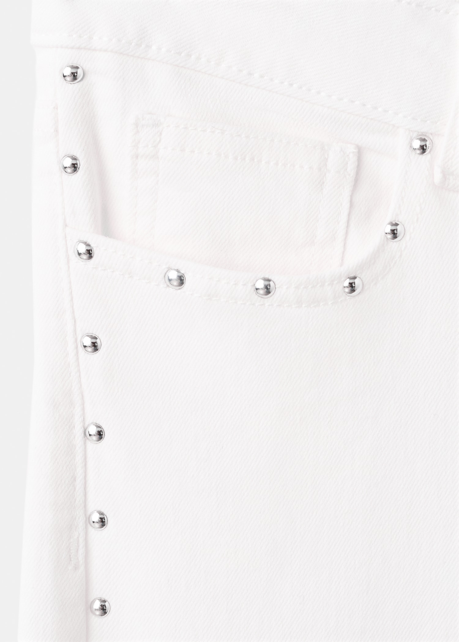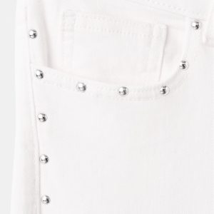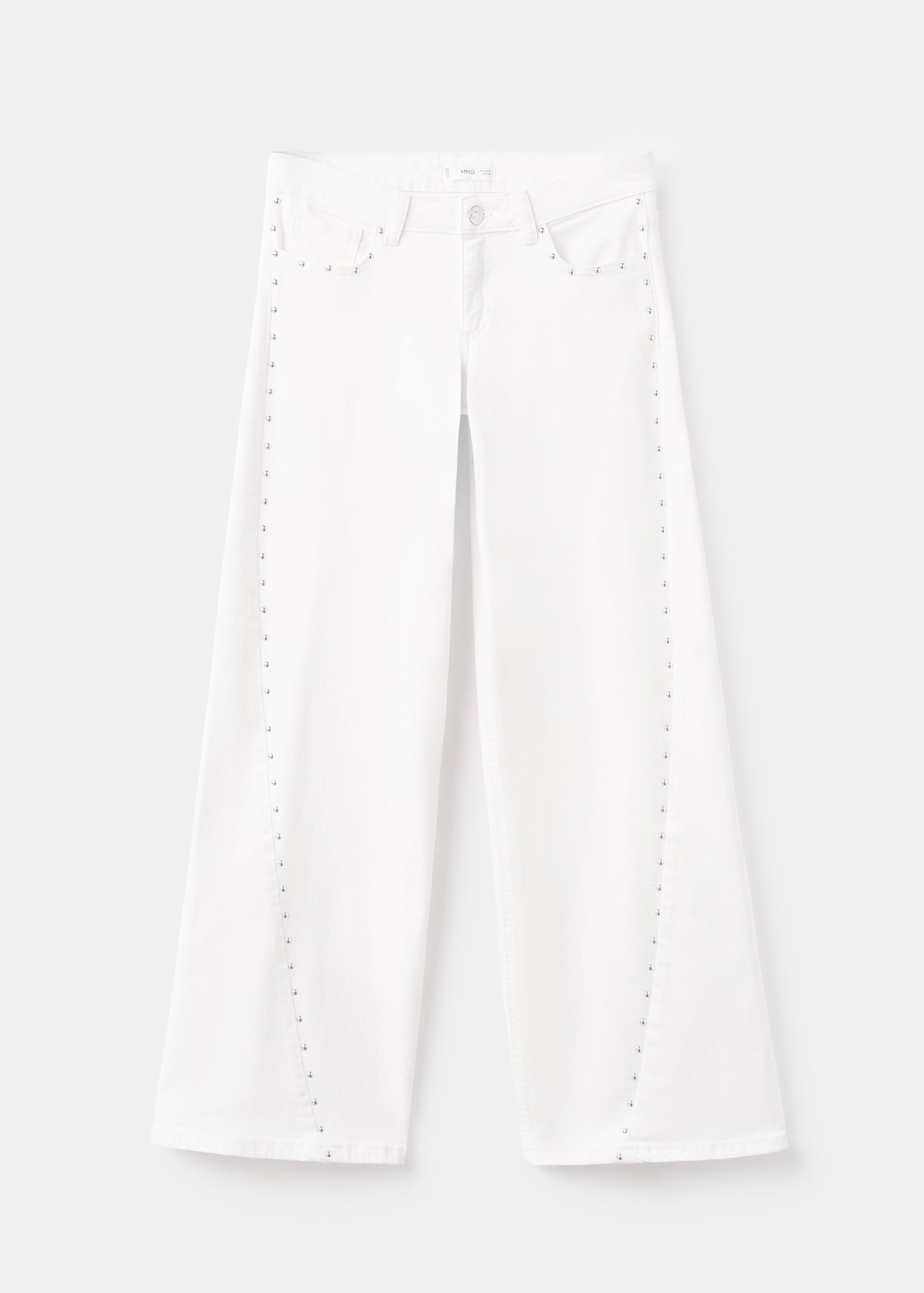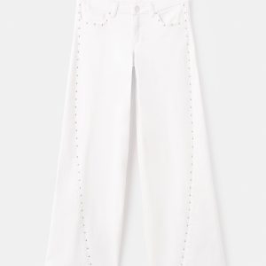 Cotton fabric. Stretch fabric. Long design. Wide-leg design. Low Waist Rise. Belt loops. Coin pocket. Two side pockets. Button and zipper closure. Two patch pockets at the back. Studded detail