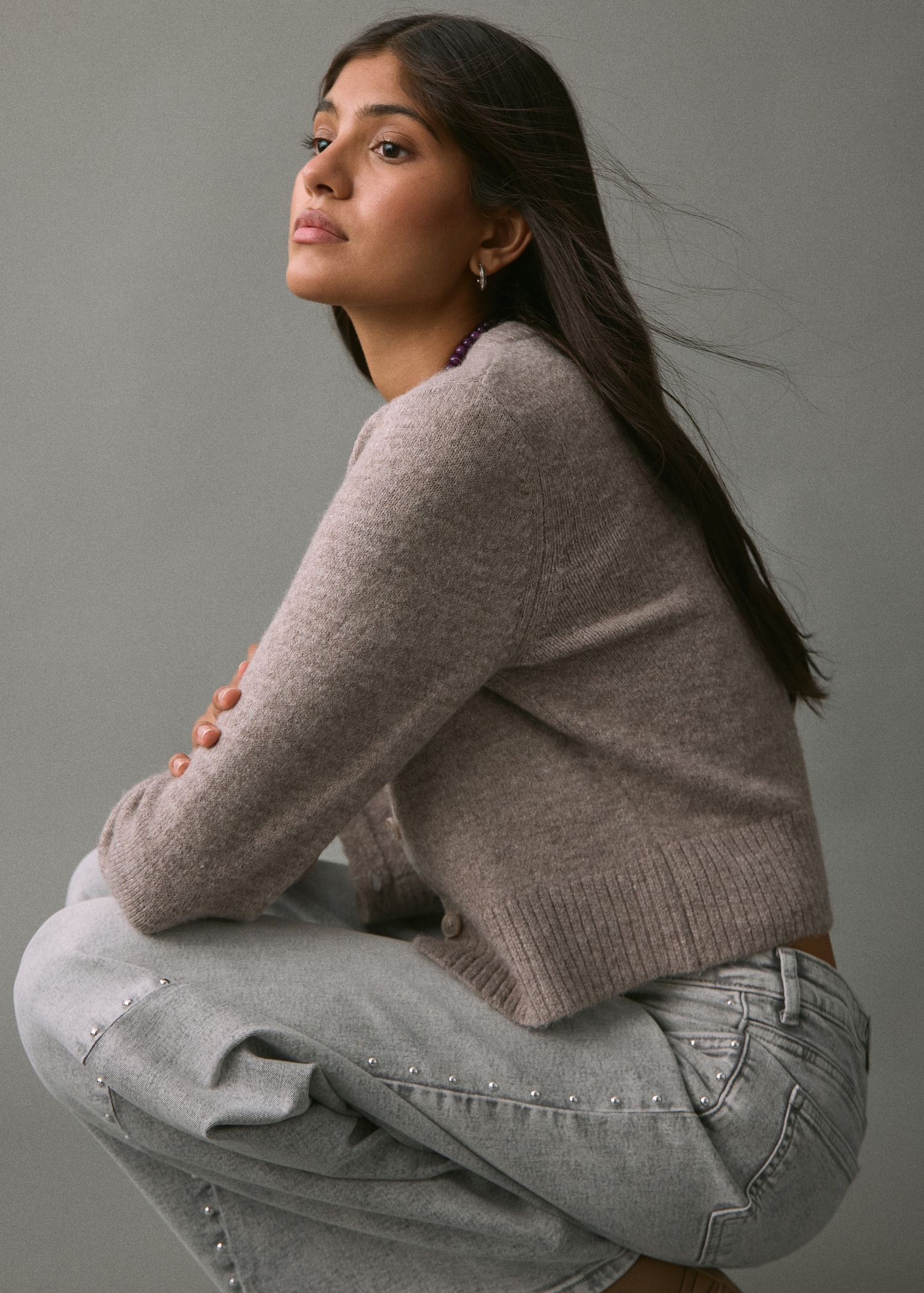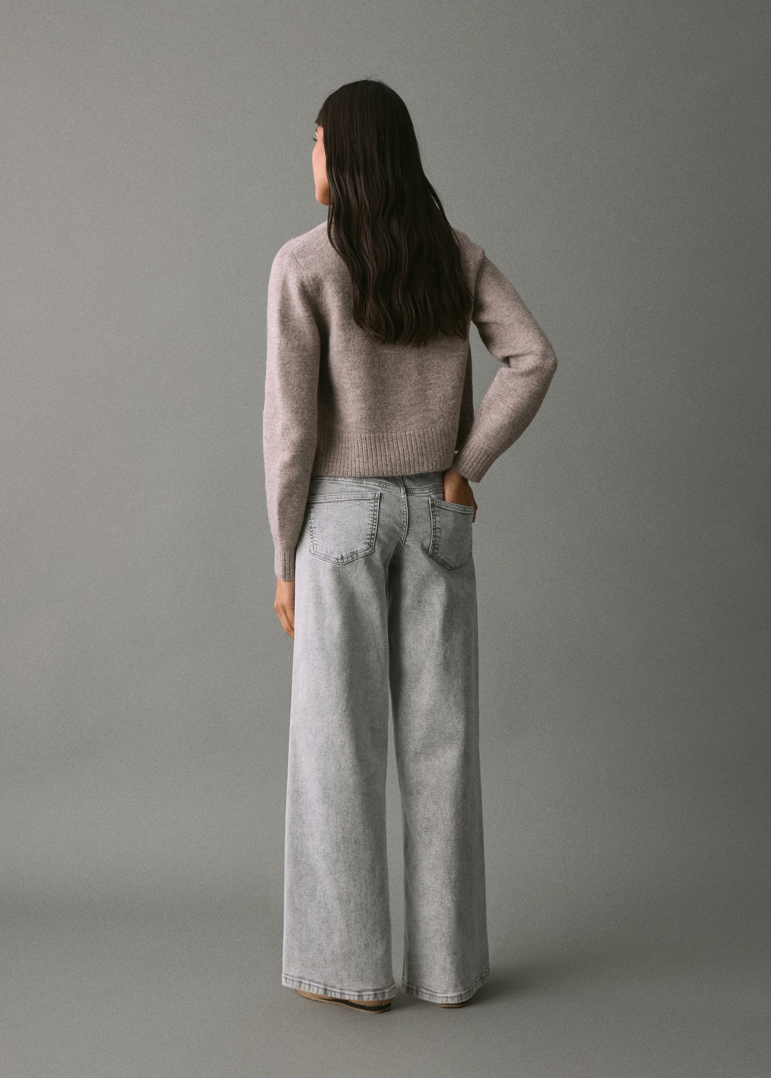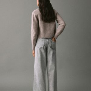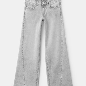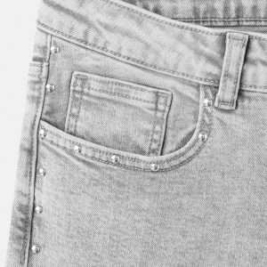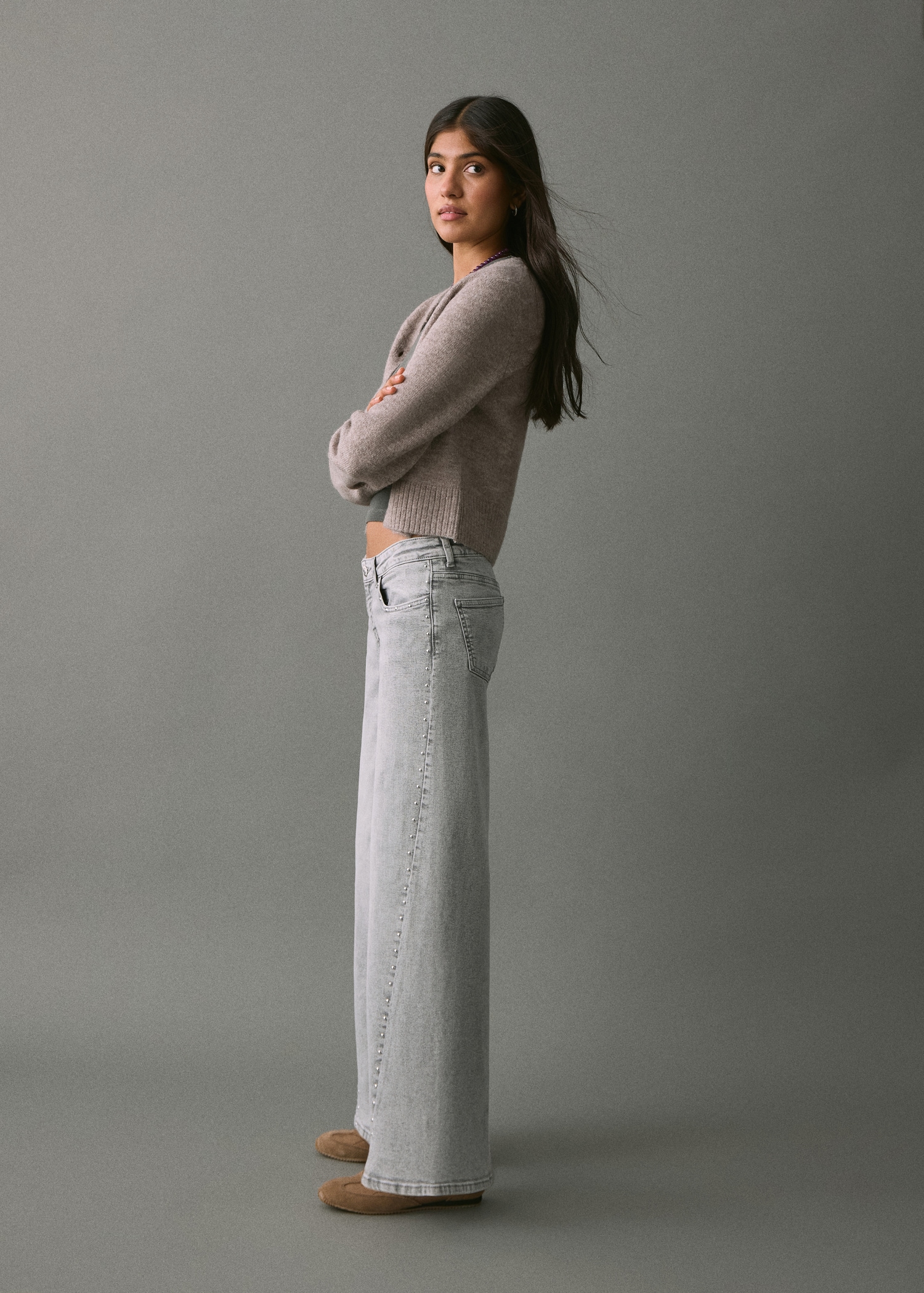Cotton fabric. Long design. Wide-leg design. Low Waist Rise. Belt loops. Two side pockets. Decorative studs. Two patch pockets at the back