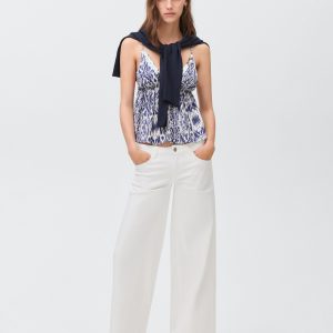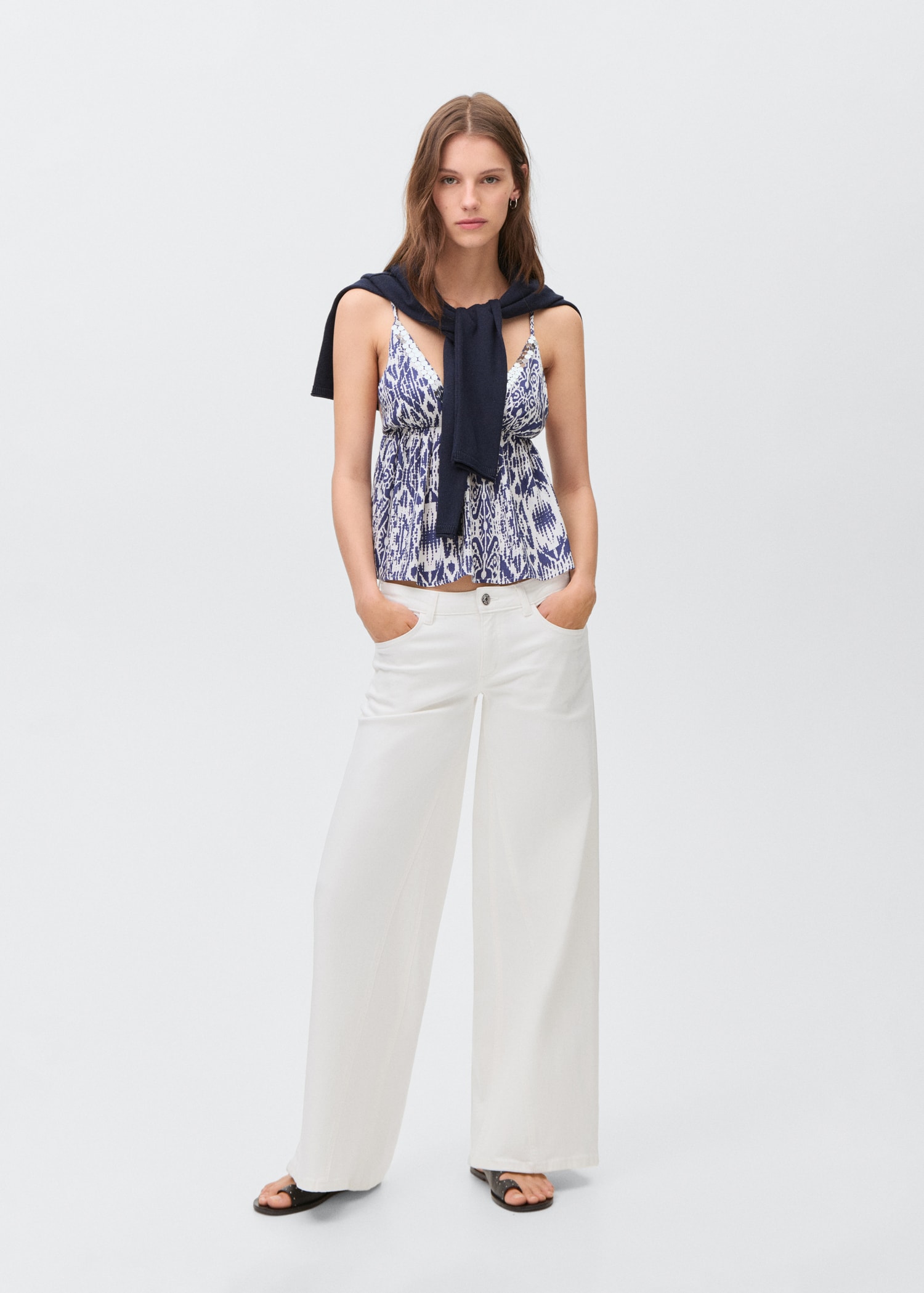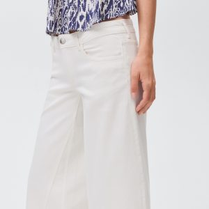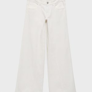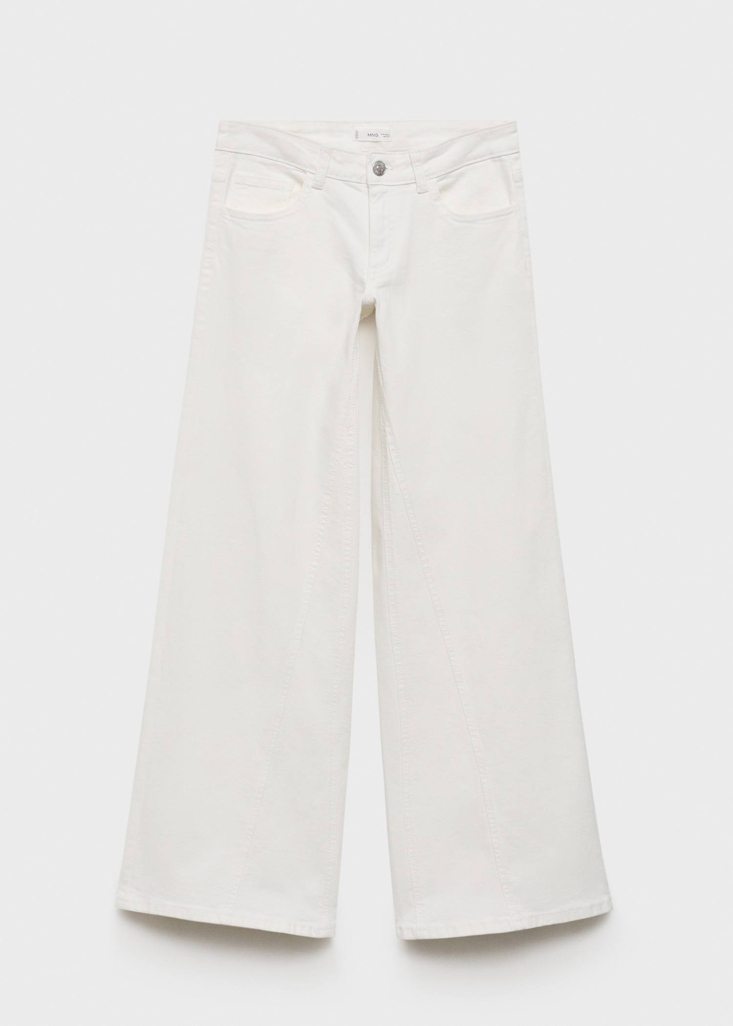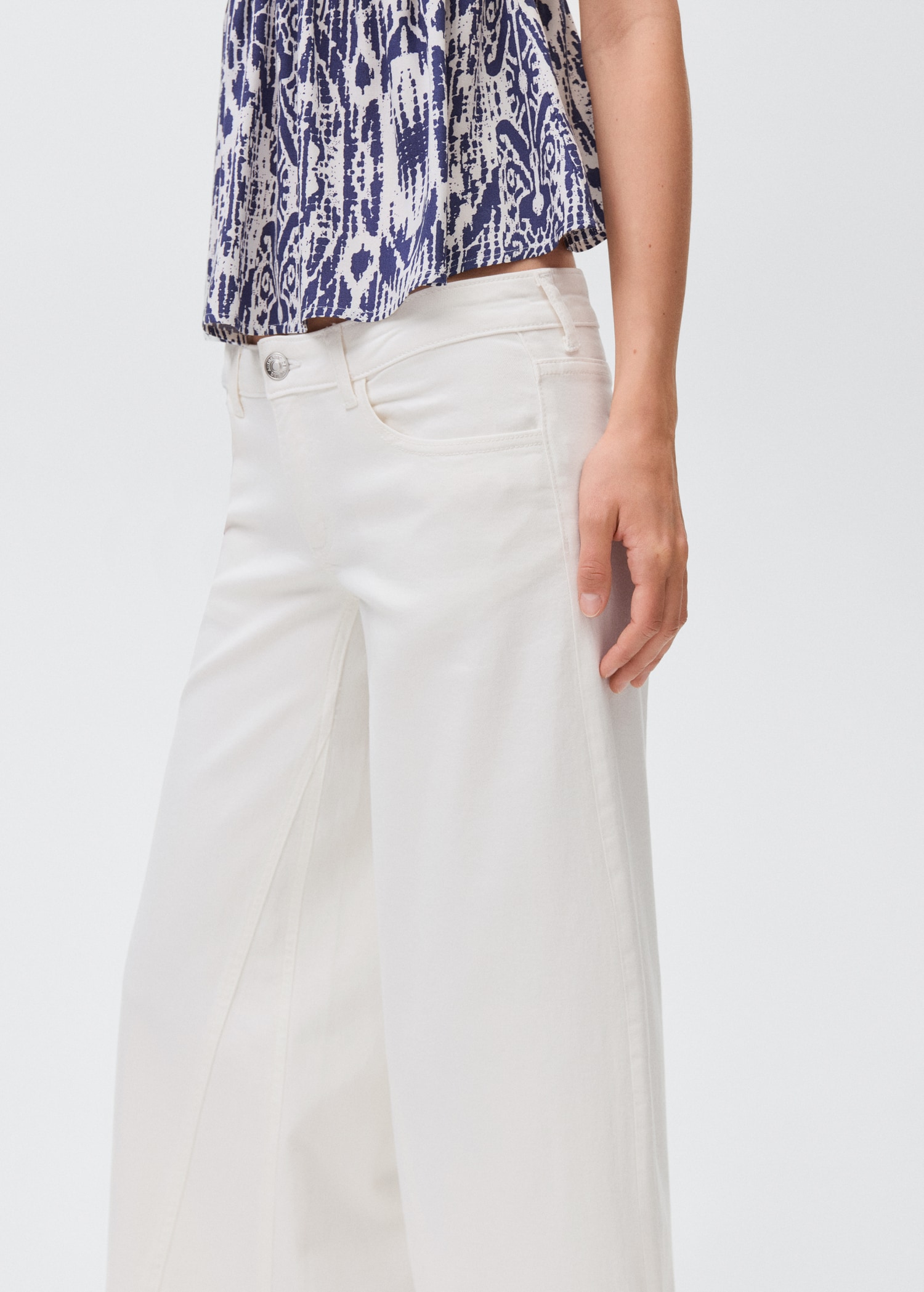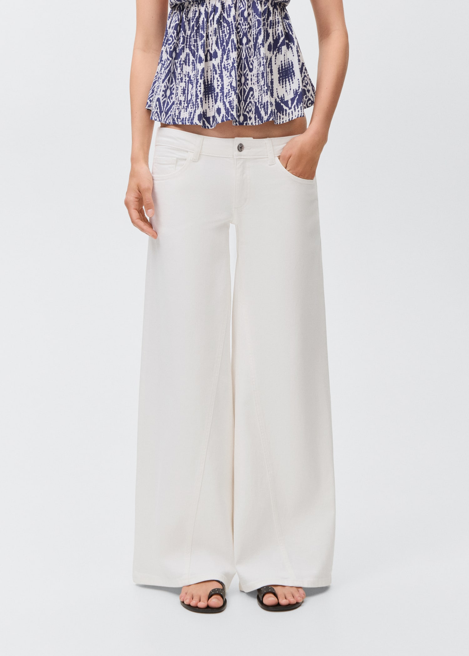 Stretch fabric. Cotton fabric. Long design. Wide-leg design. Low Waist Rise. Belt loops. Zip and button closure. Coin pocket. Two side pockets