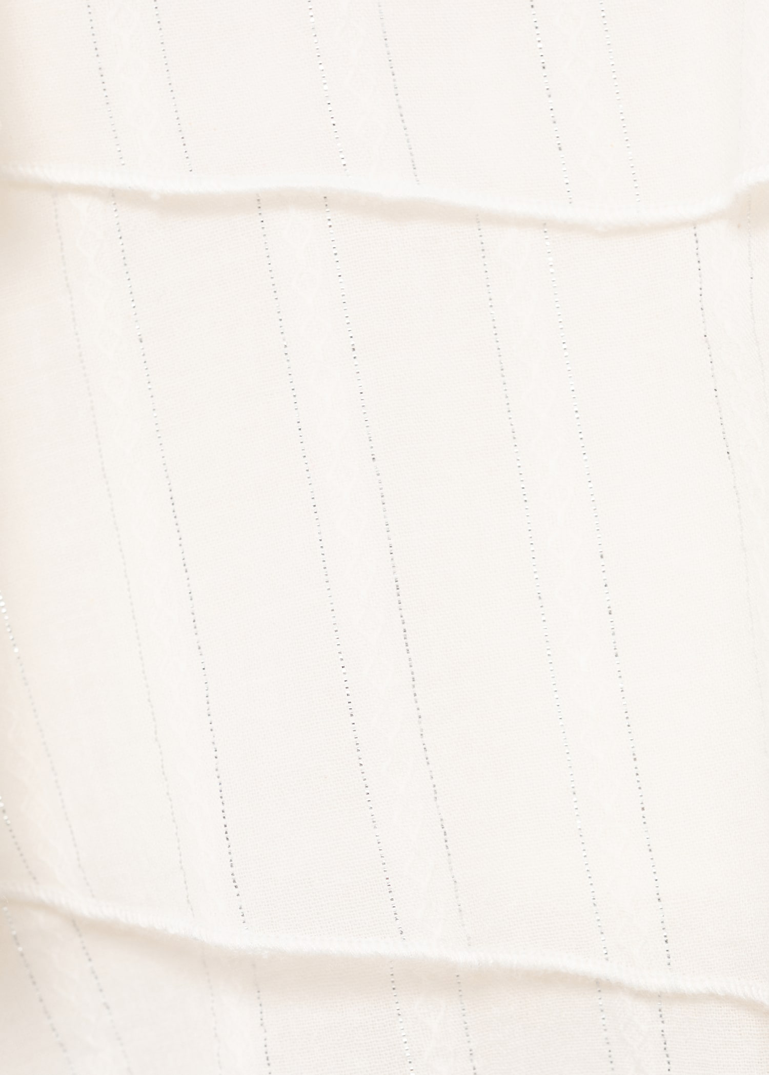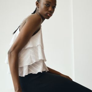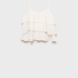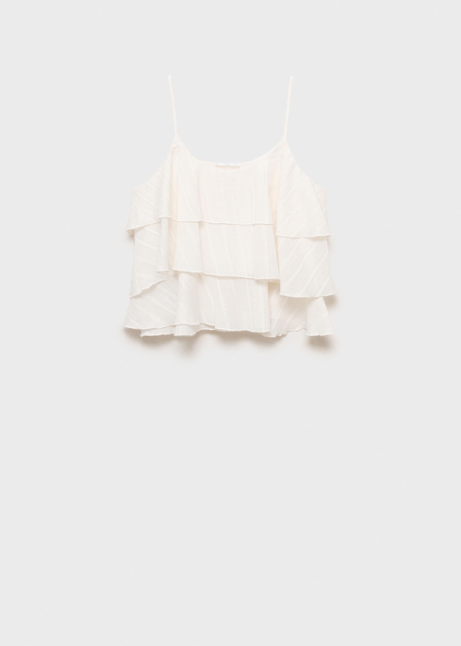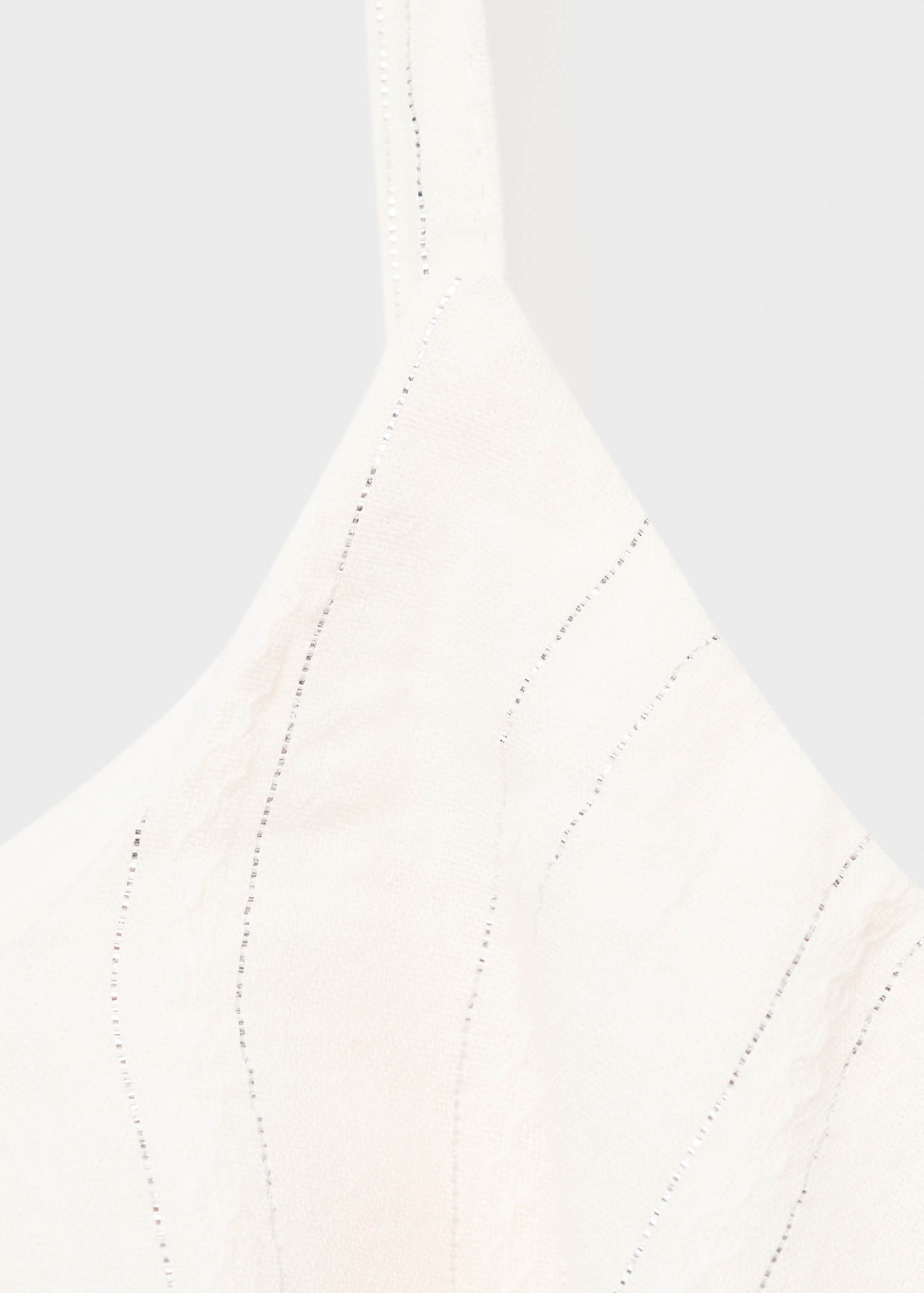 Cotton fabric. Short design. Ruffled design. Round neck. Thin straps. Lurex detail