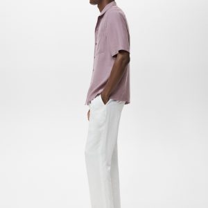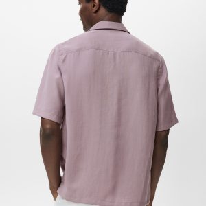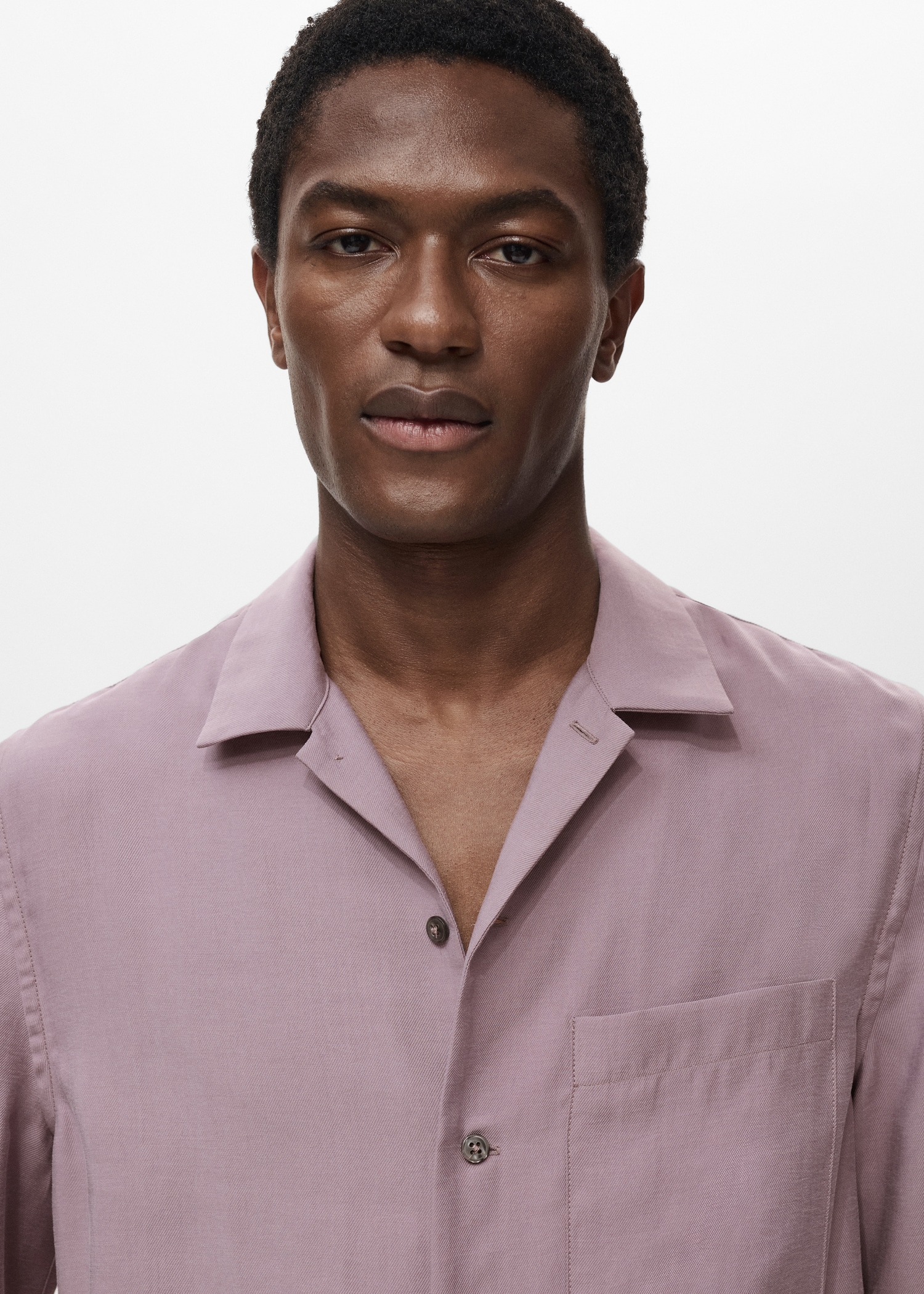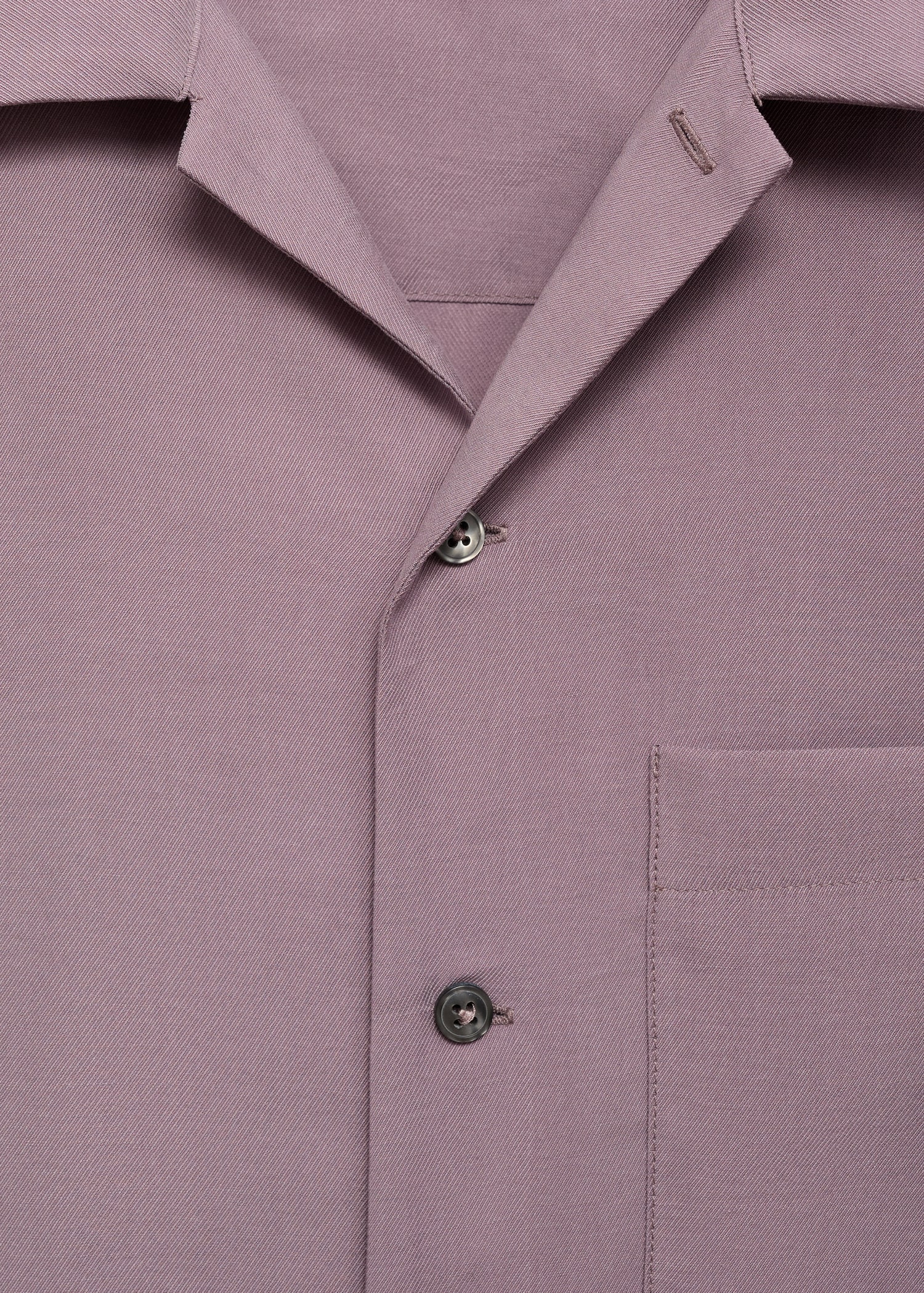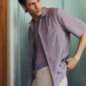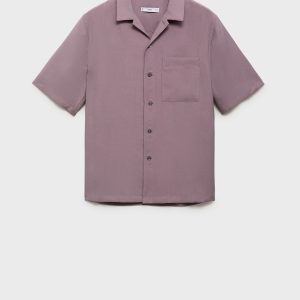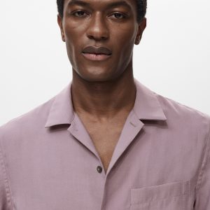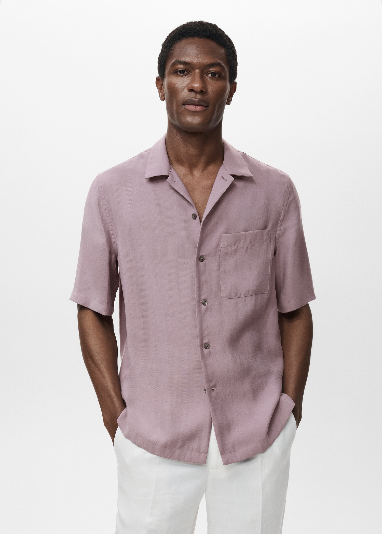 Lyocell fabric. Regular fit. Bowling collar. Patch pocket on the chest. Button closure at the front. Short sleeves