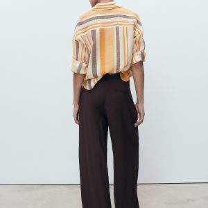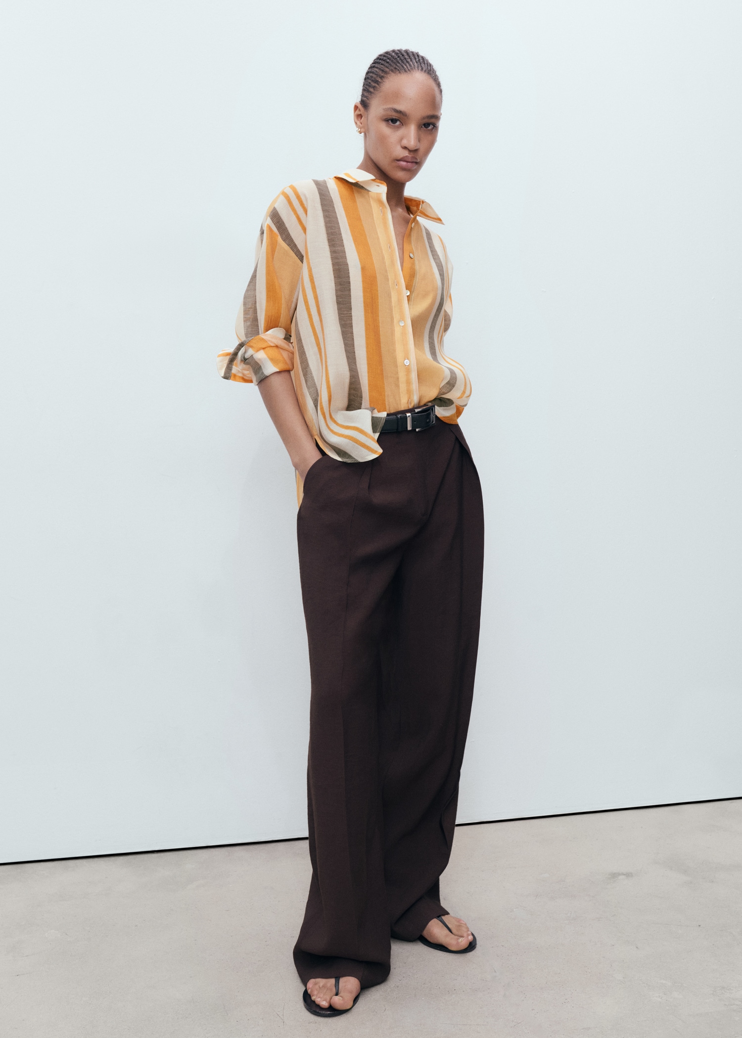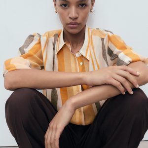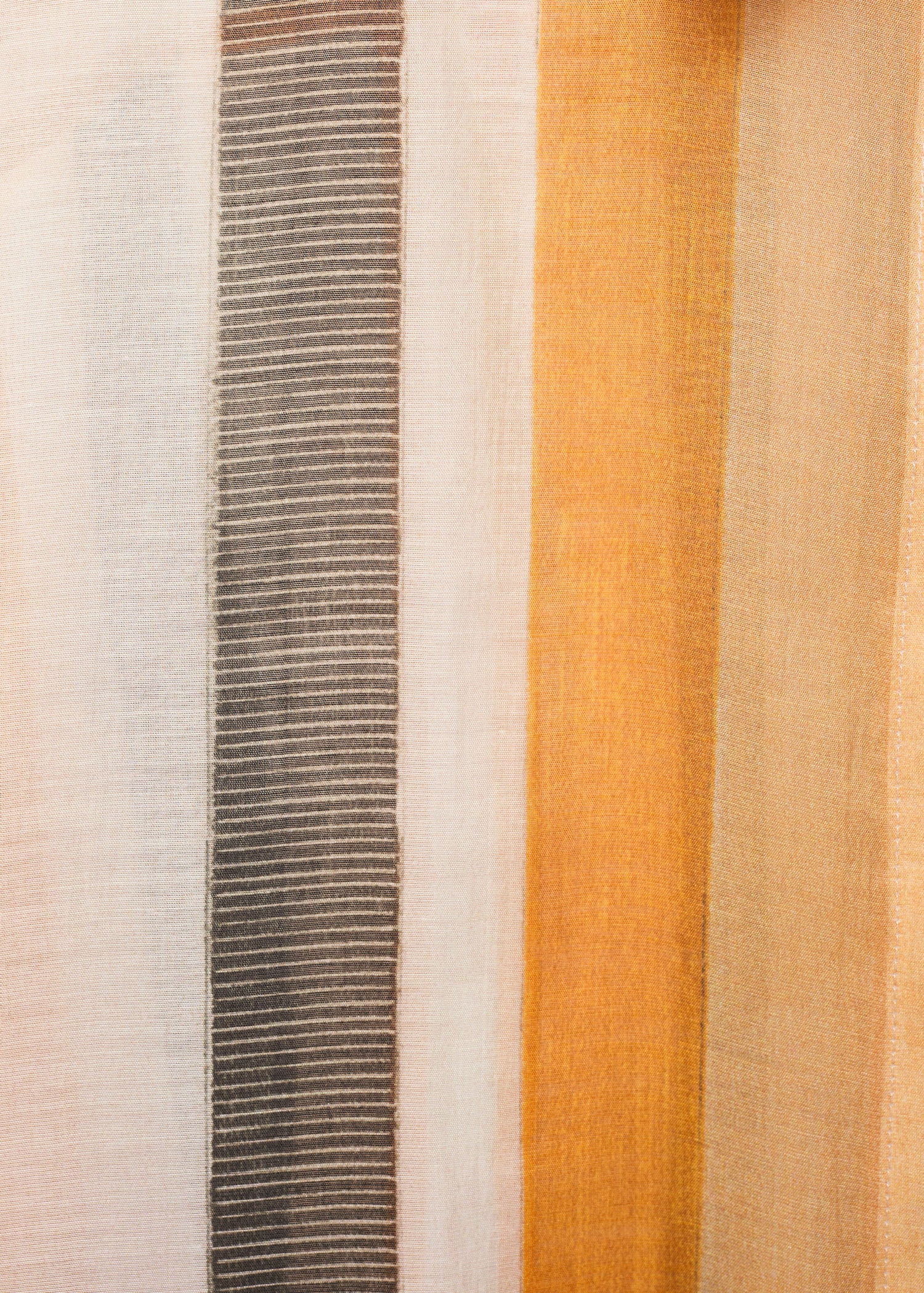Crafted from lyocell fabric, this garment features a straight design with a multi-colored stripe pattern. It includes a shirt collar and long sleeves with buttoned cuffs. The front fastening is with buttons