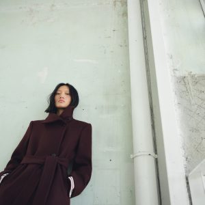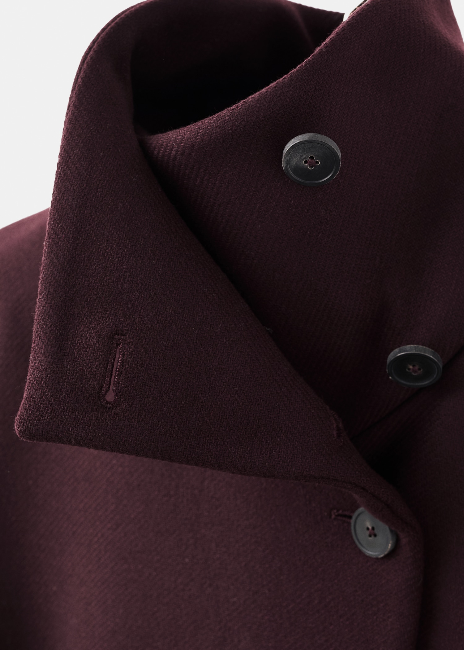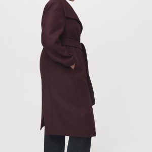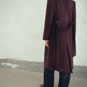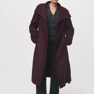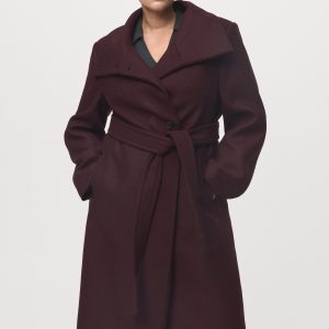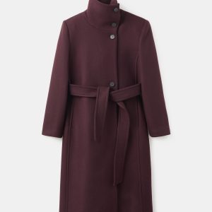 Crafted from virgin wool fabric by Manteco, this long, straight design features a funnel neck with a button fastening. It has long sleeves, belt loops, and a robe-style belt. Front button closure and inner lining. Available in Plus Size