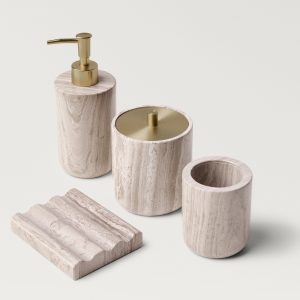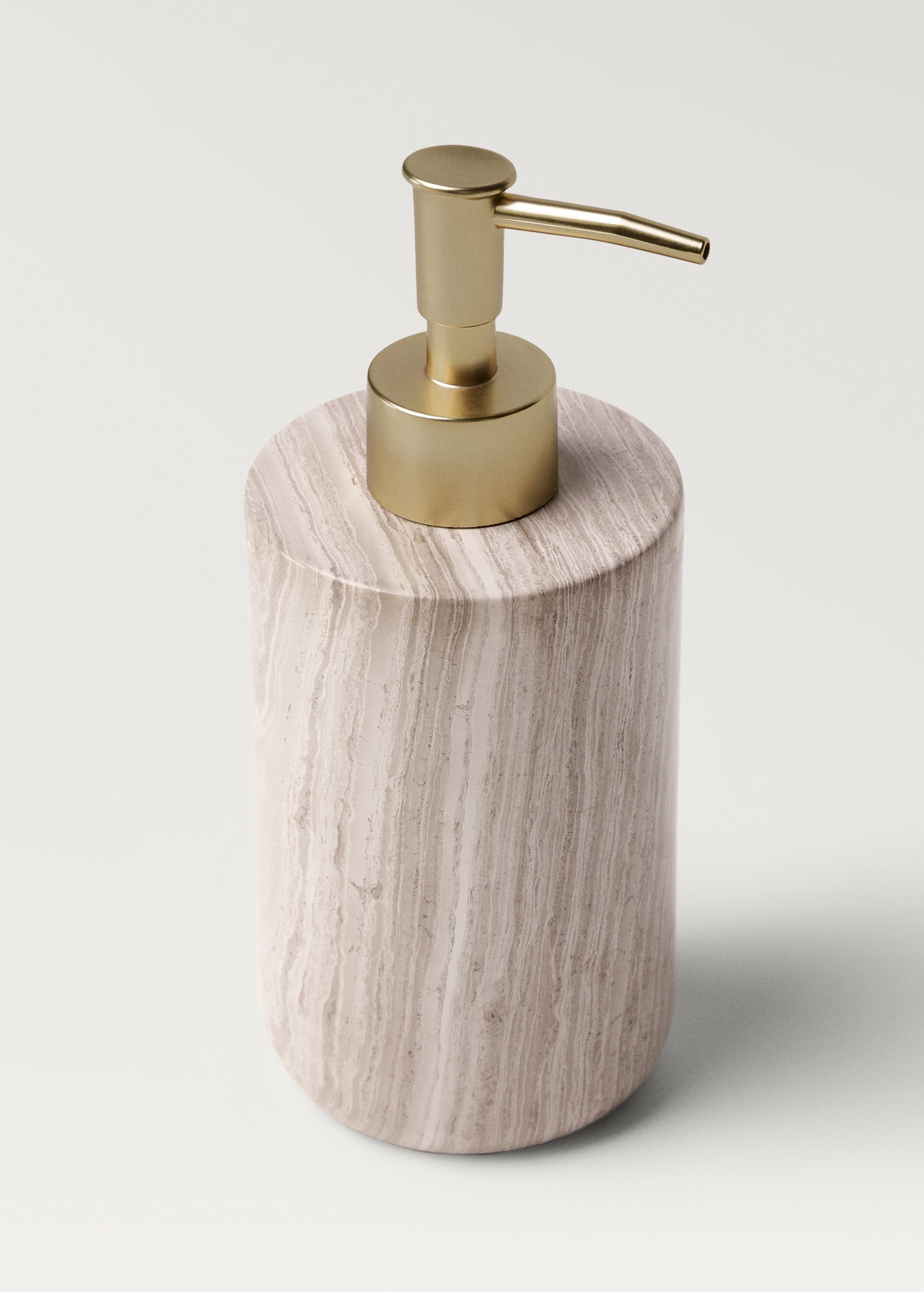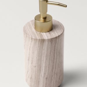 Dispenser. Capacity: 150 ml. 85% marble. High-quality and durable materials. Gold detail design. Cylindrical shape. Coordinates with more products from the collection. 2.76×7.09×2.76 in (Length x Height x Width)