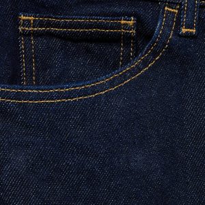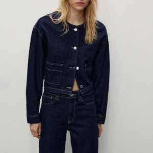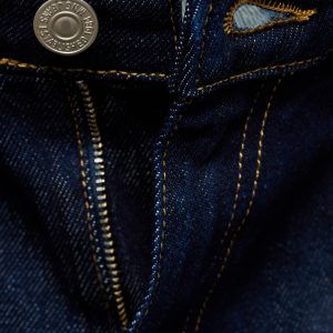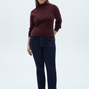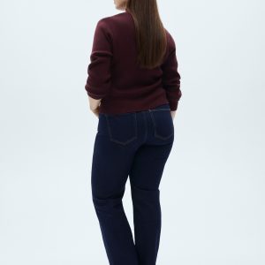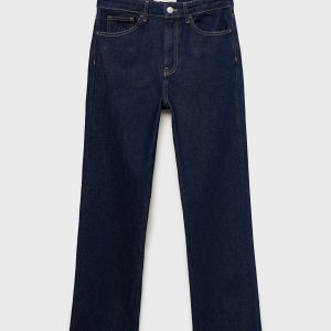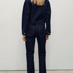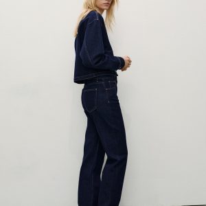 Recycled cotton-blend fabric. Cotton denim fabric. Rinse wash. Straight Design. Long design. Standard design. Mid-rise. Five pockets. Front zipper and button closure. Belt loops. Two side pockets. Two patch pockets at the back. Zip and button closure. Inseam 30.71 in. Full length. Available Plus