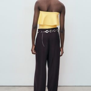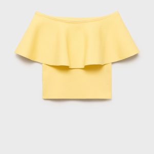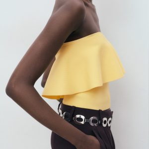 Crafted from fine-knit fabric, this fitted cropped design features a strapless bandeau style. It stands out with its maxi ruffle, offering a modern and elegant look