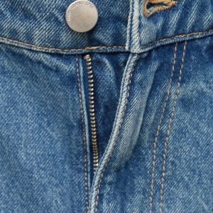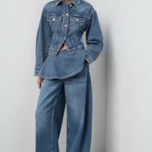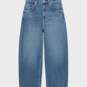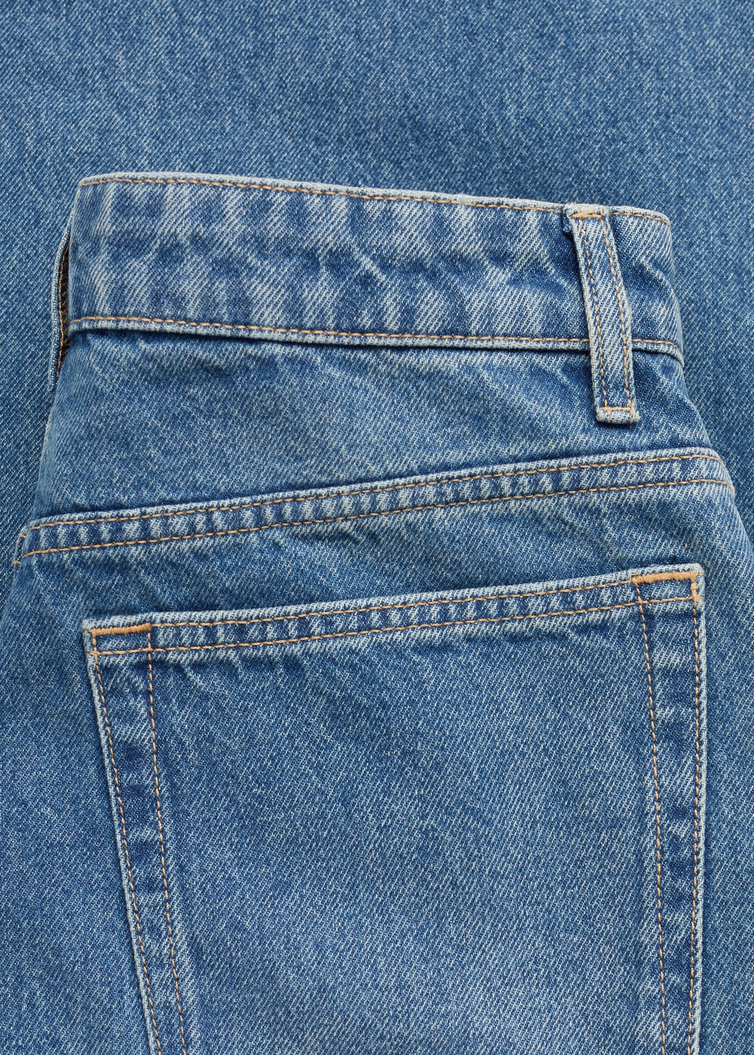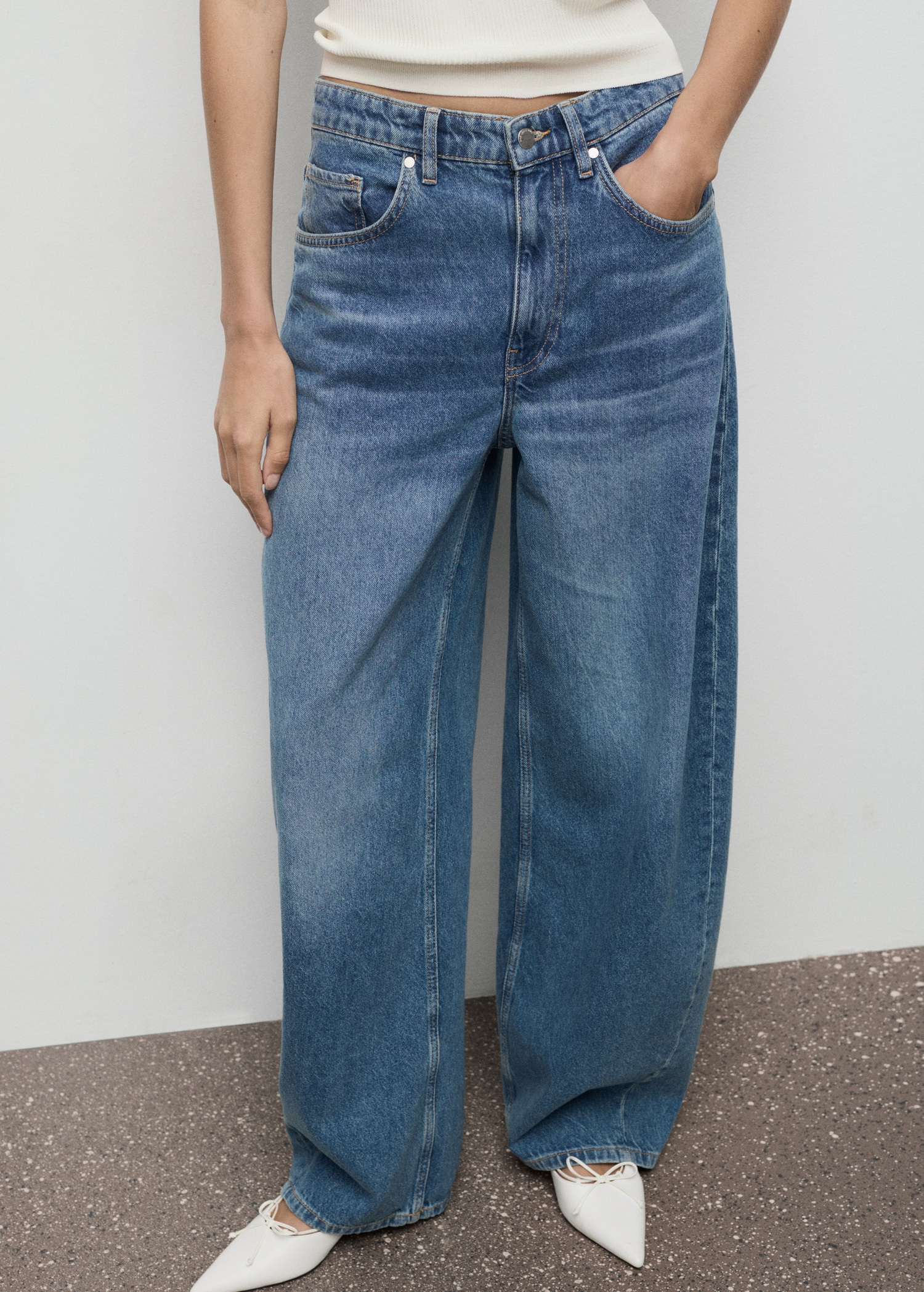 Cotton denim fabric. Long design. Balloon design. Mid-rise. Belt loops. Five pockets. Button and zipper closure. Inside length 31.1 in