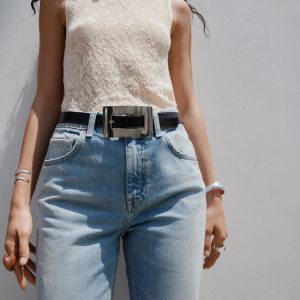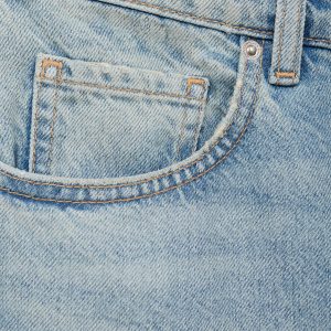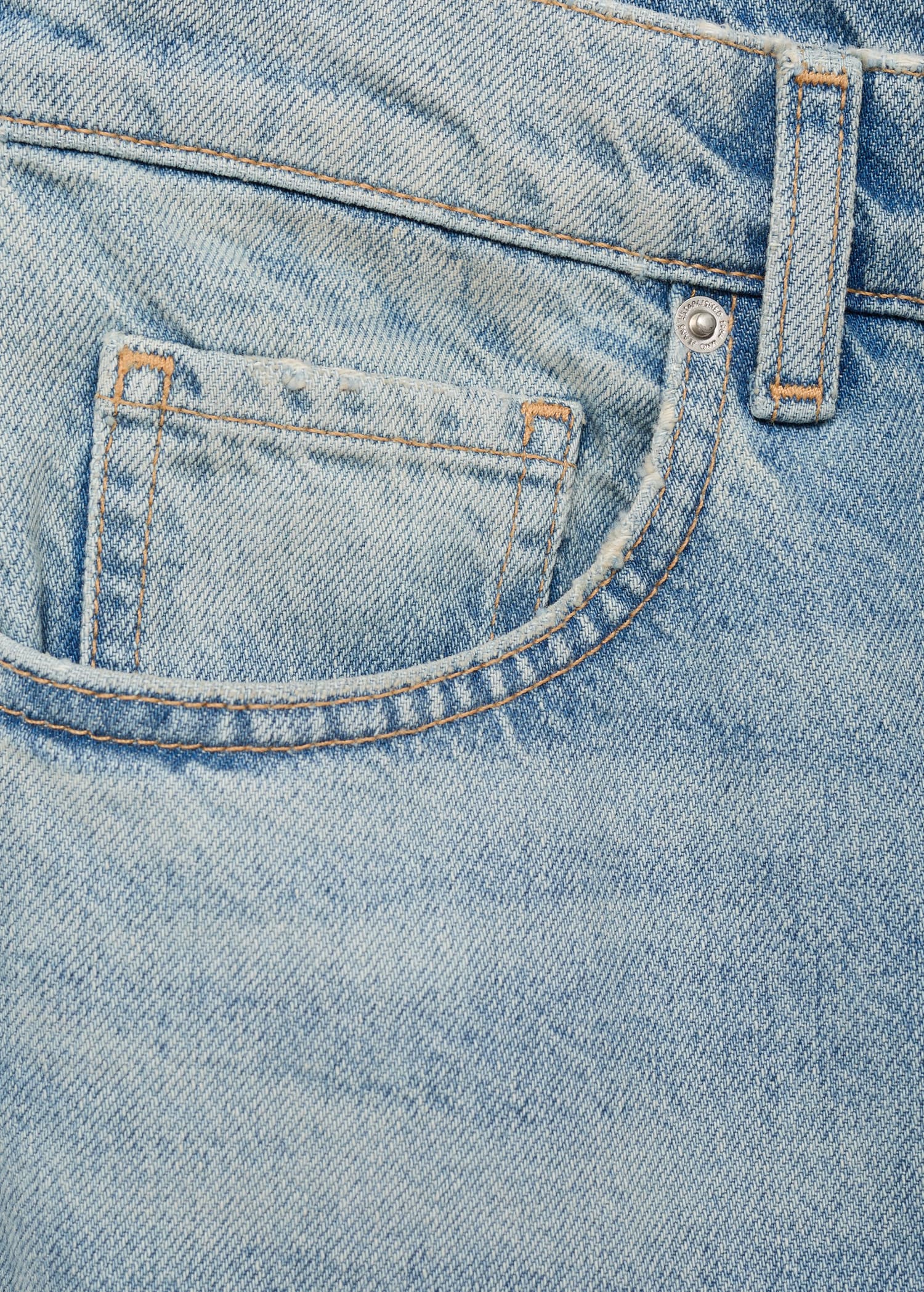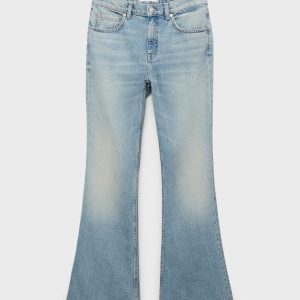 Cotton denim fabric. Long design. Flare design. Mid-rise. Belt loops. Five pockets. Button and zipper closure. Inside length 31.1 in