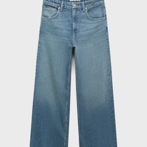 Cotton denim fabric. Long design. Straight Design. Mid-rise. Belt loops. Five pockets. Button and zipper closure. Inside length 31.1 in