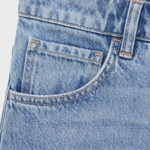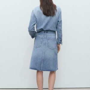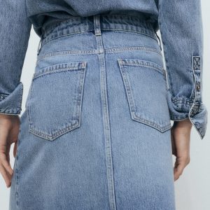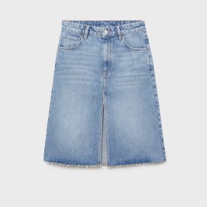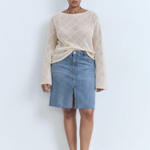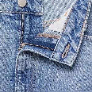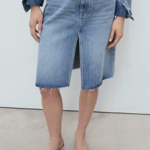 Cotton denim fabric. Midi design. Straight Design. Mid-rise. Belt loops. Five pockets. Front zipper and button closure. Opening in the lower front. Available Plus