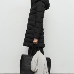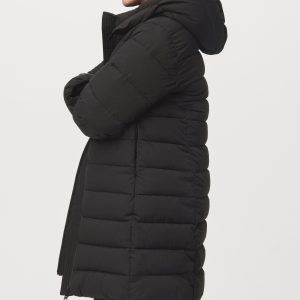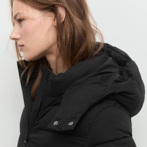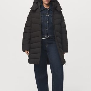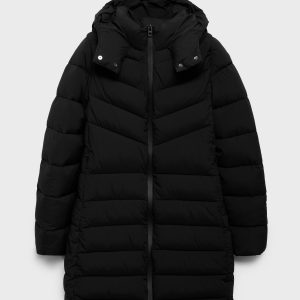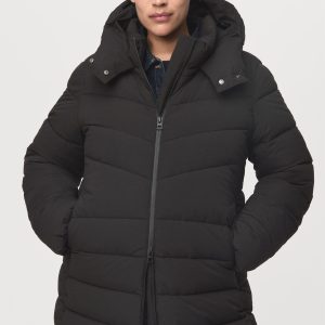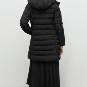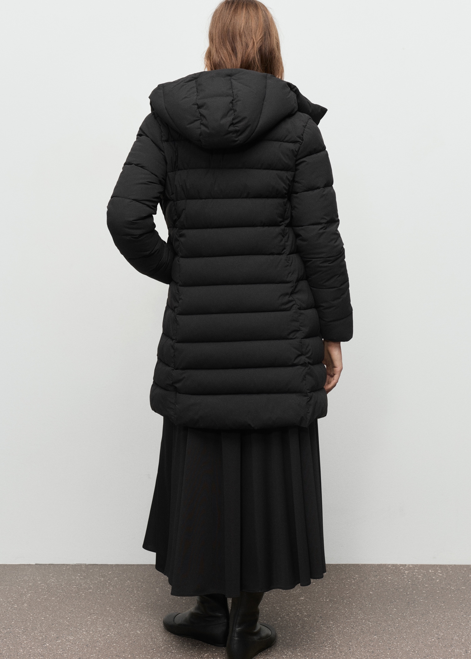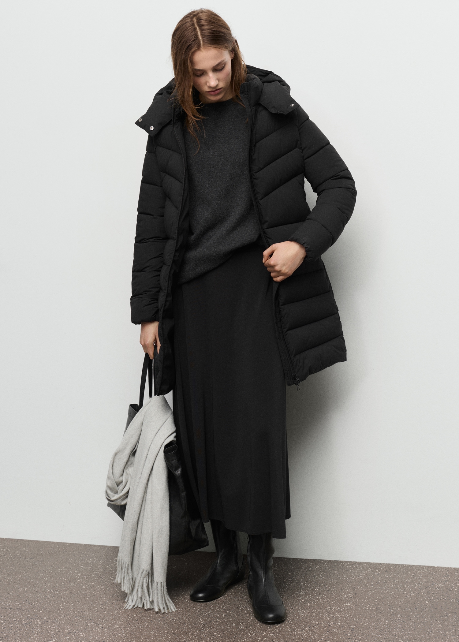 Quilted design. Tailored Design. Midi design. With hood. Long sleeves with elastic cuffs. Two side welt pockets. Two-way zip fastening. With filling. Inner lining. Available Plus. Water-repellent: The durable finish of this garment protects against light rain, repelling contact with water and raindrops