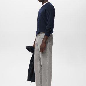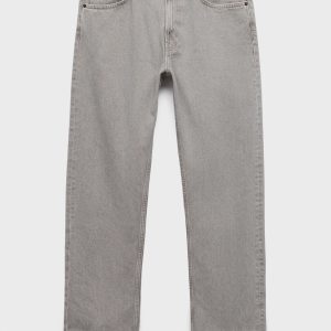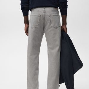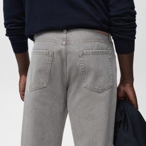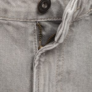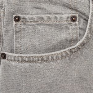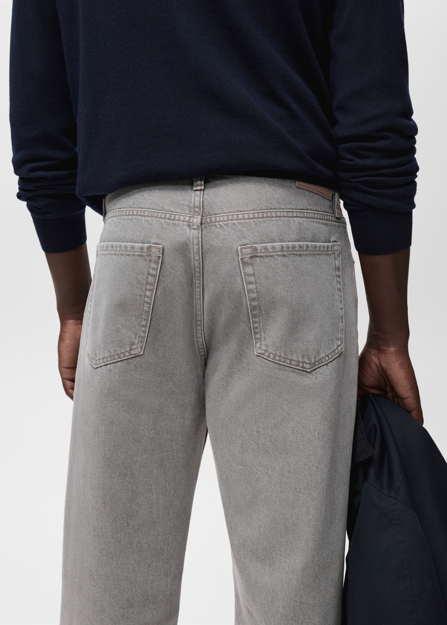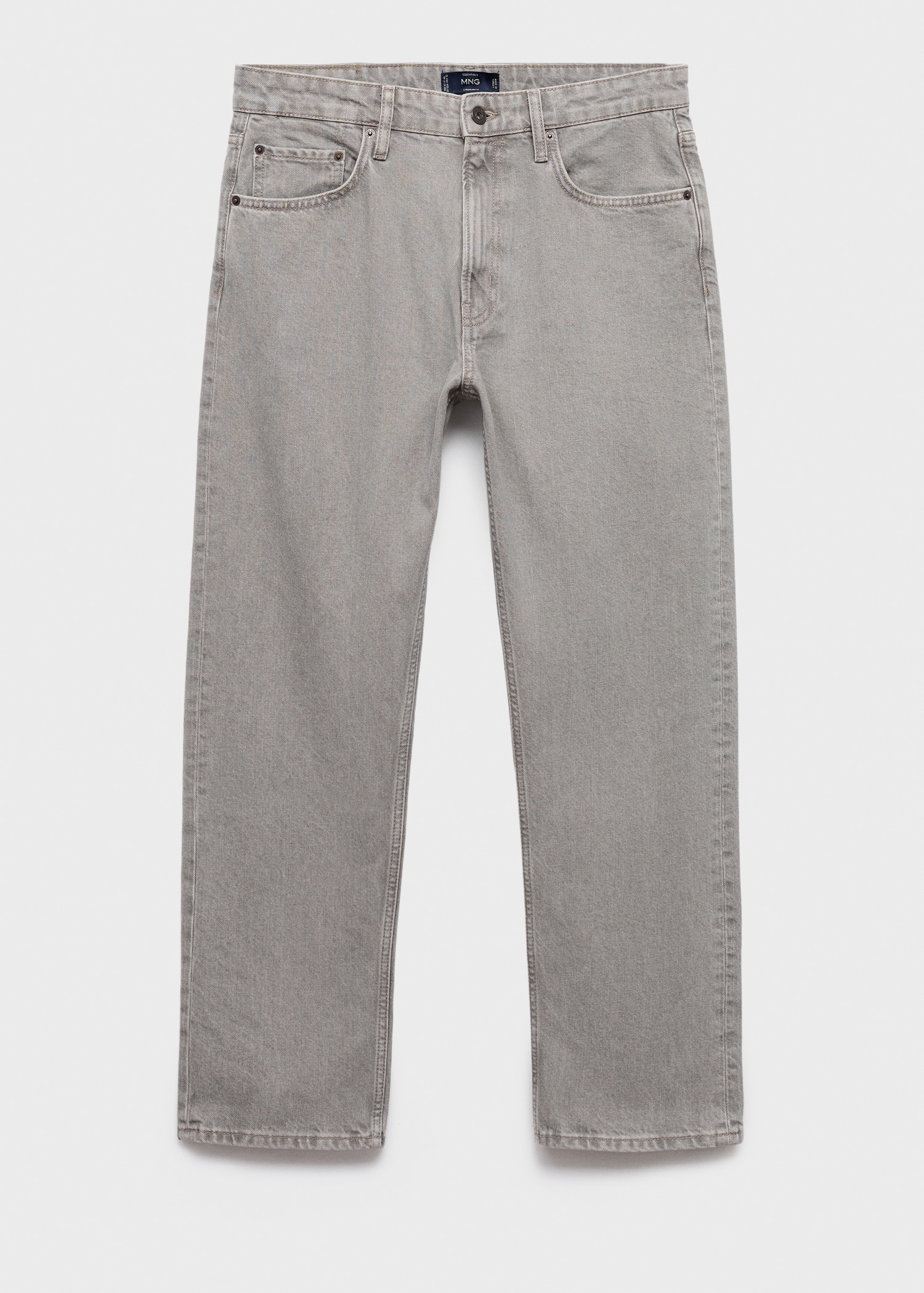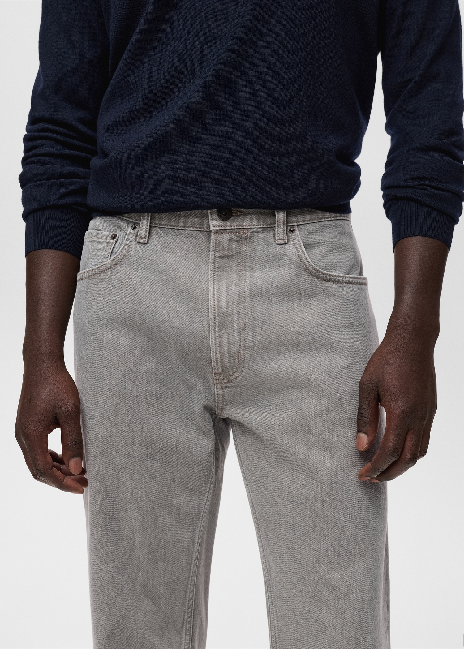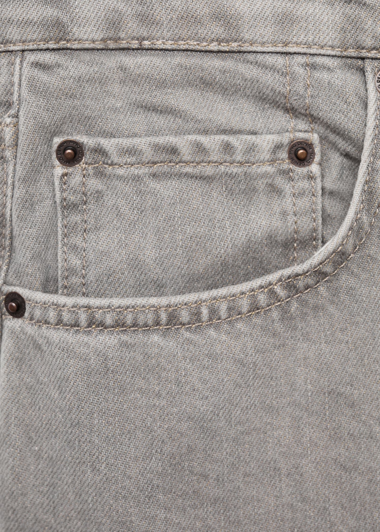 100% cotton fabric. Straight-fit. Light gray wash. Belt loops. Two front pockets. Coin pocket at hip height. Two patch pockets at the back. Front zipper and button closure