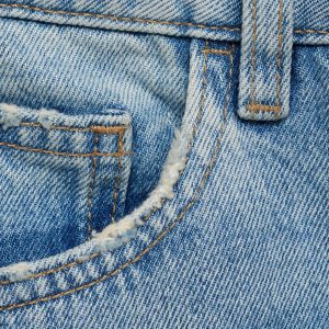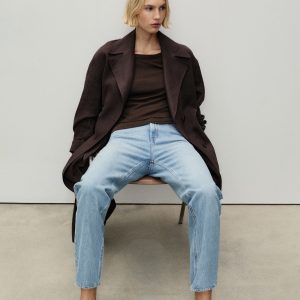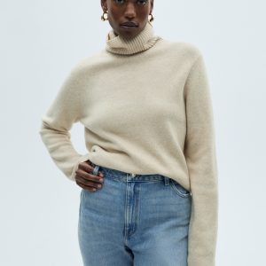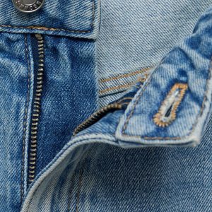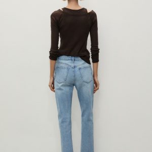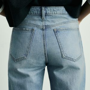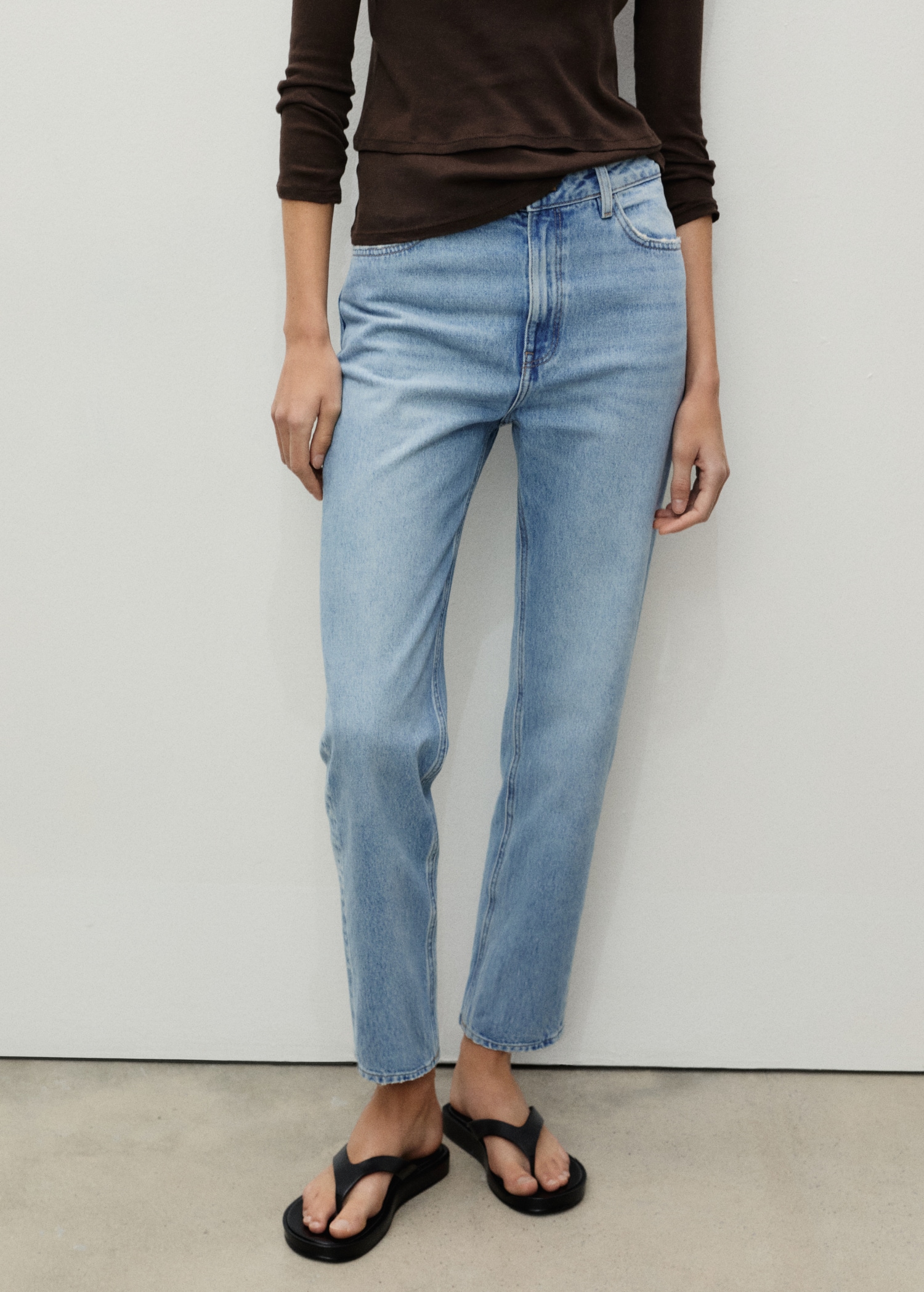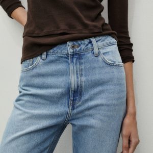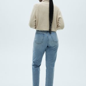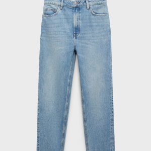 Cotton denim fabric. Mom-fit. High-rise. Belt loops. Five pockets. Front zipper and button closure. Available Plus. Inside length 27.2 in