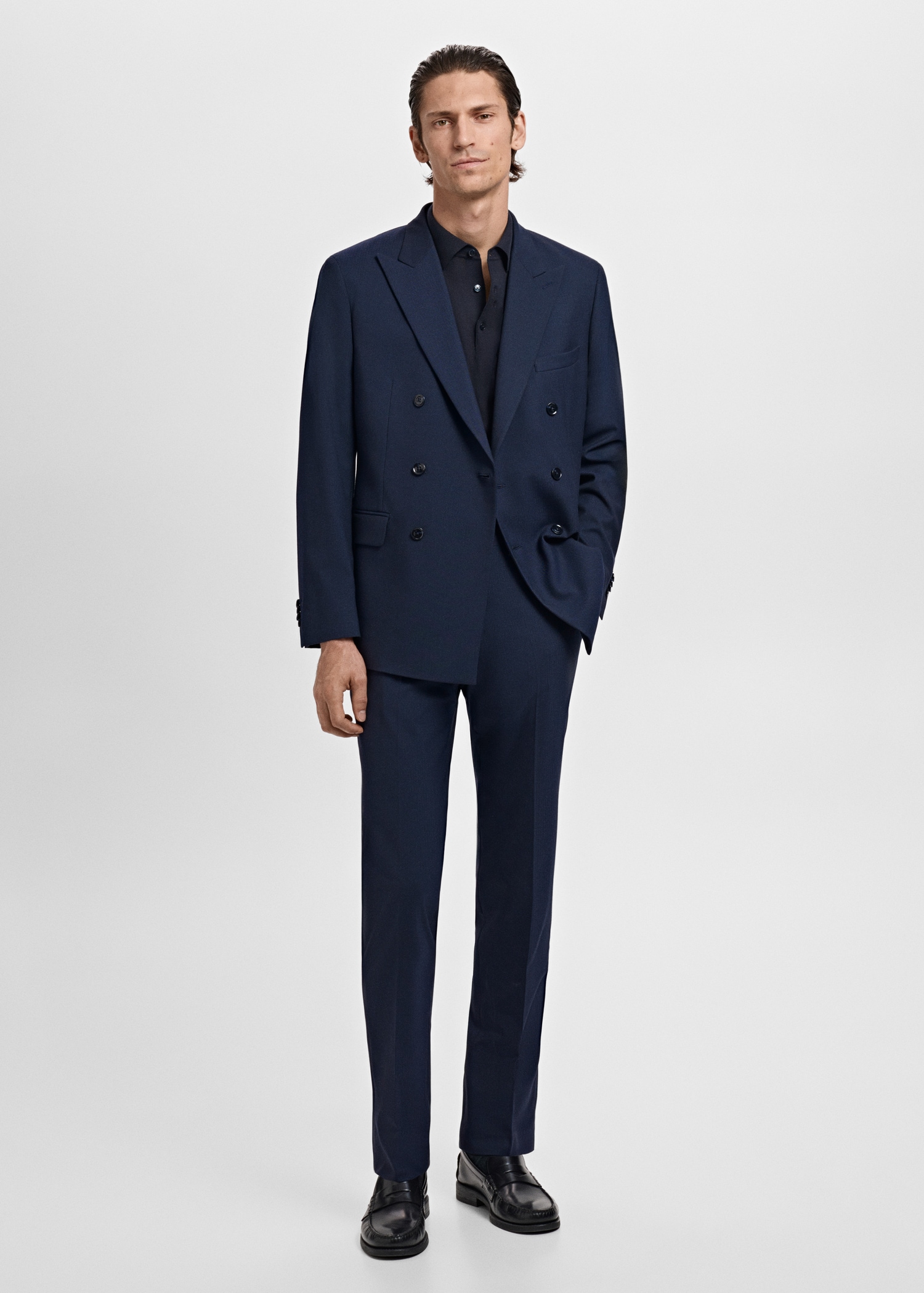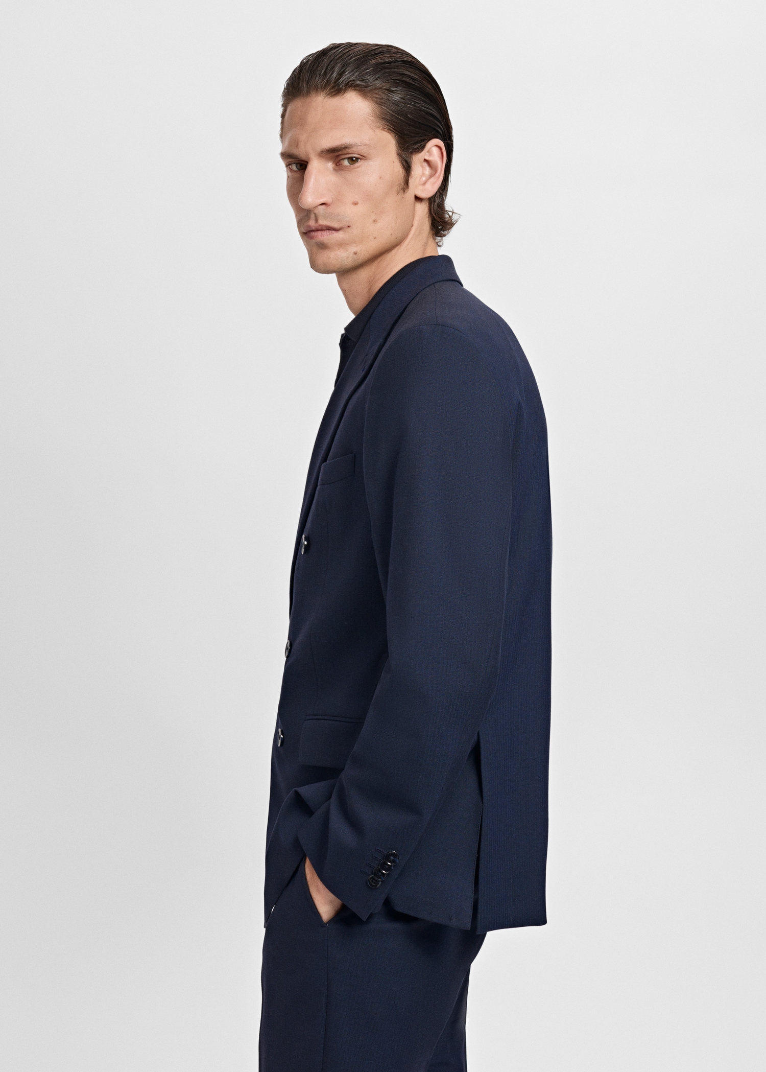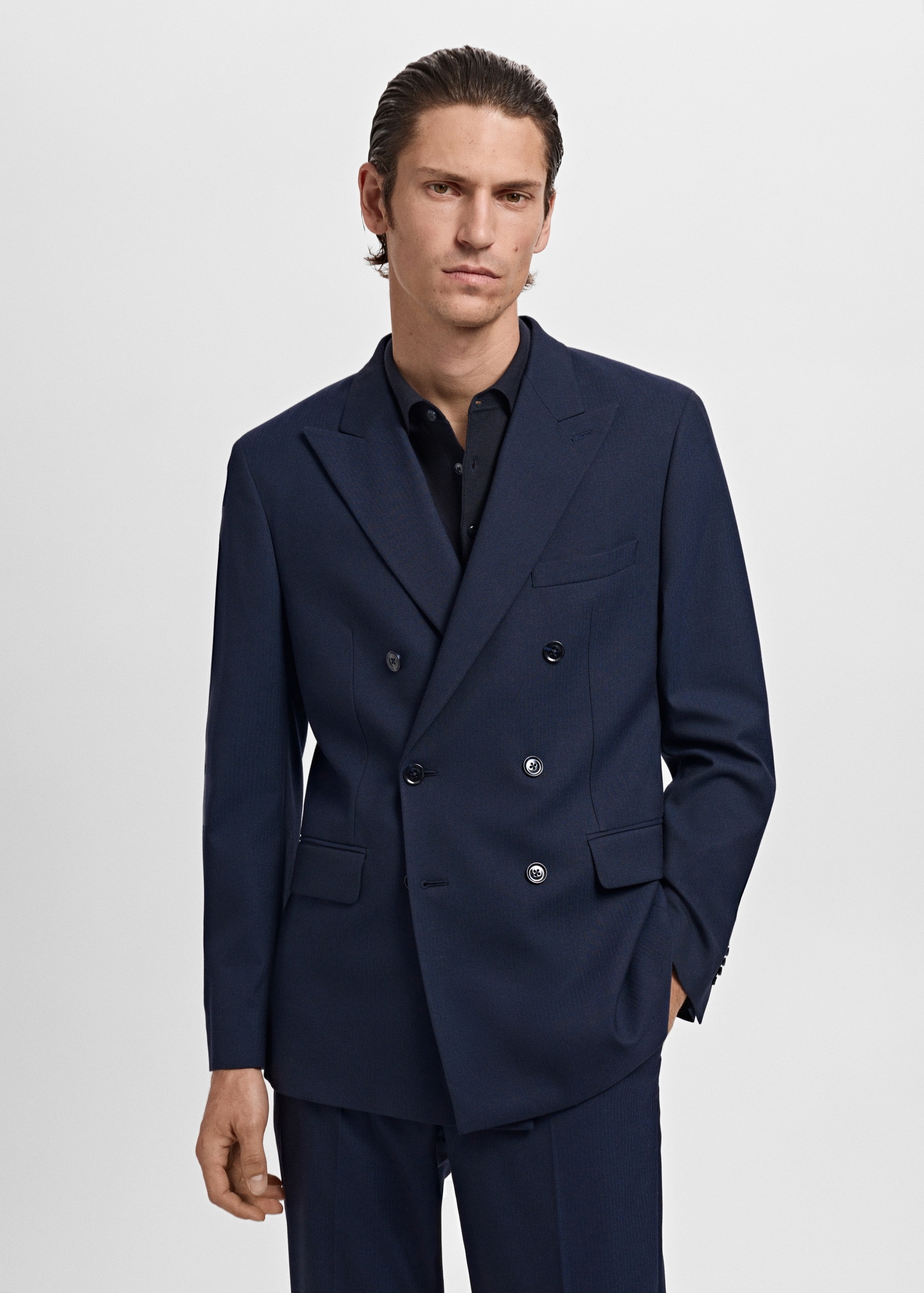 Slim fit. Tailoring collection. Notch lapels and buttonhole. Design with double-breasted front closure. Chest welt pocket. Two side flap welt pockets. Buttoned cuff straps. Side slit hem