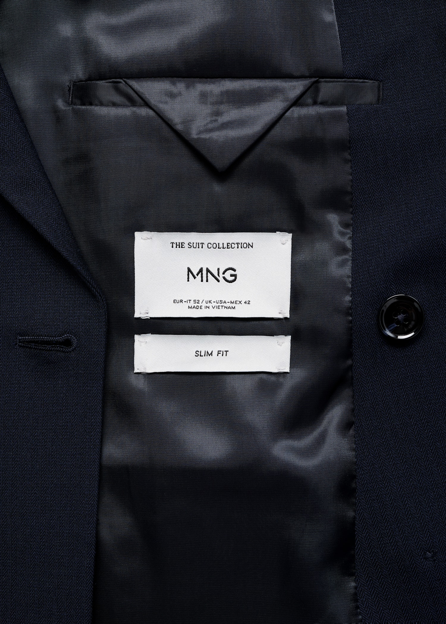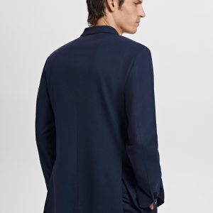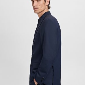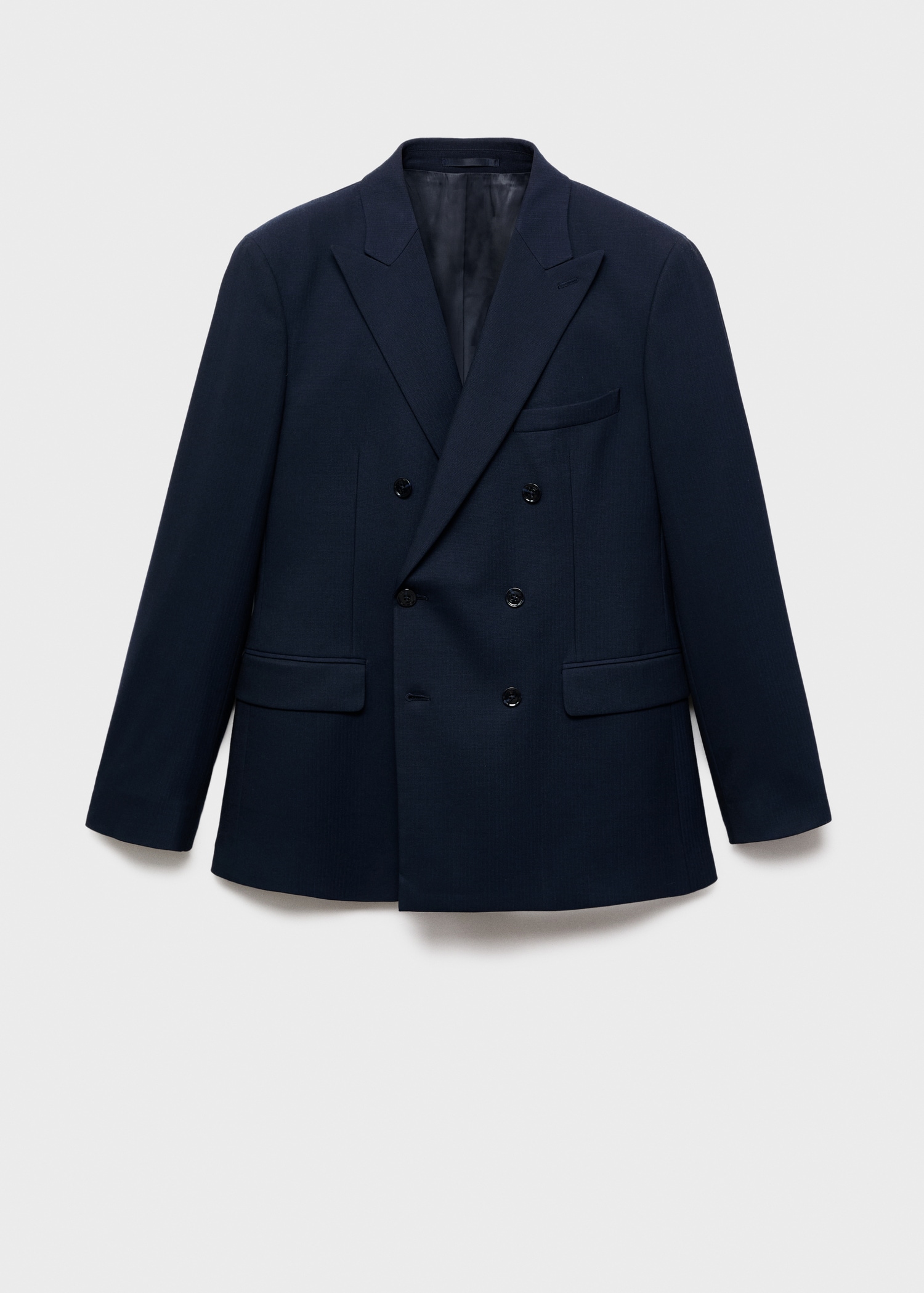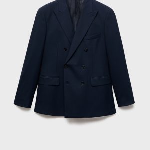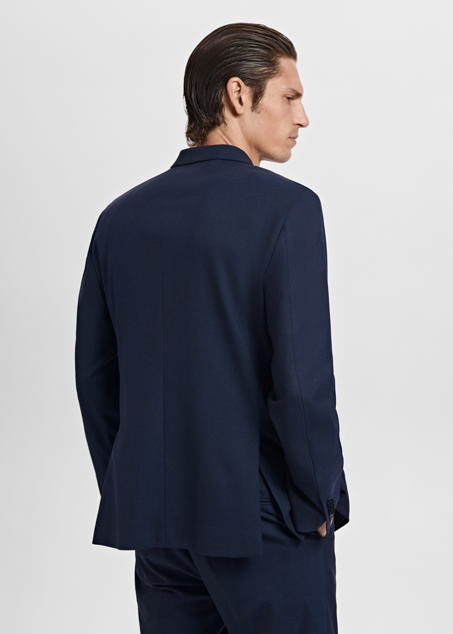 Slim fit. Tailoring collection. Notch lapels and buttonhole. Design with double-breasted front closure. Chest welt pocket. Two side flap welt pockets. Buttoned cuff straps. Side slit hem