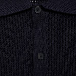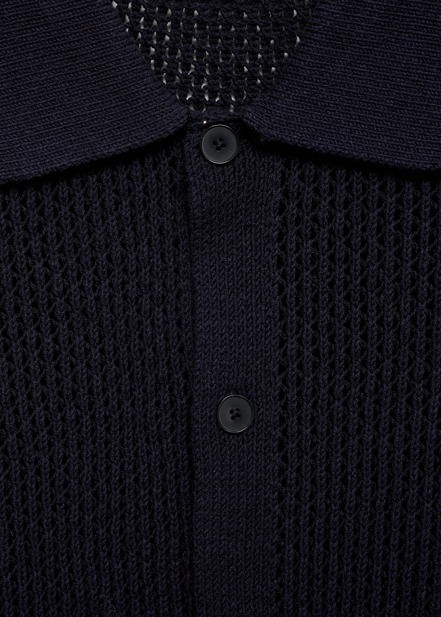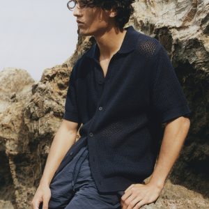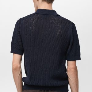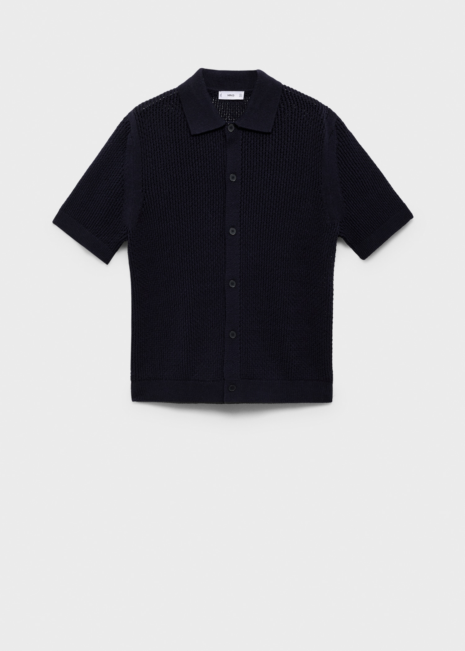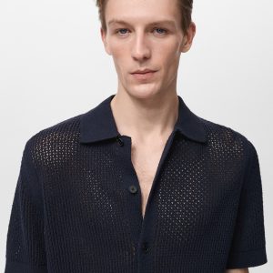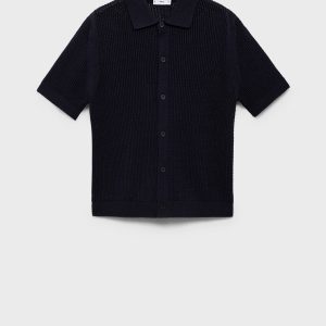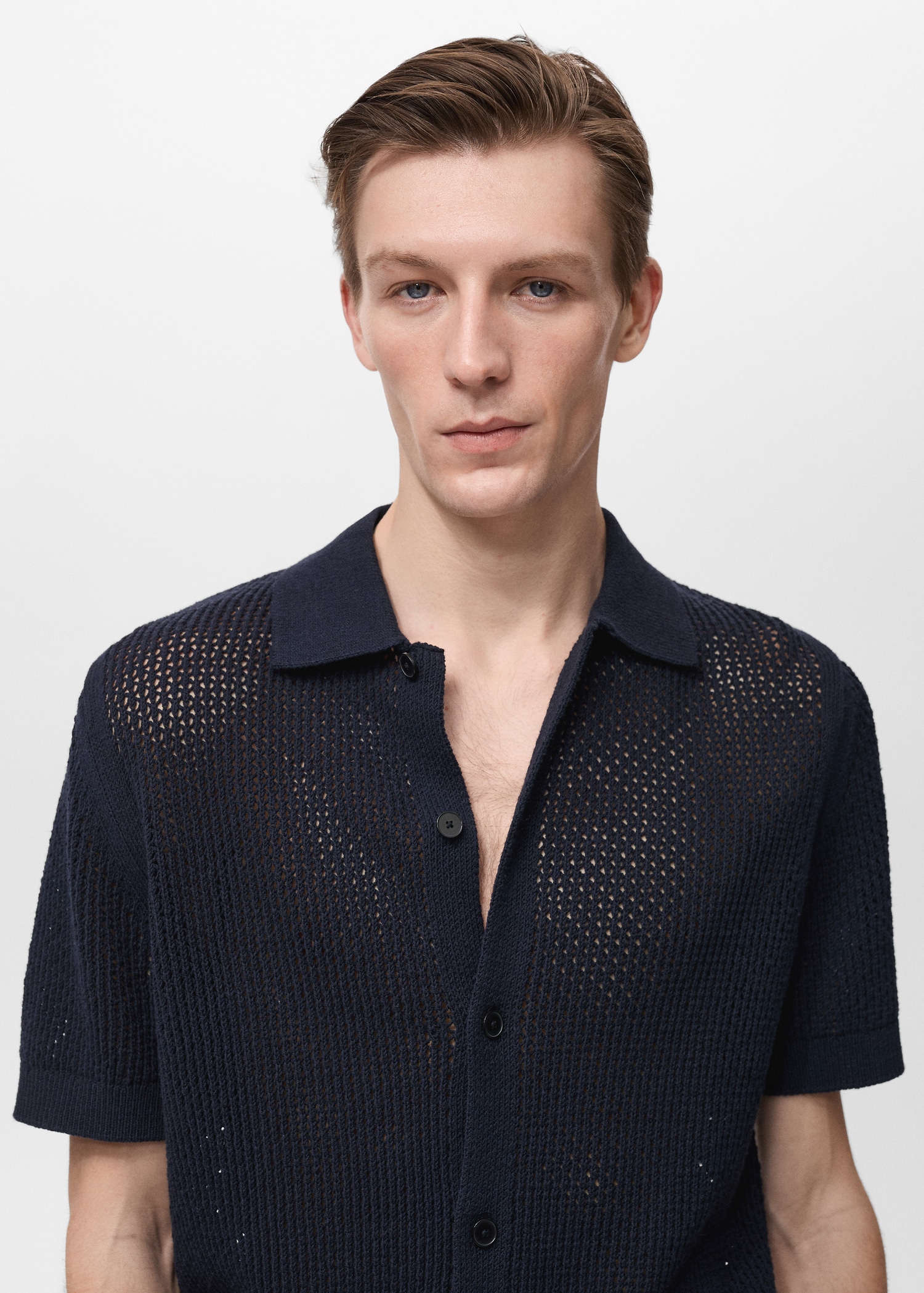Regular fit. Cotton blend fabric. Openwork knit. Shirt collar. Short sleeve. Front button closure. Ribbed collar, sleeves and hem