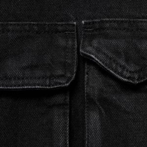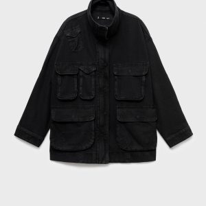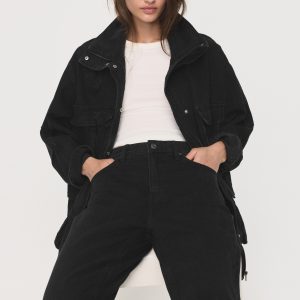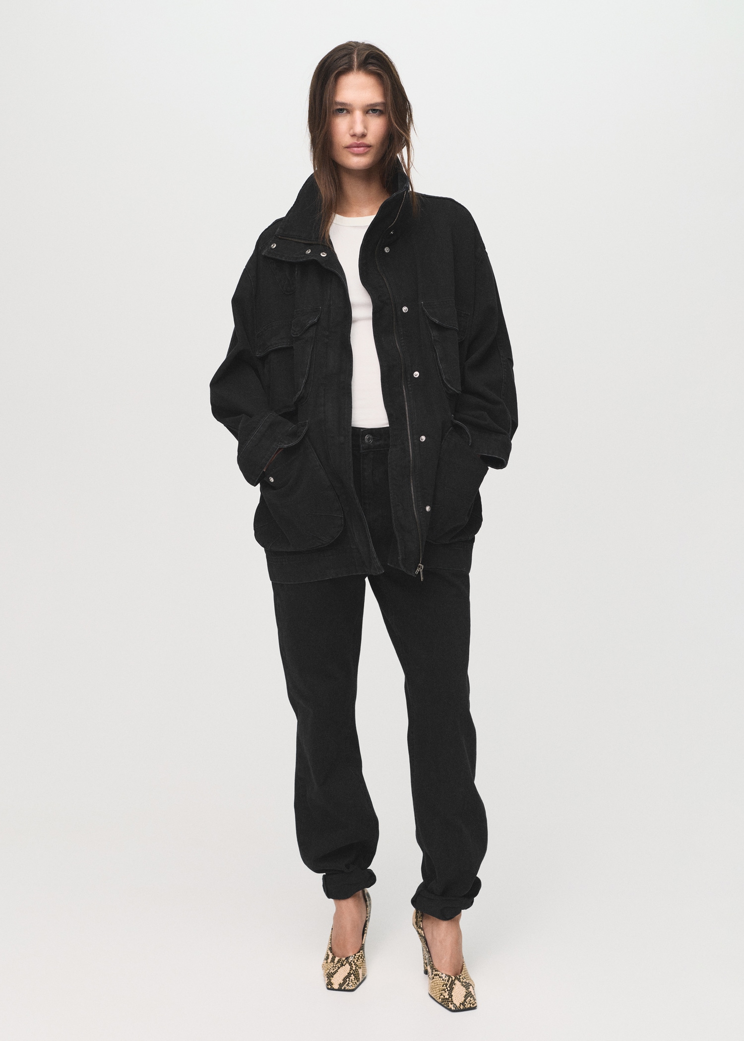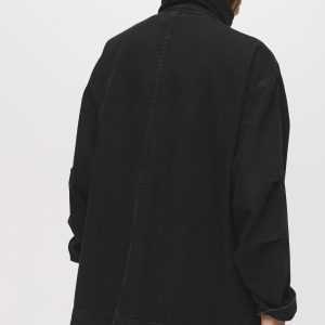 Cotton denim fabric. Oversized design. Funnel neck. Long Sleeve. Zipper and snap button closure. The color black is exclusive online