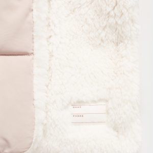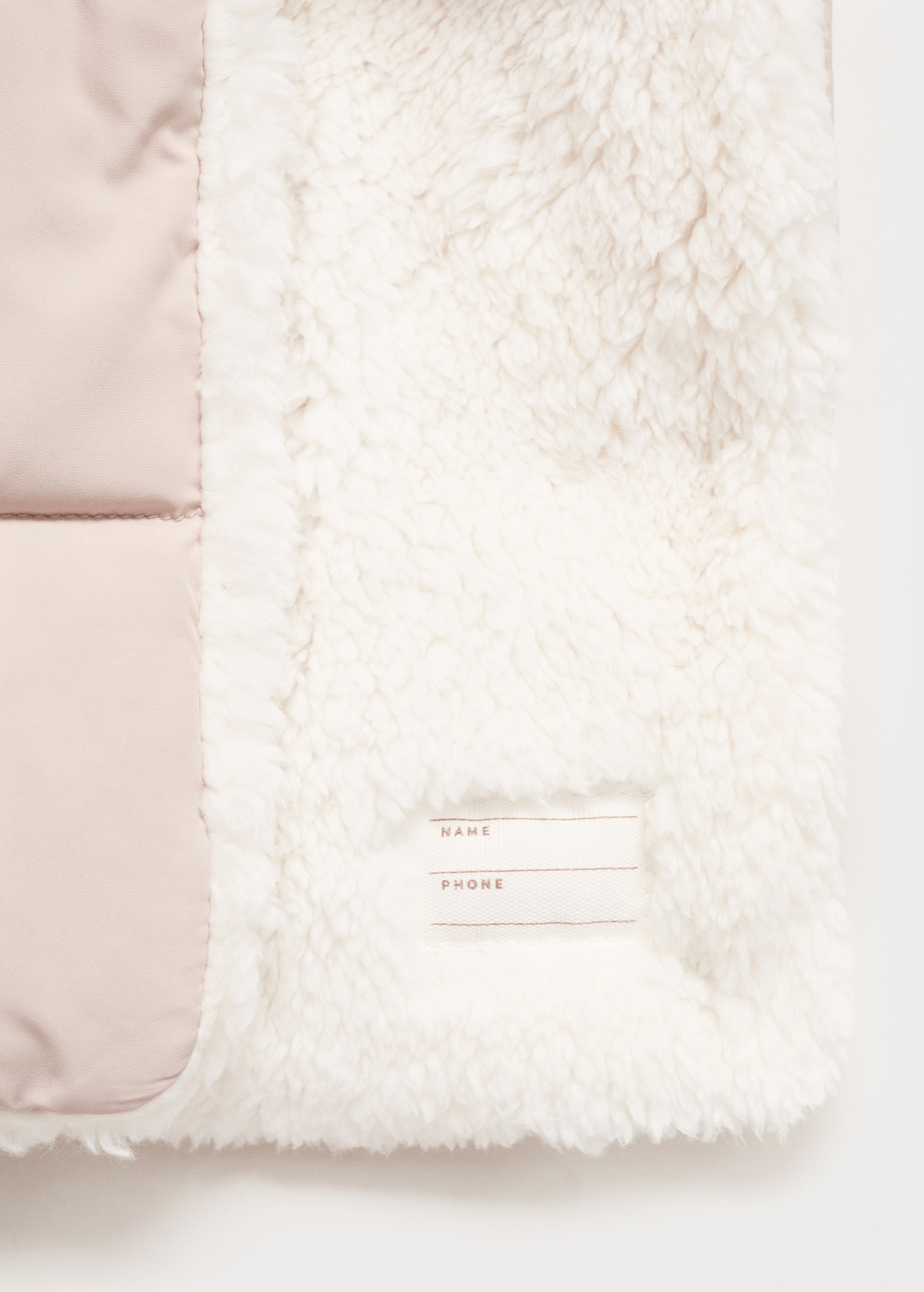 Quilted fabric. Fur-effect lining. Wrap design. Little ears detail on the hood. Cross over press-stud fastener