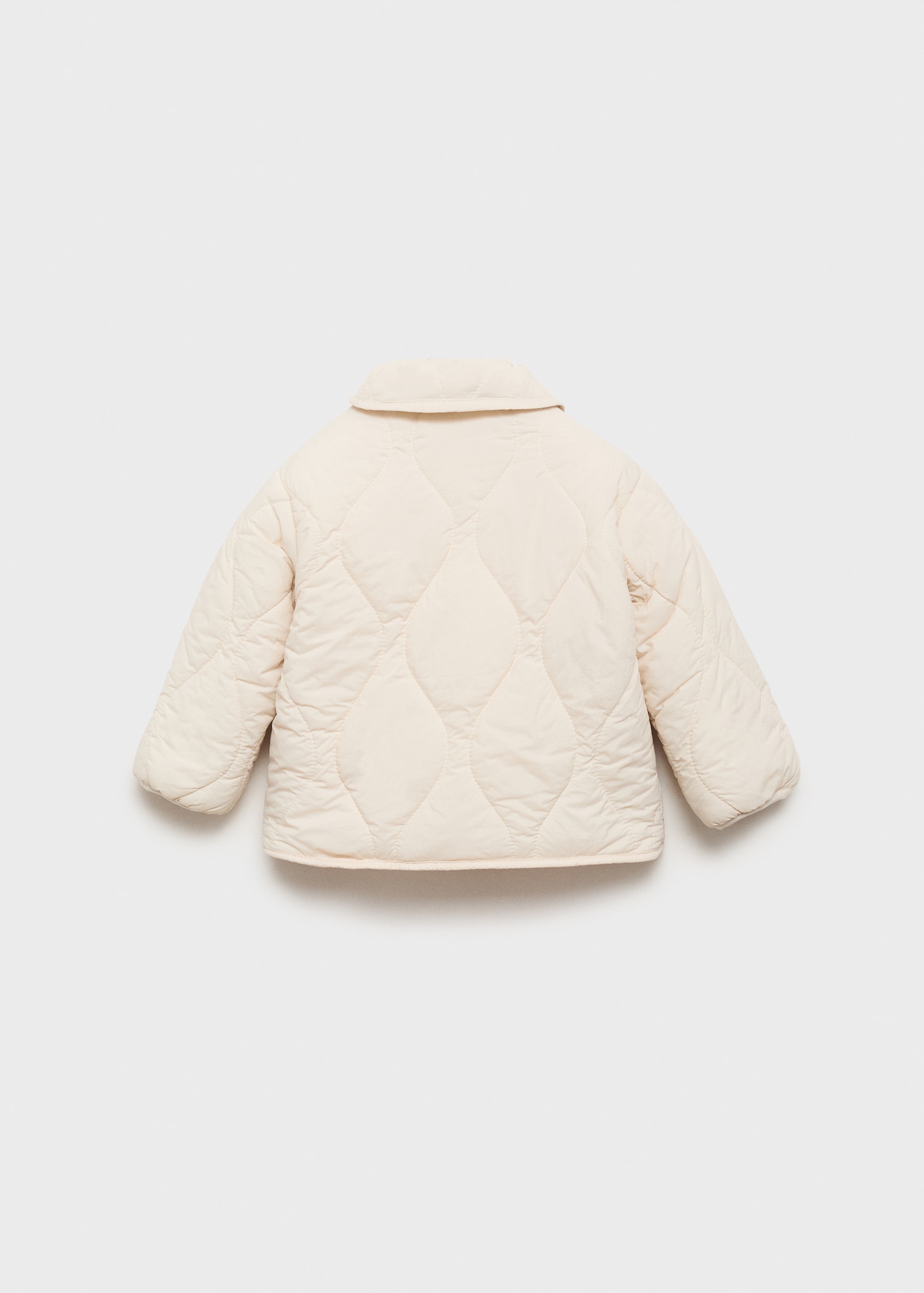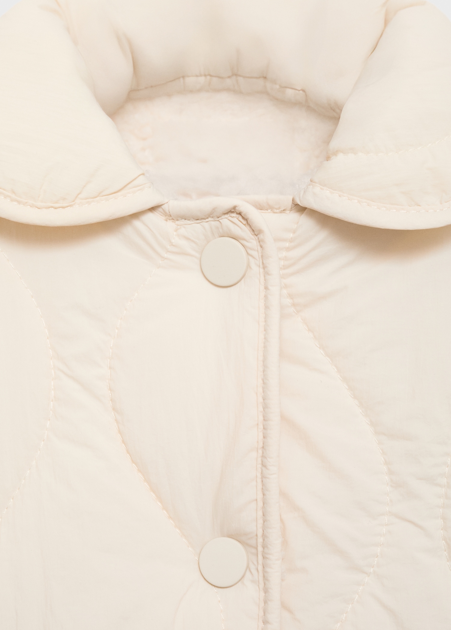 Quilted fabric. Faux shearling fabric. Straight Design. Neck lapel Babydoll/Peter Pan. Long Sleeve. Button closure. Two front pockets. Faux shearling interior