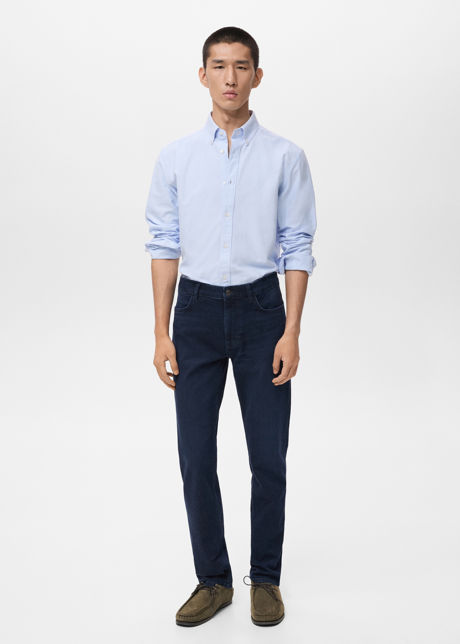 Slim fit. Cotton fabric. Two side pockets. Coin pocket. Two patch pockets at the back. Front zipper and button closure. Belt loops. ESSENTIALS: Made to last. We have strengthened our quality standards by adding new endurance tests to our garments. Designed with careful consideration of their construction, they are even more durable, versatile and timeless