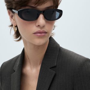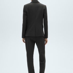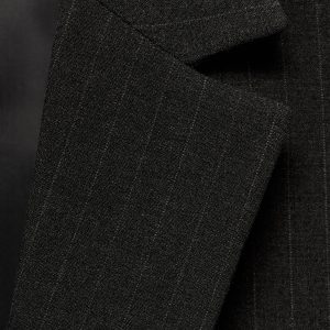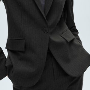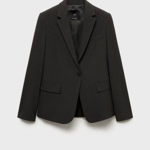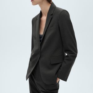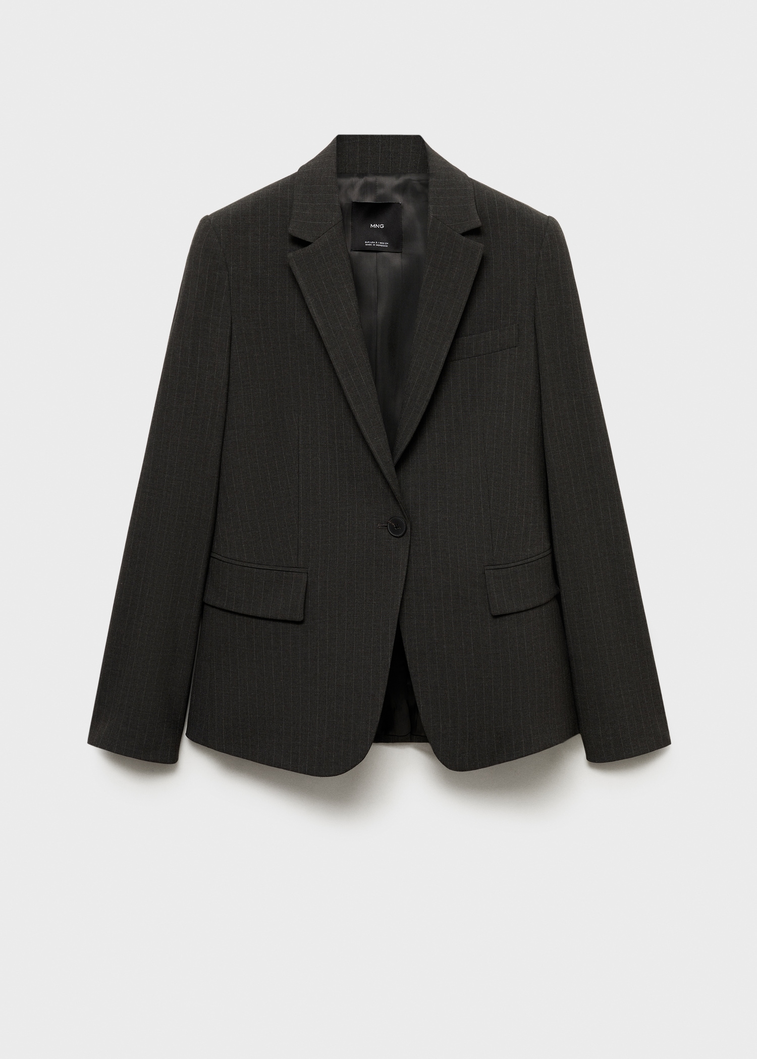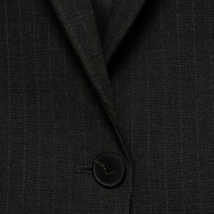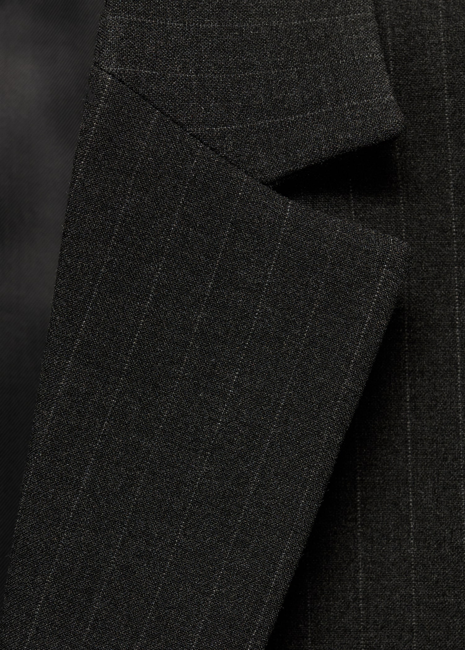 Straight Design. Pinstripe print. Lapel-collar V-neck collar. Notch lapels. Long buttoned sleeves. Welt pocket on the back. Two pockets with flaps on the front. Front button closure. Back slit detail. Inner lining. Total look