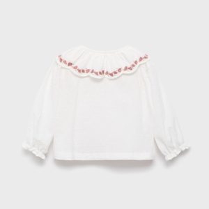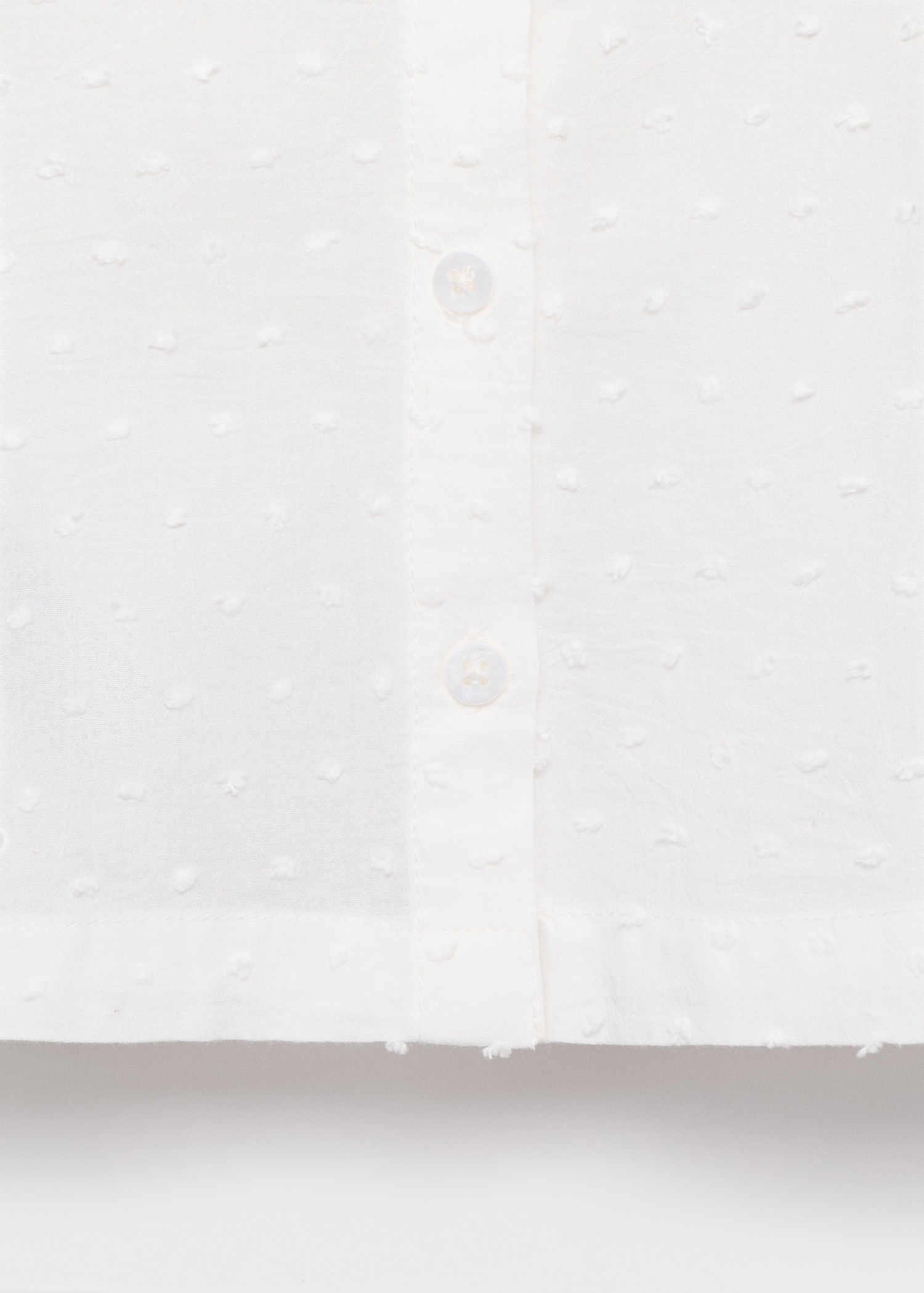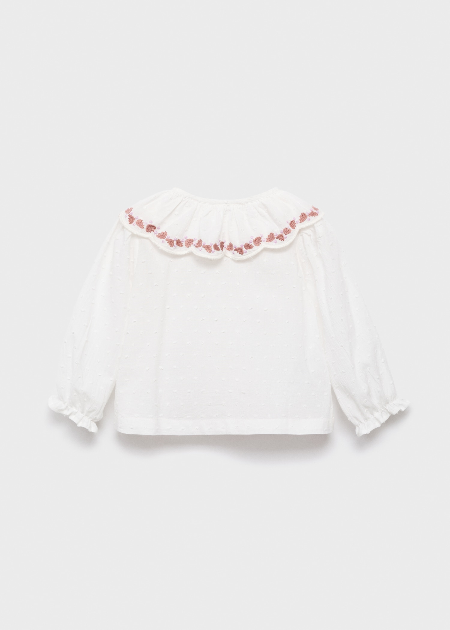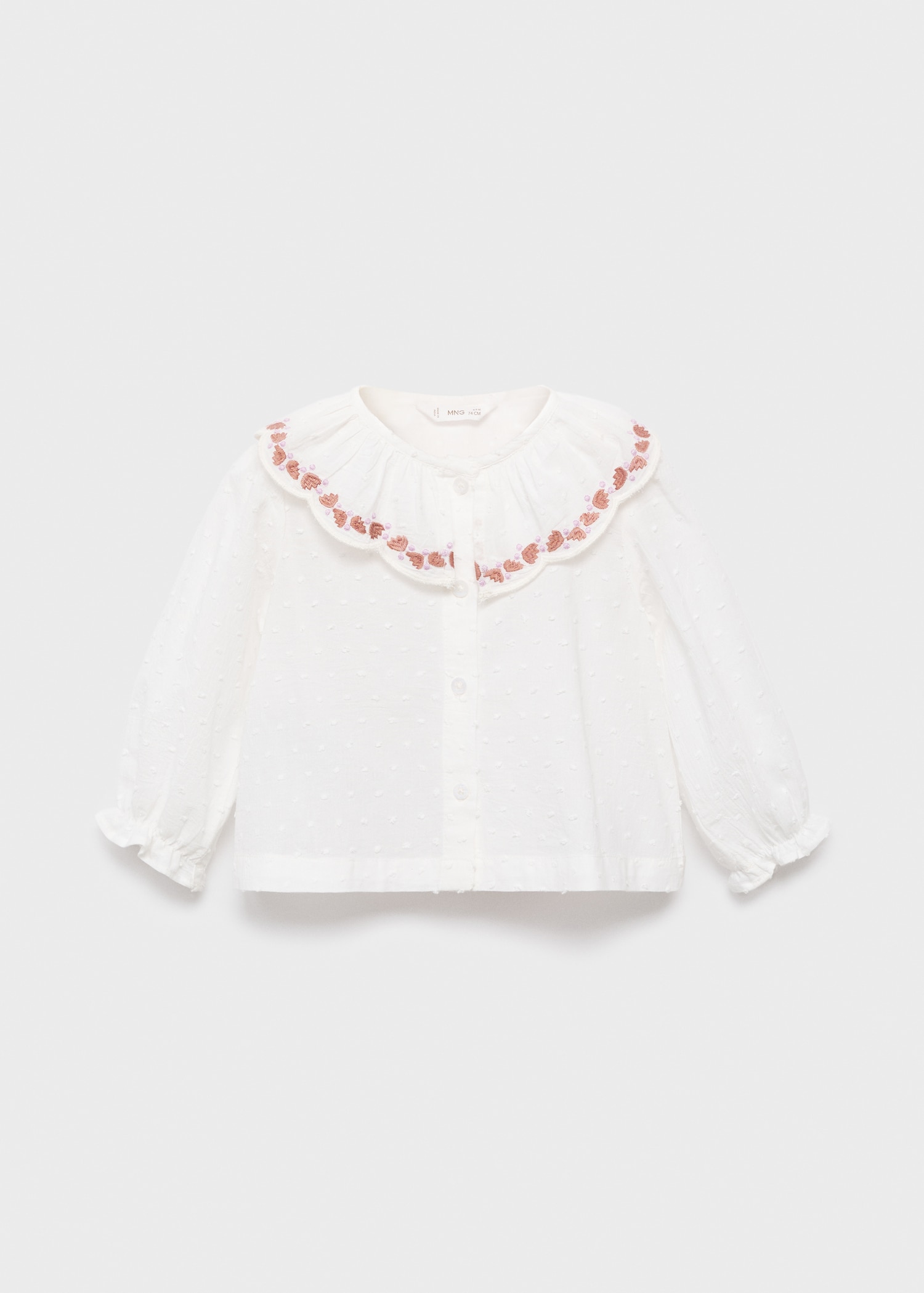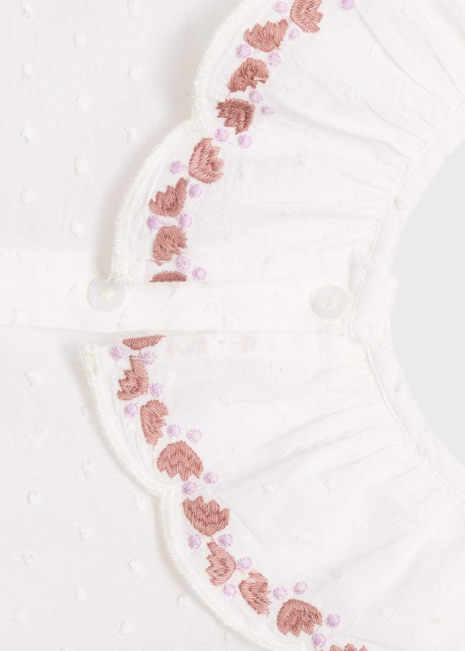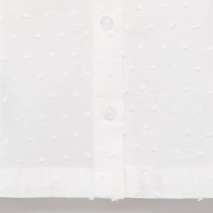 100% cotton fabric. Plumeti fabric. A-line design. Babydoll collar. Long sleeves with ribbed trims. Embroidered details. Front button closure