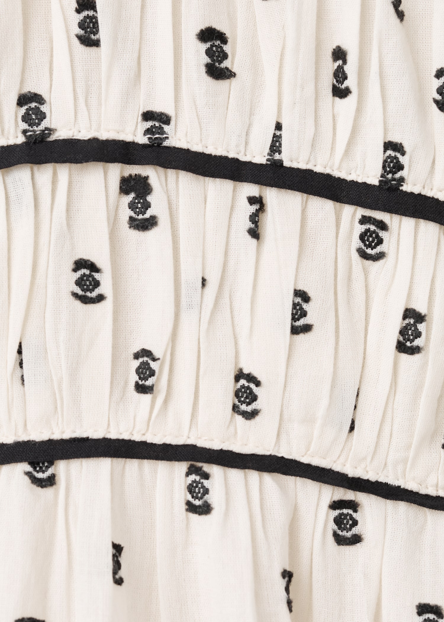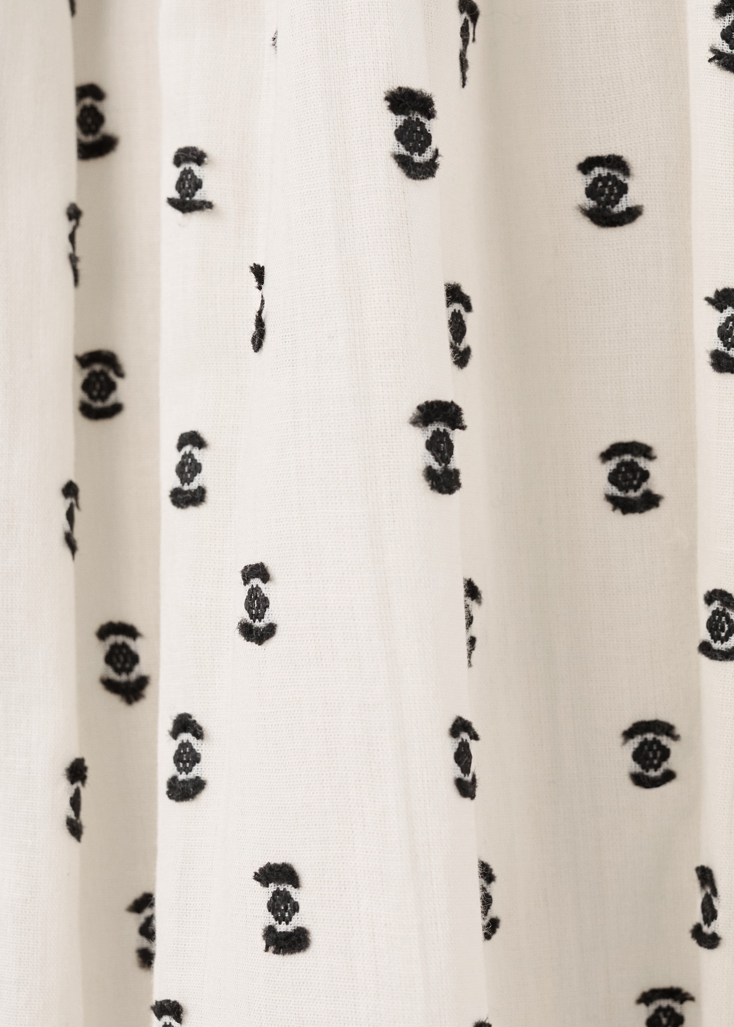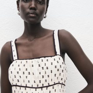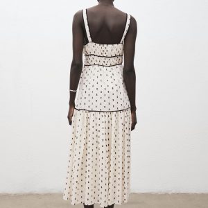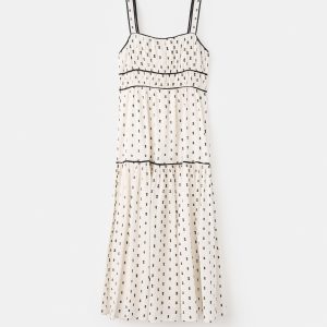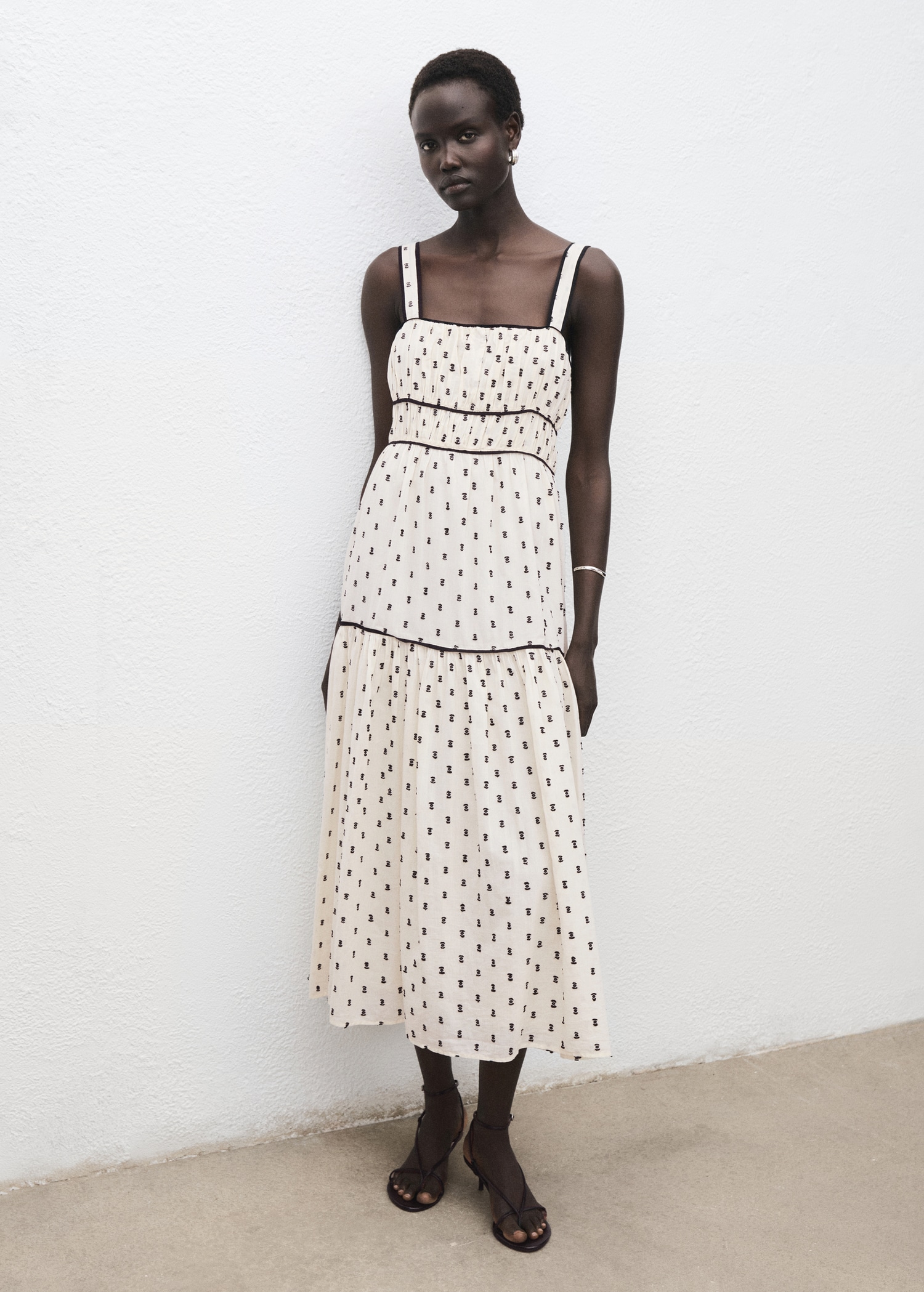 Cotton blend fabric. Plumeti fabric. Midi design. A-line design. Low neckline. Sleeveless. Wide straps. Ruched panel. Side zip closure. Inner lining. This garment is part of our casual collection, designed to stylishly accompany you in your day-to-day life