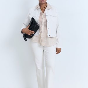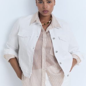 Cotton denim fabric. Straight design. Shirt collar. Long Sleeve. Two chest pockets with flaps. Front button closure. Available Plus. Crop design. Notched lapel collar. Long sleeves with buttoned cuffs. Two side pockets. Two patch pockets with flaps on the chest. Promotional product. Comfort fabric with elasticity