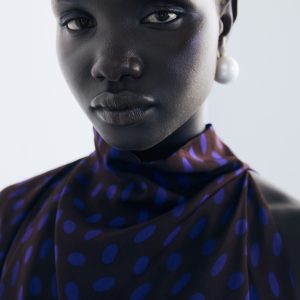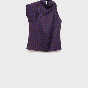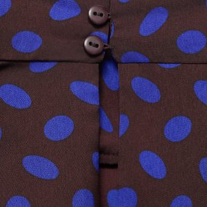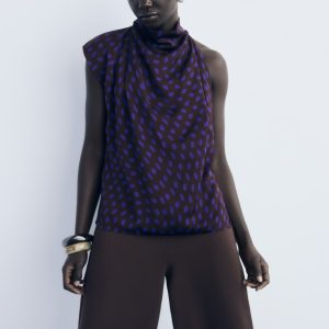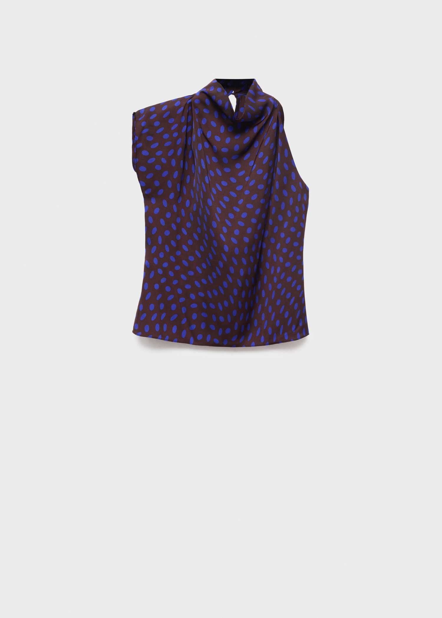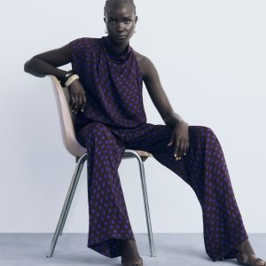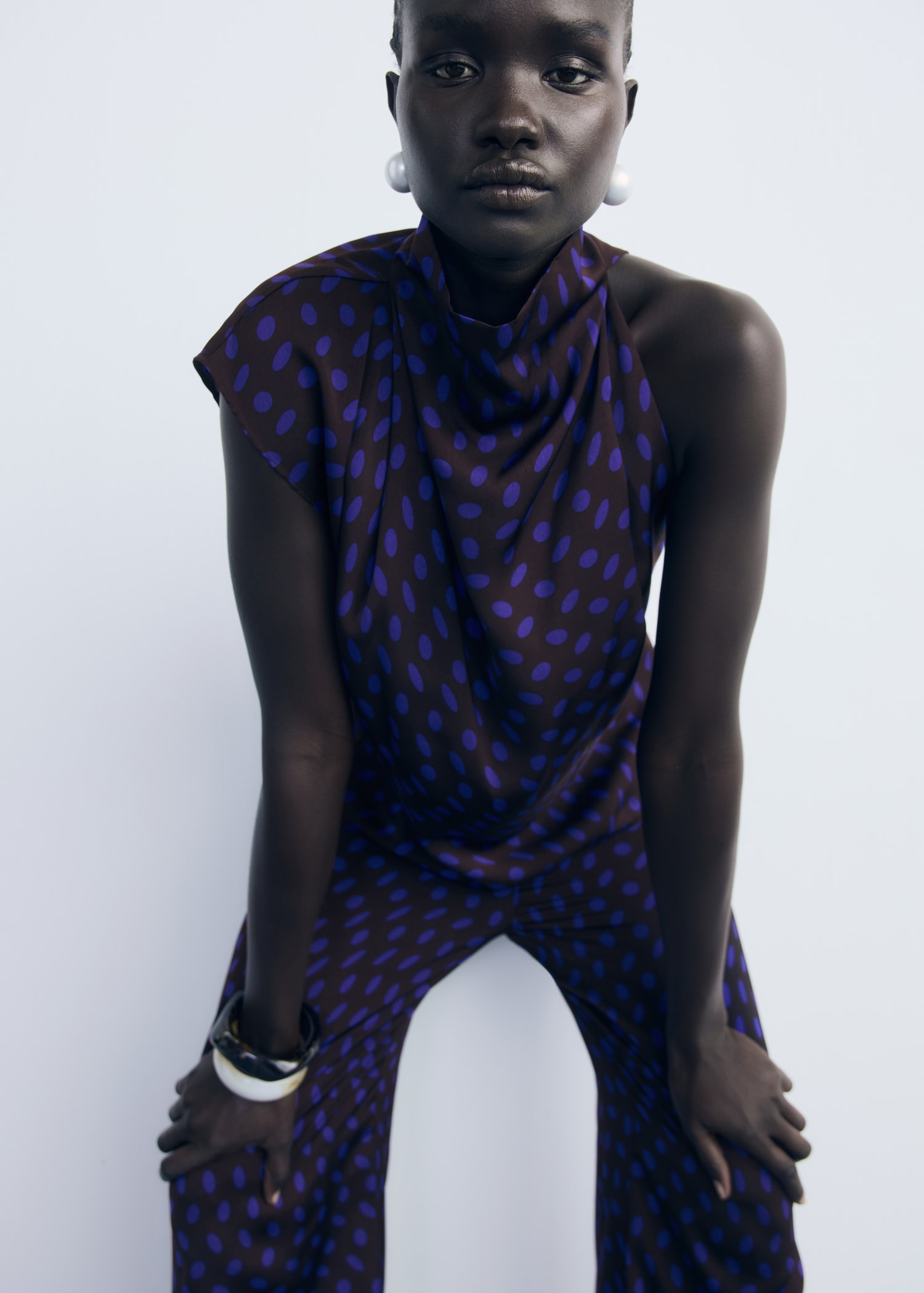 With a straight and polka-dot design, this garment features a draped neckline and asymmetrical sleeves. It comes with matching pants for a special total look