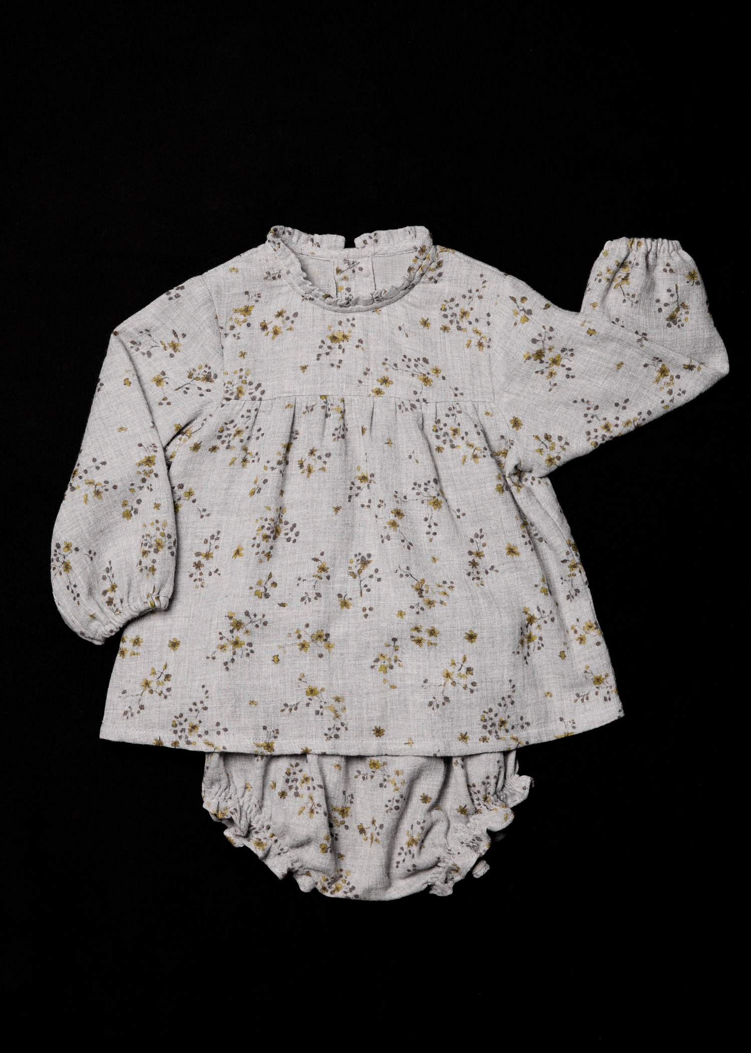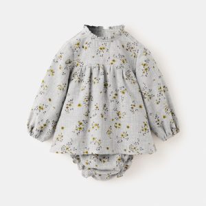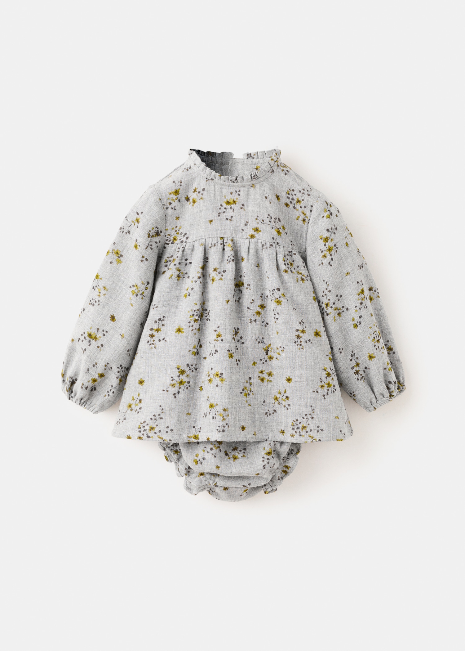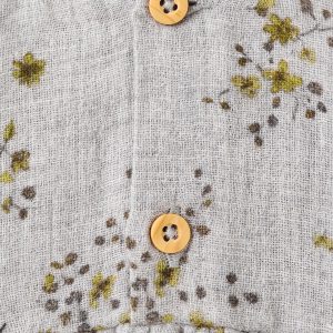 100% cotton fabric. A-line design. Floral print design. Gathered round neckline. Long sleeves with ribbed trims. Ruched detail at the front. Button closure at the back