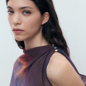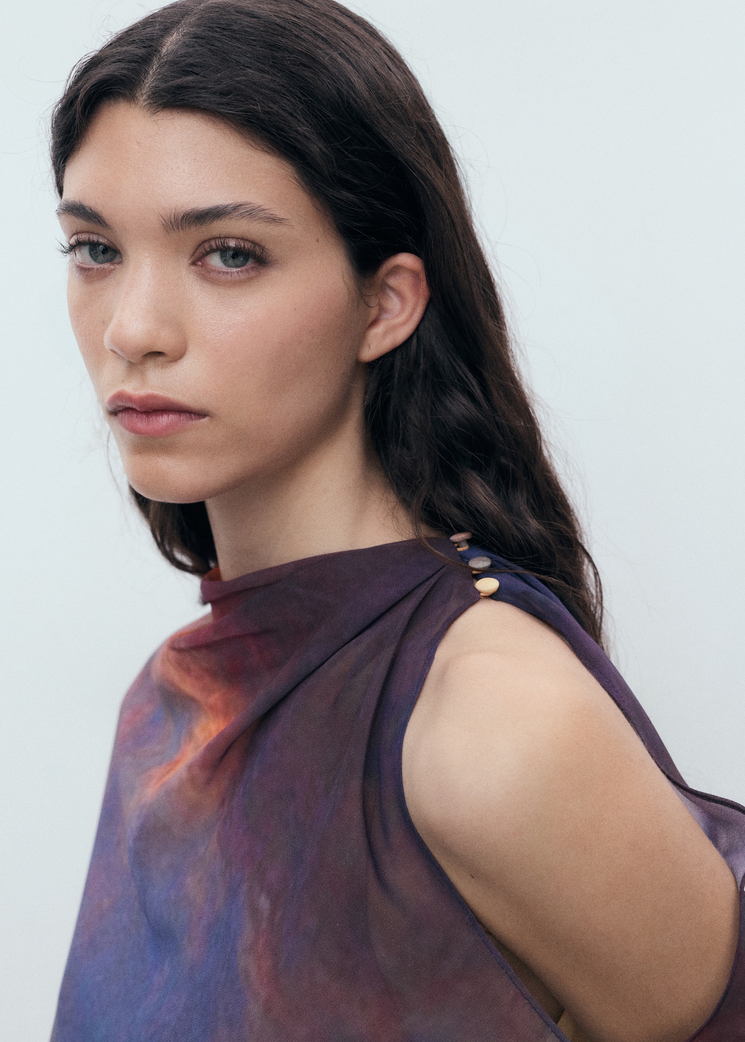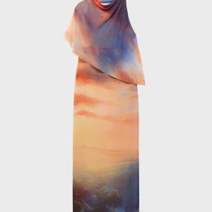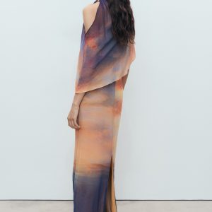 Long design. Straight Design. Landscape print. Boat neck. Draped detail on the shoulder. Sleeveless. Asymmetric double cape. Button fastening on the shoulder. Side zip closure. Inner lining. This garment is part of our event collection, designed to make you the perfect guest at any party, wedding, or ceremony.