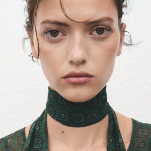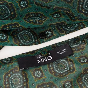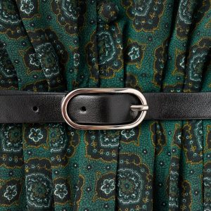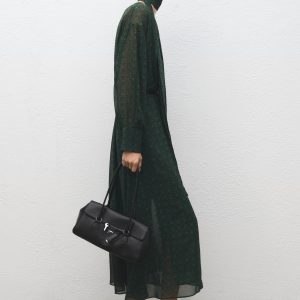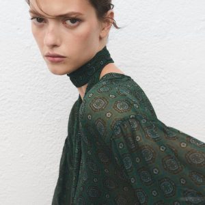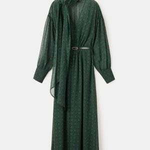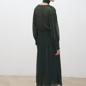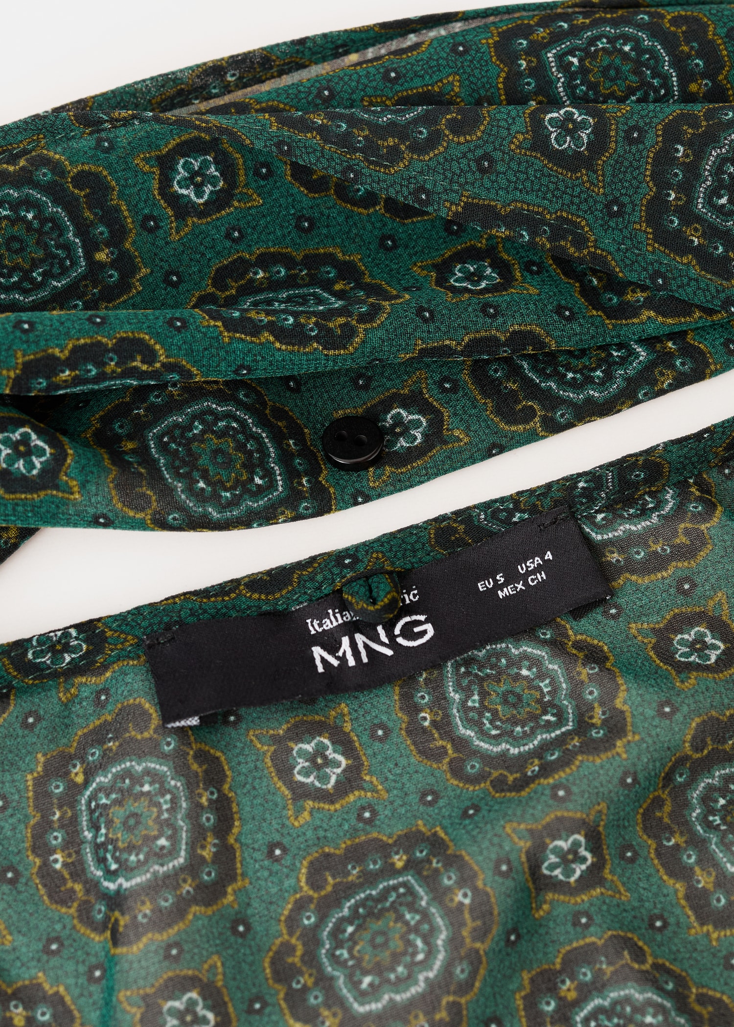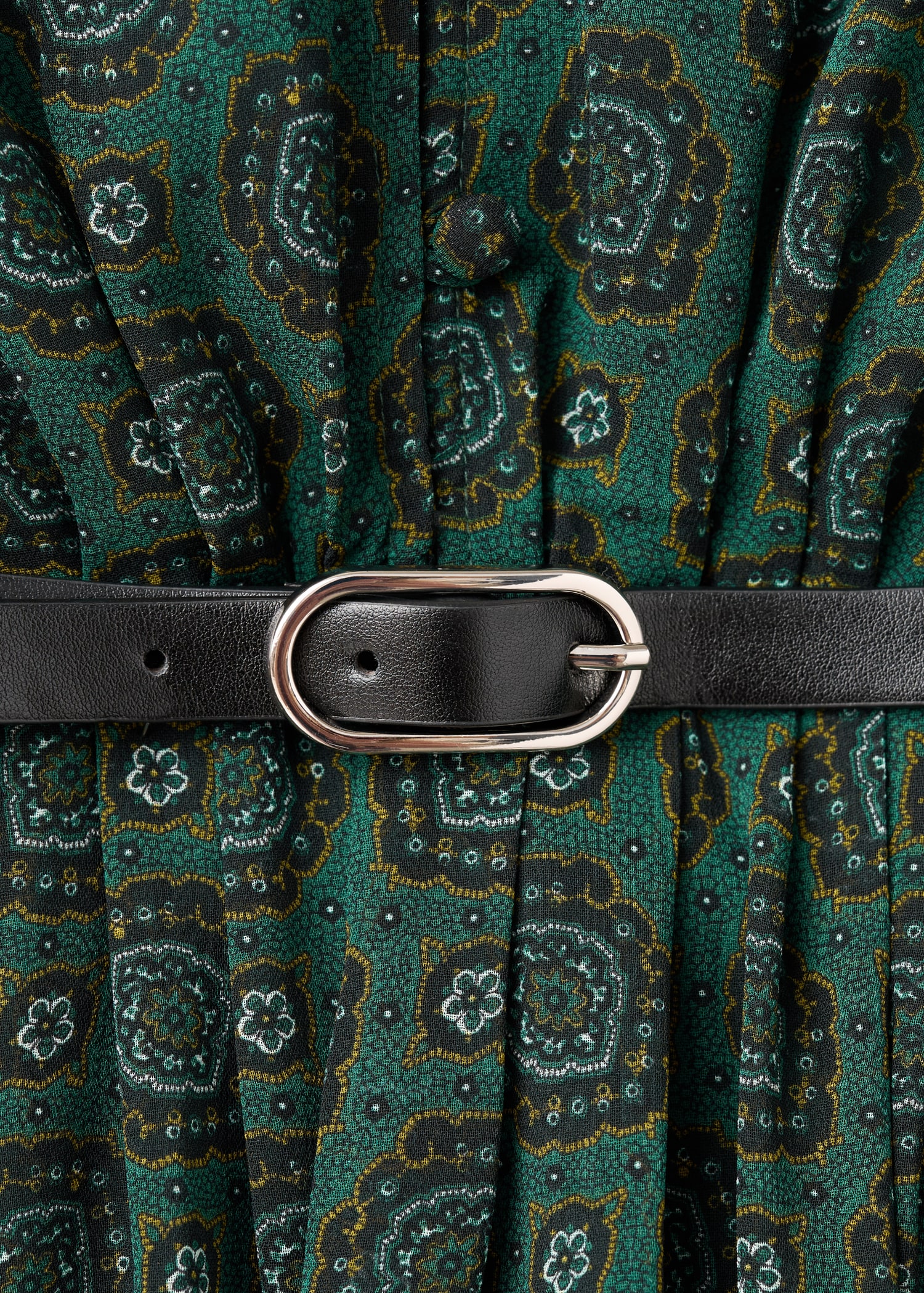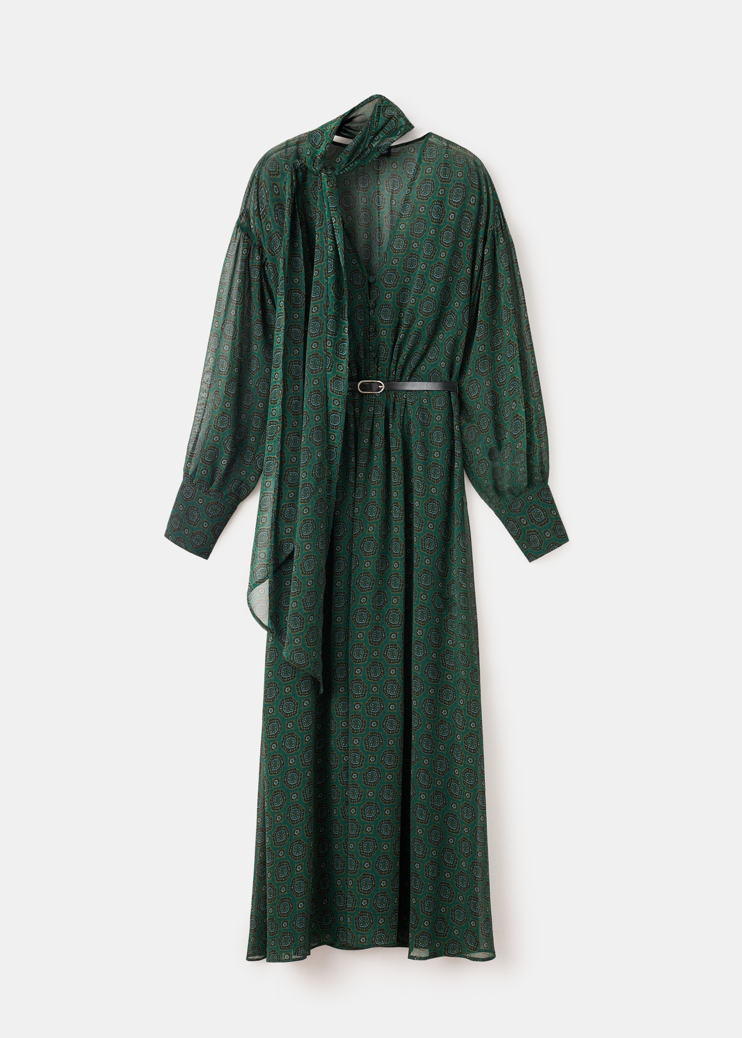 Semi-transparent fabric. Long design. A-line design. Printed design. V-neck. Long sleeves with buttoned cuffs. Belt buckle fastening. Front button closure. Inner lining