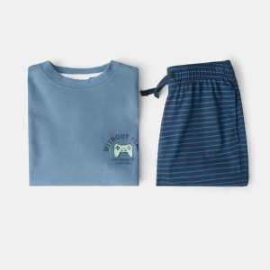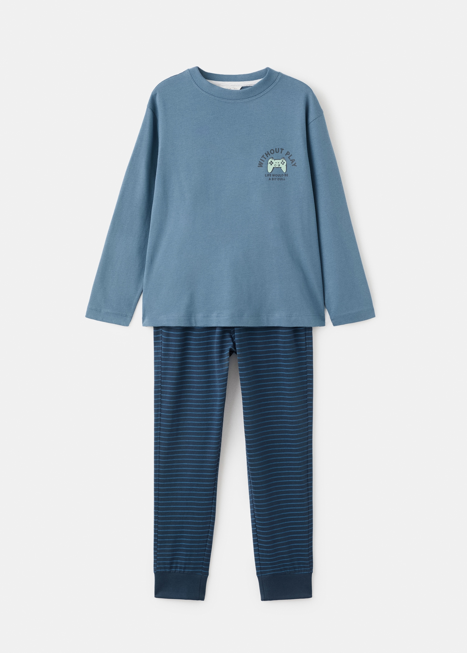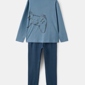Long pajama pack. 100% cotton fabric. Long design. Printed graphic on the chest. Stripes long pants. Elastic waist with drawstring