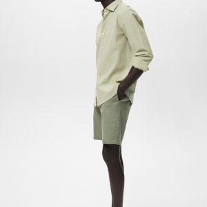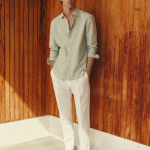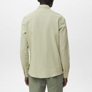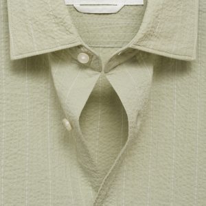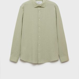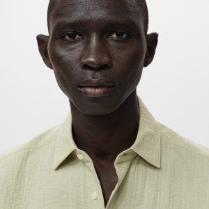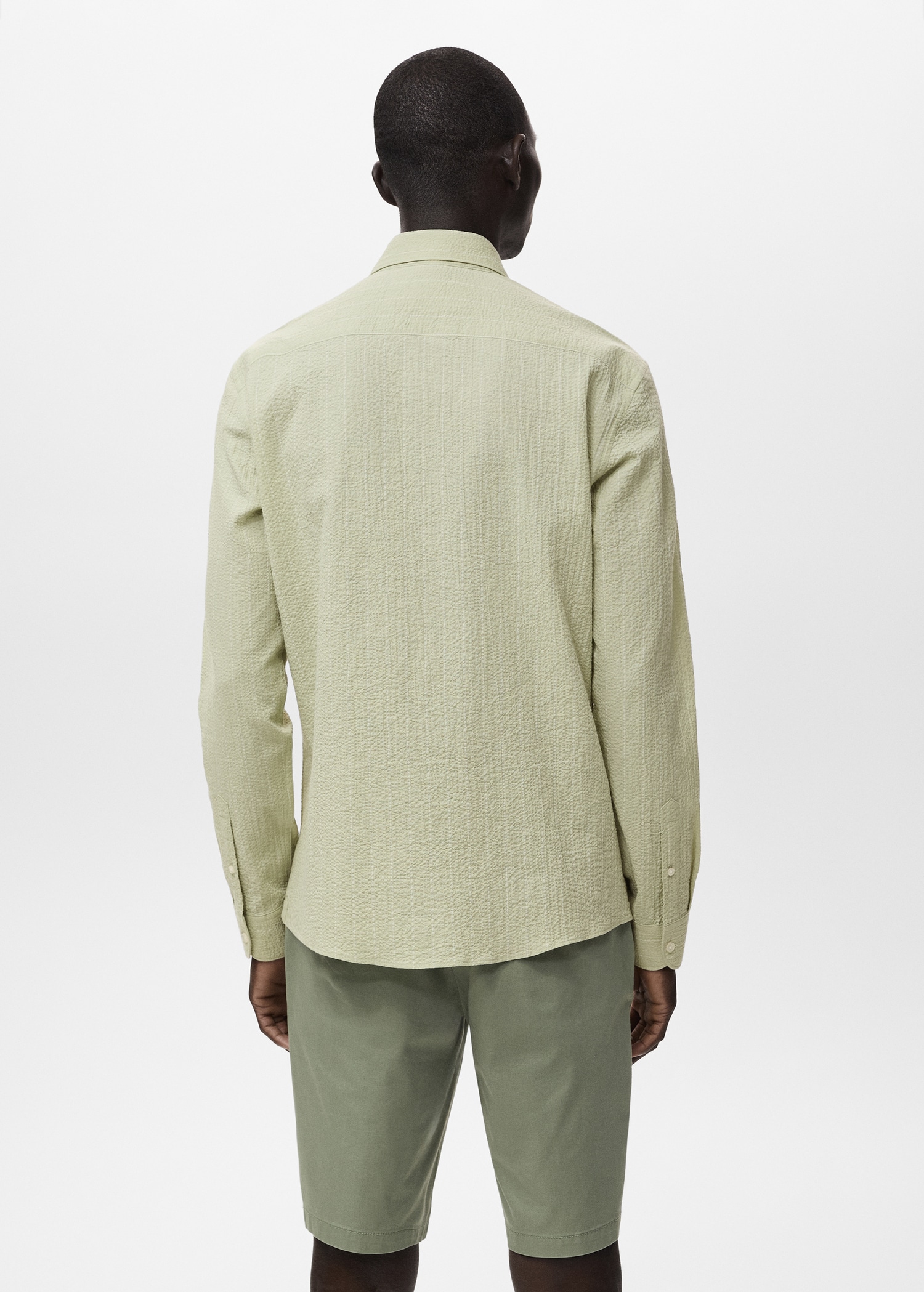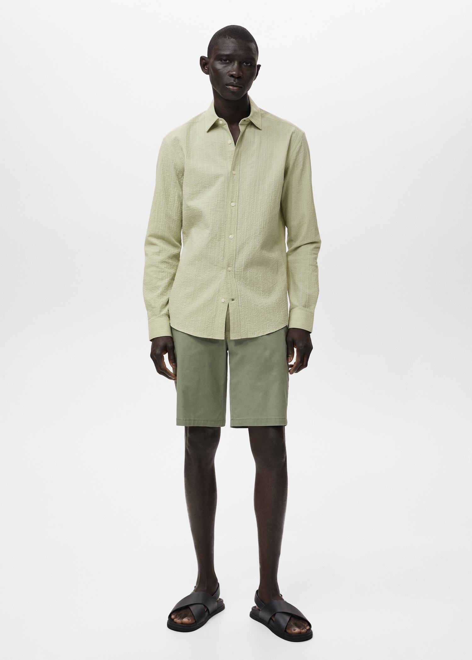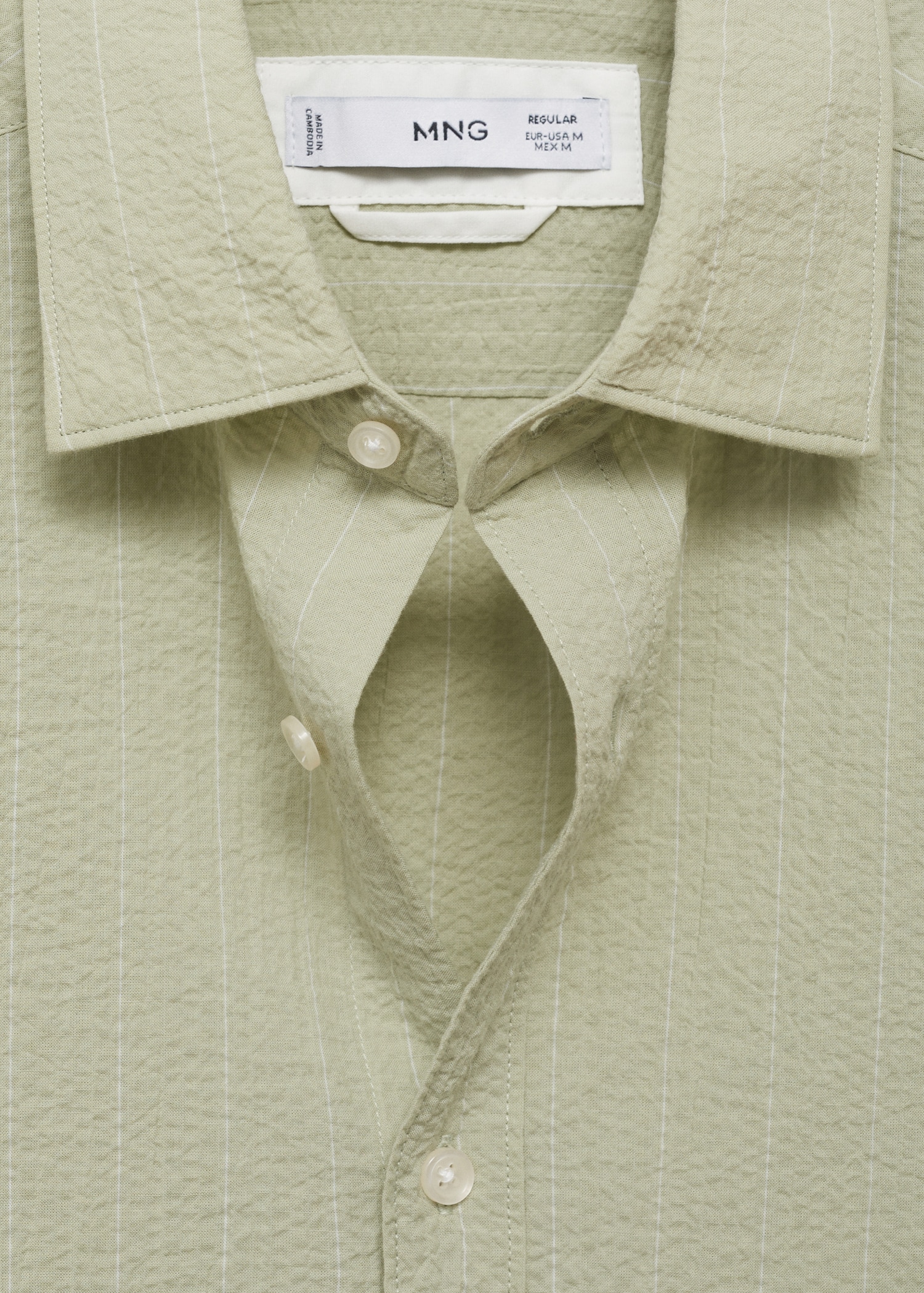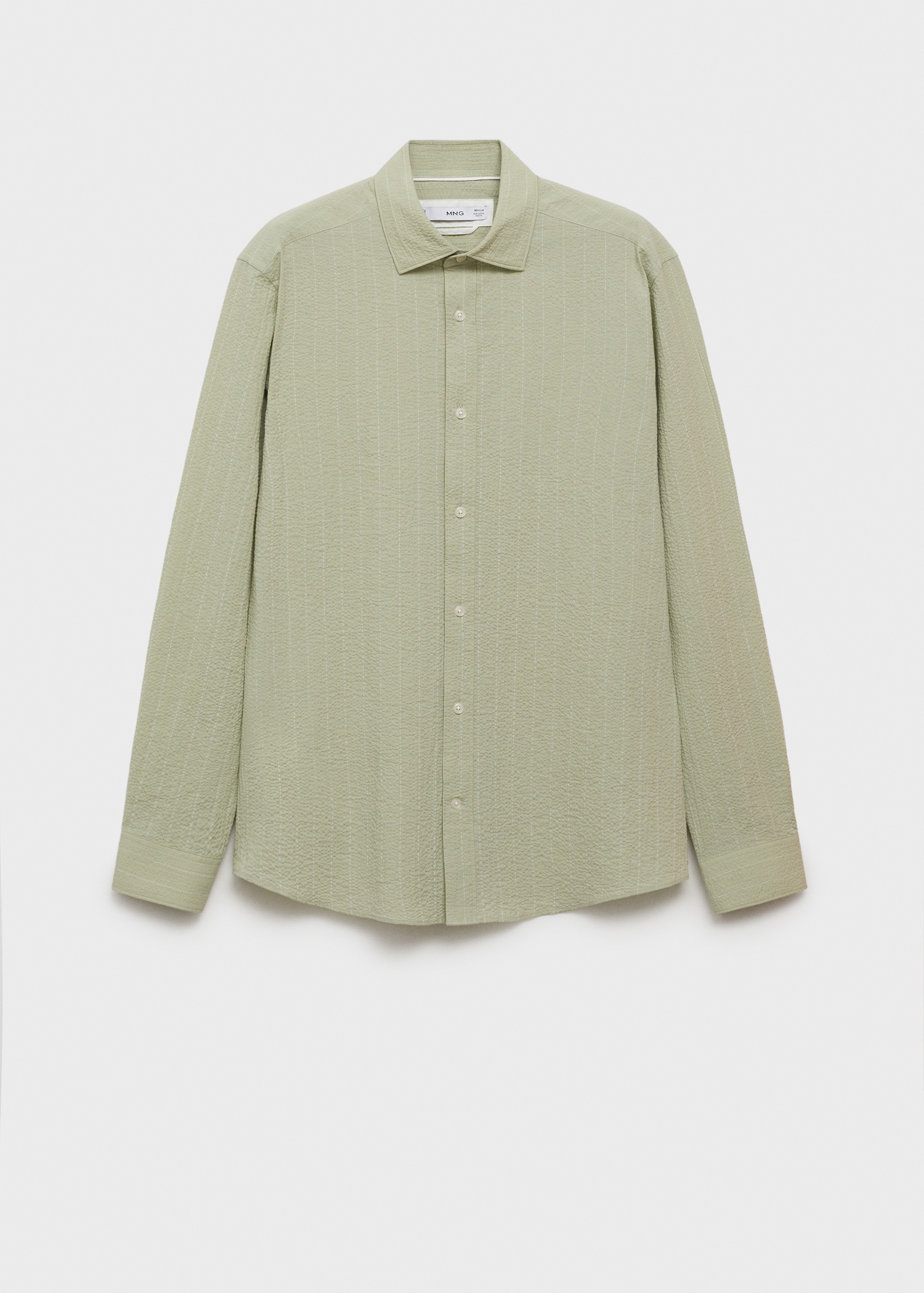 Cotton fabric. Regular Silhouette. Textured. Regular fit. Striped print. Shirt collar. Long sleeves with puffed cuffs. Front button closure