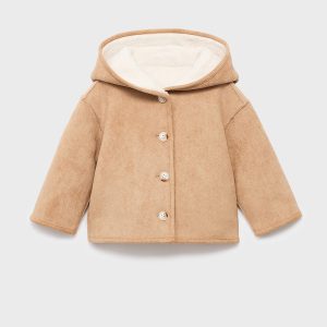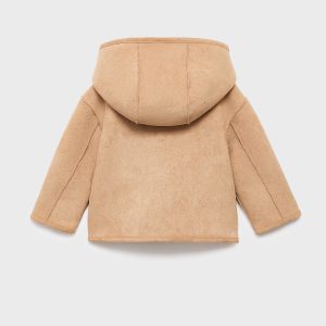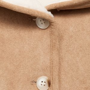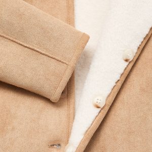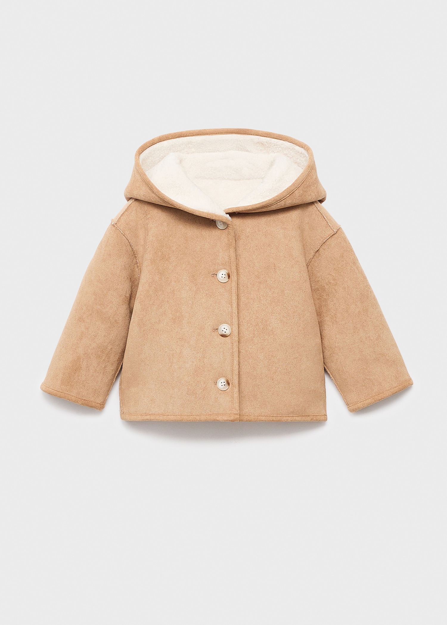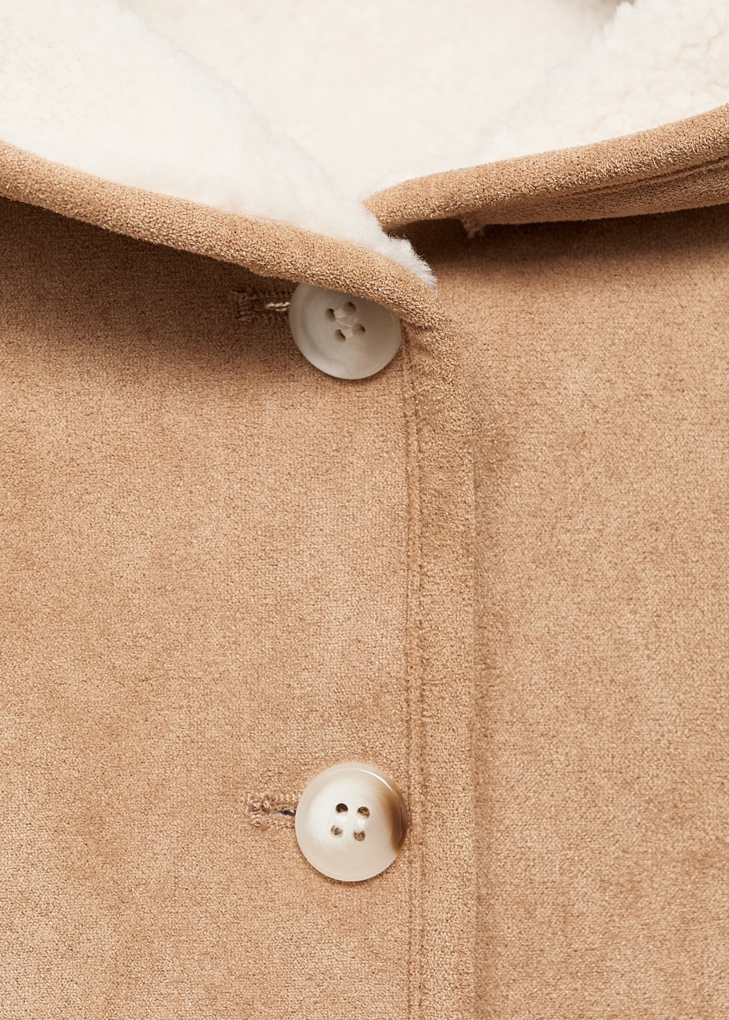 Faux suede. Faux shearling interior. Reversible design. With hood. Front button closure