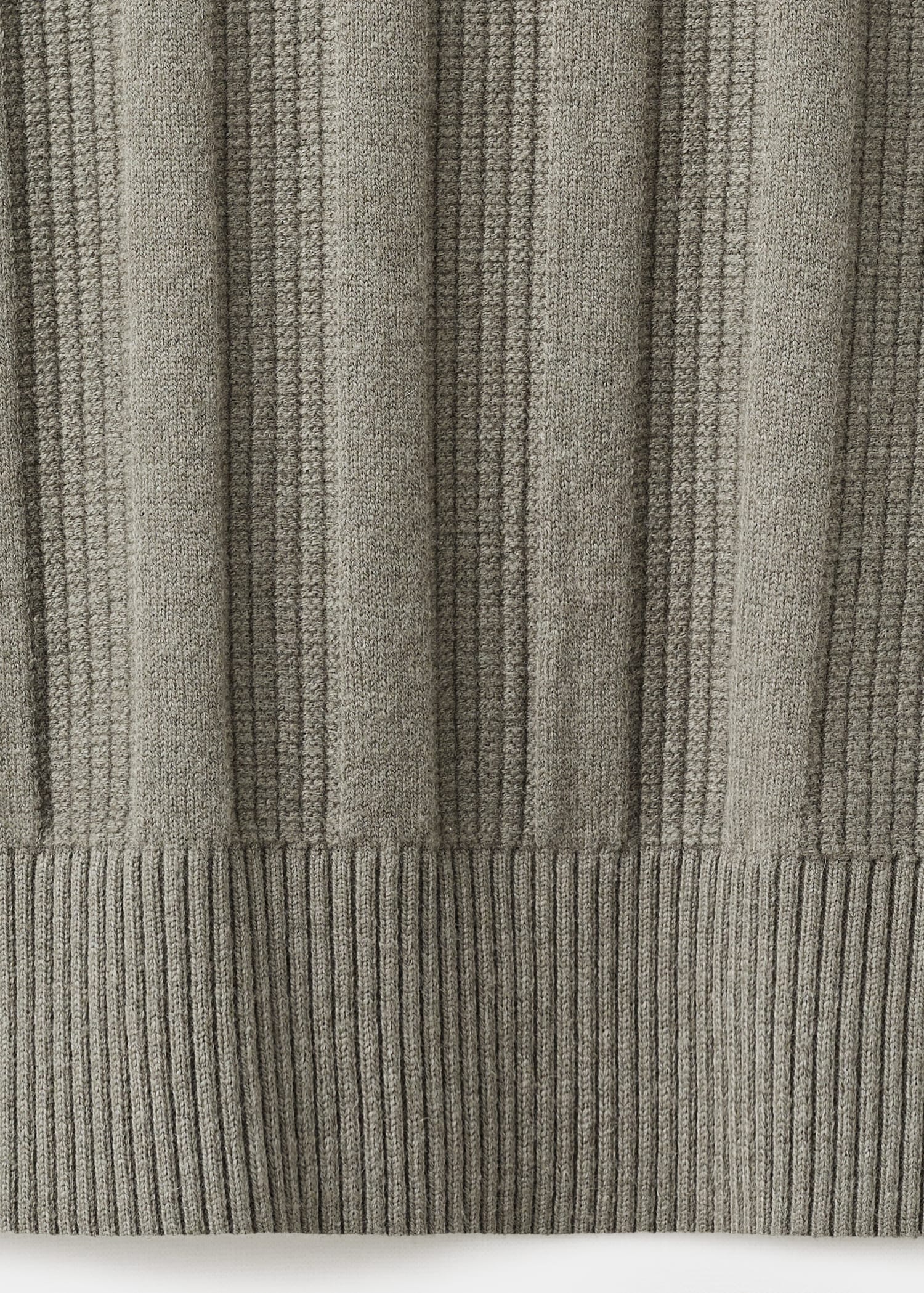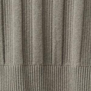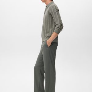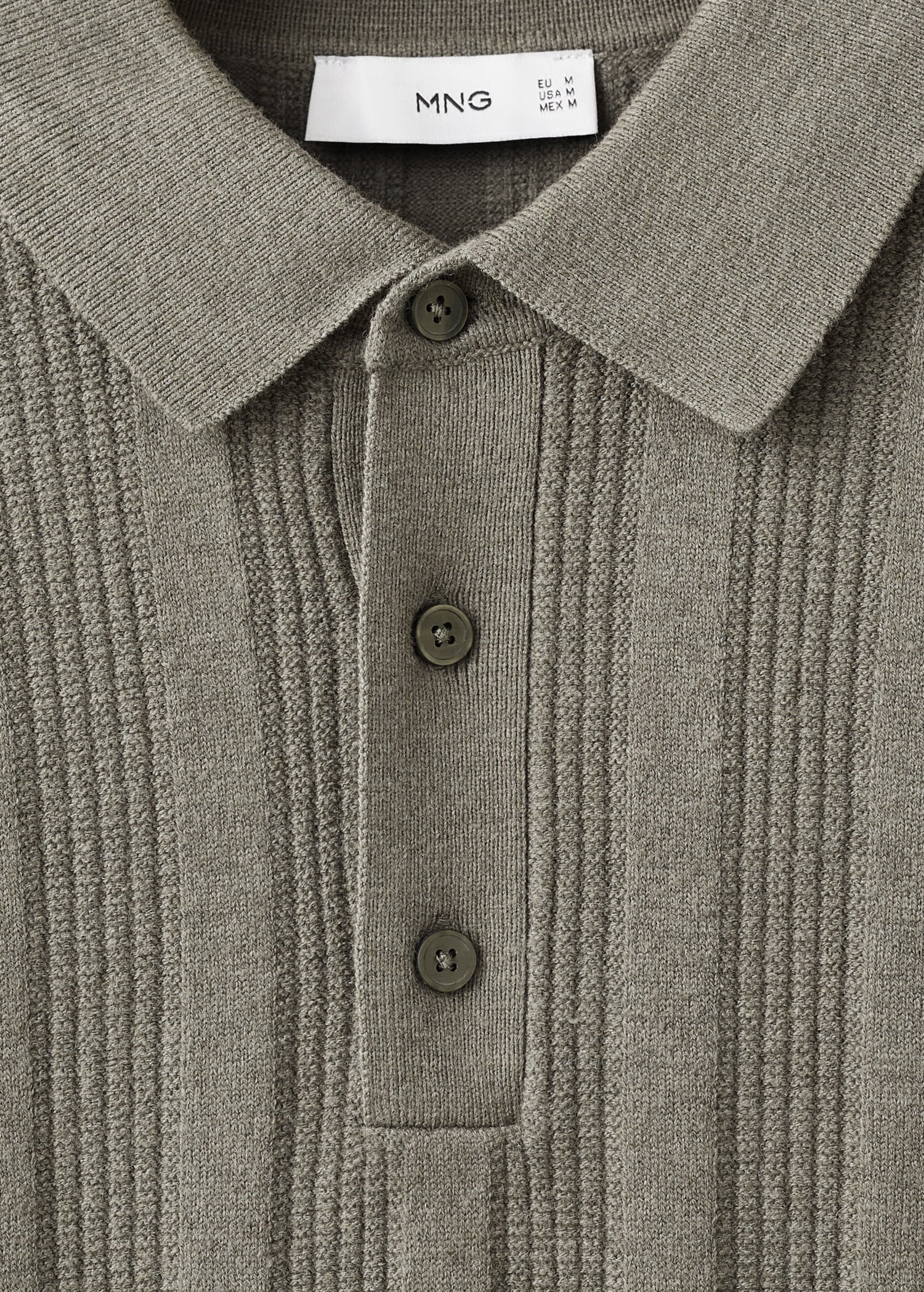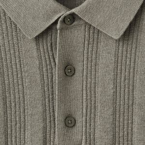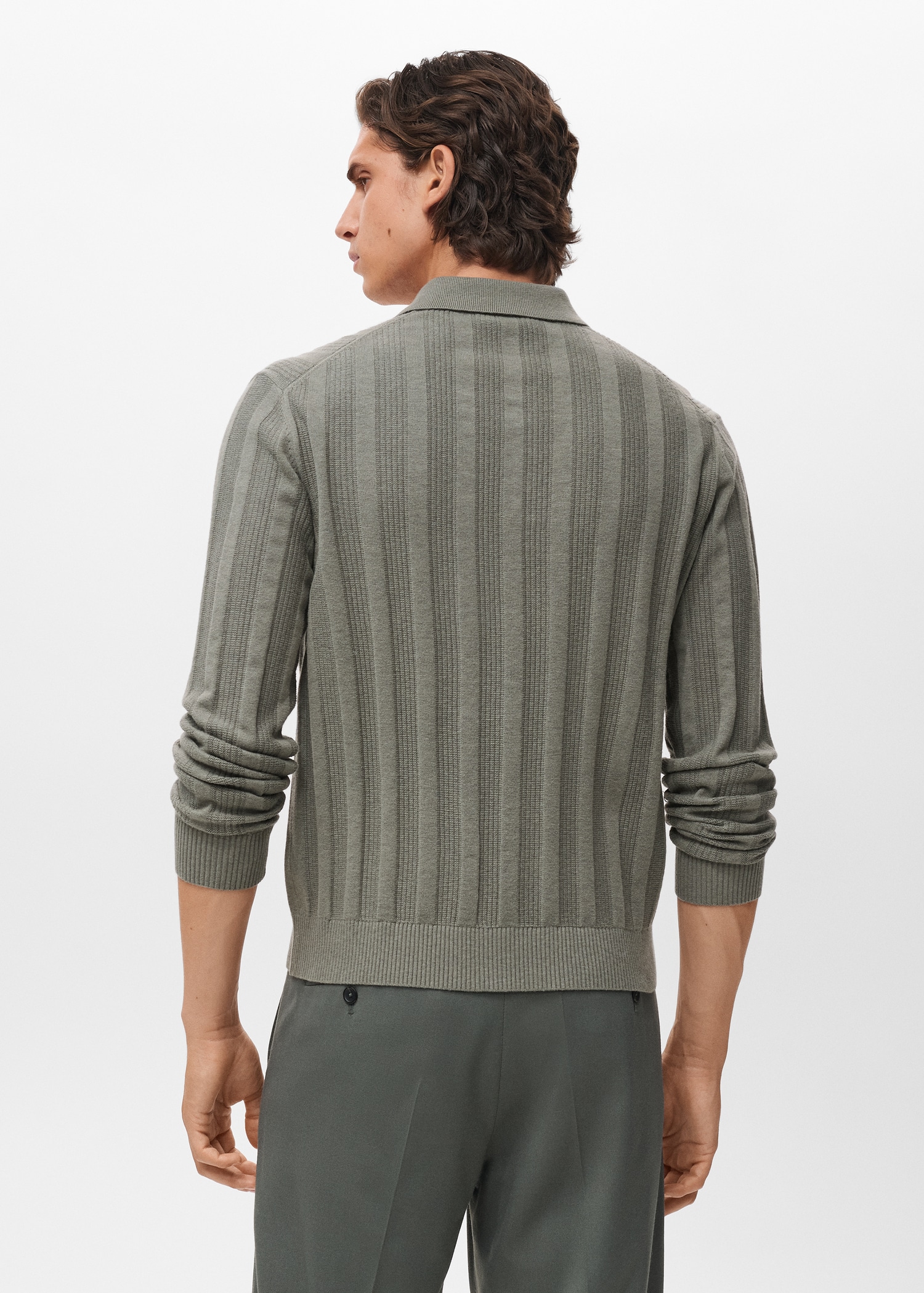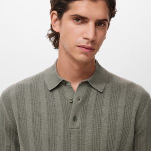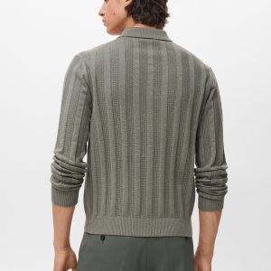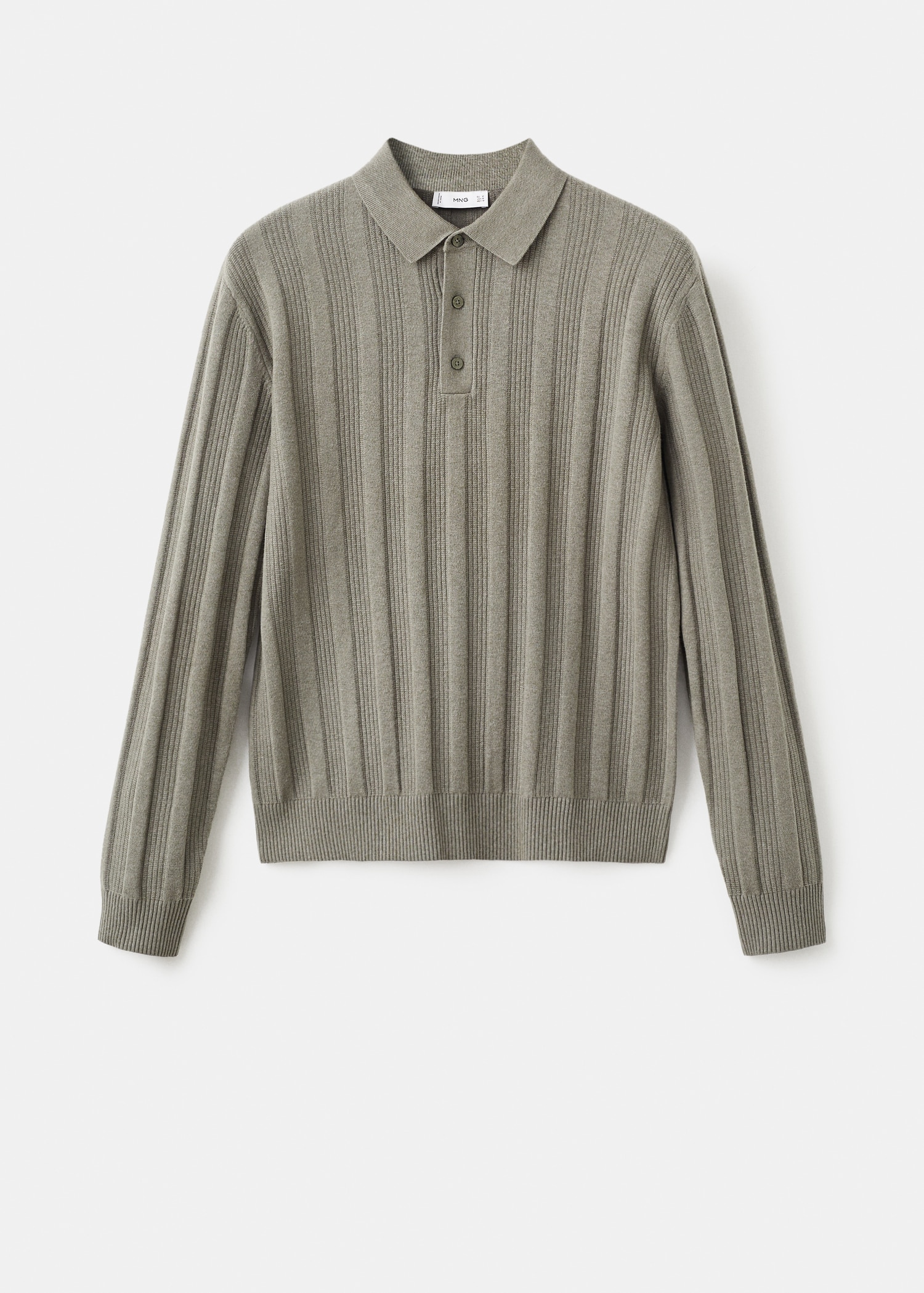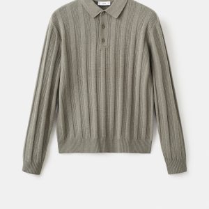 Ribbed knit fabric. Straight silhouette. Cotton blend fabric. Ribbed design. Polo collar with button closure. Ribbed neck, cuffs, and hem. Long Sleeve