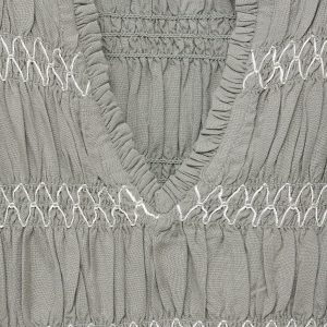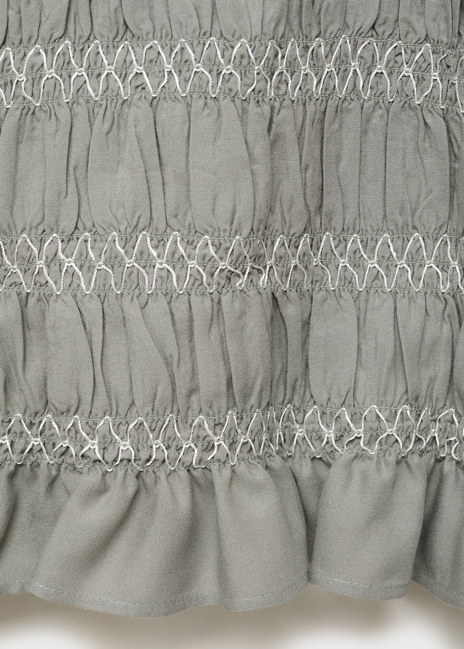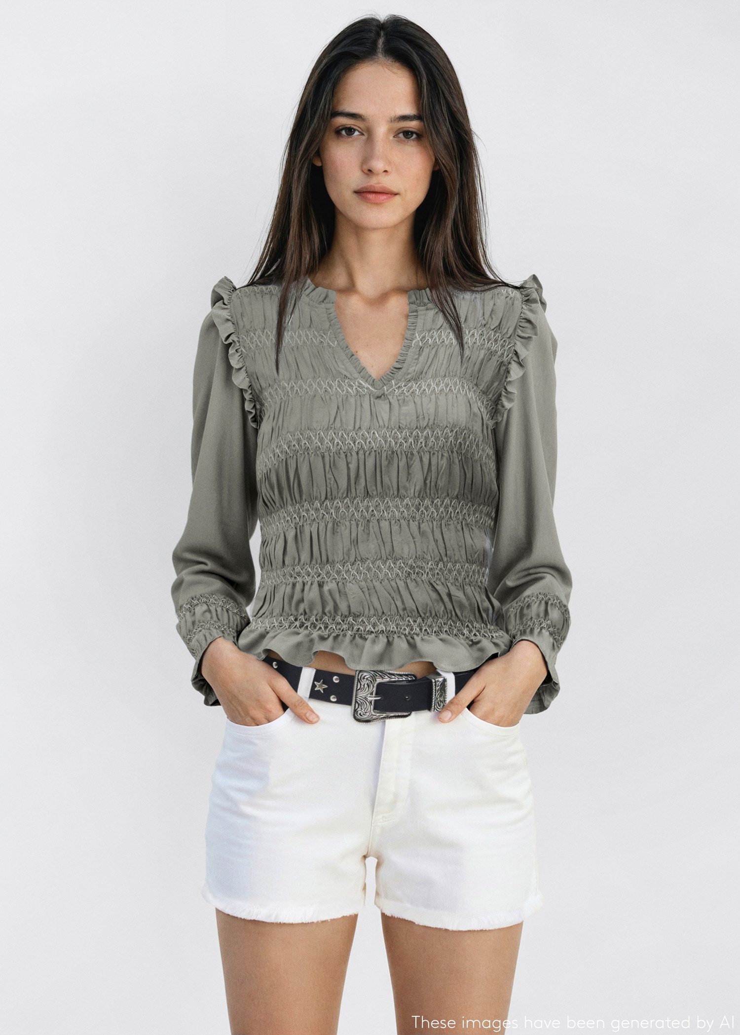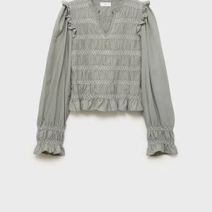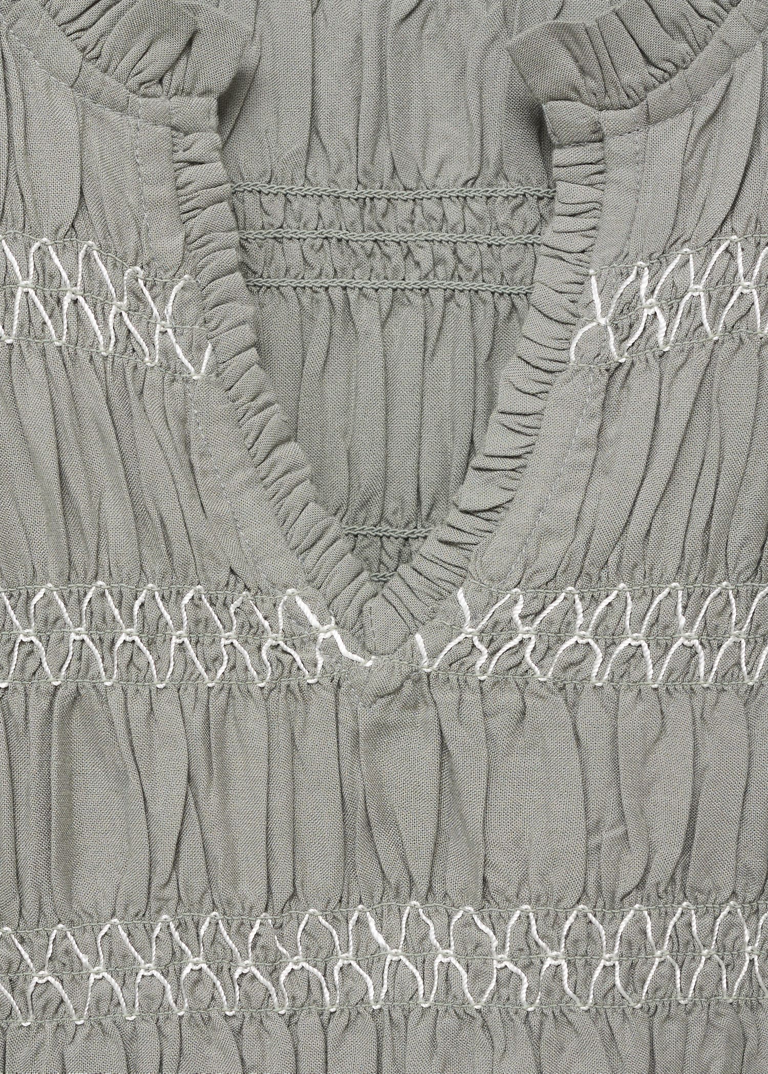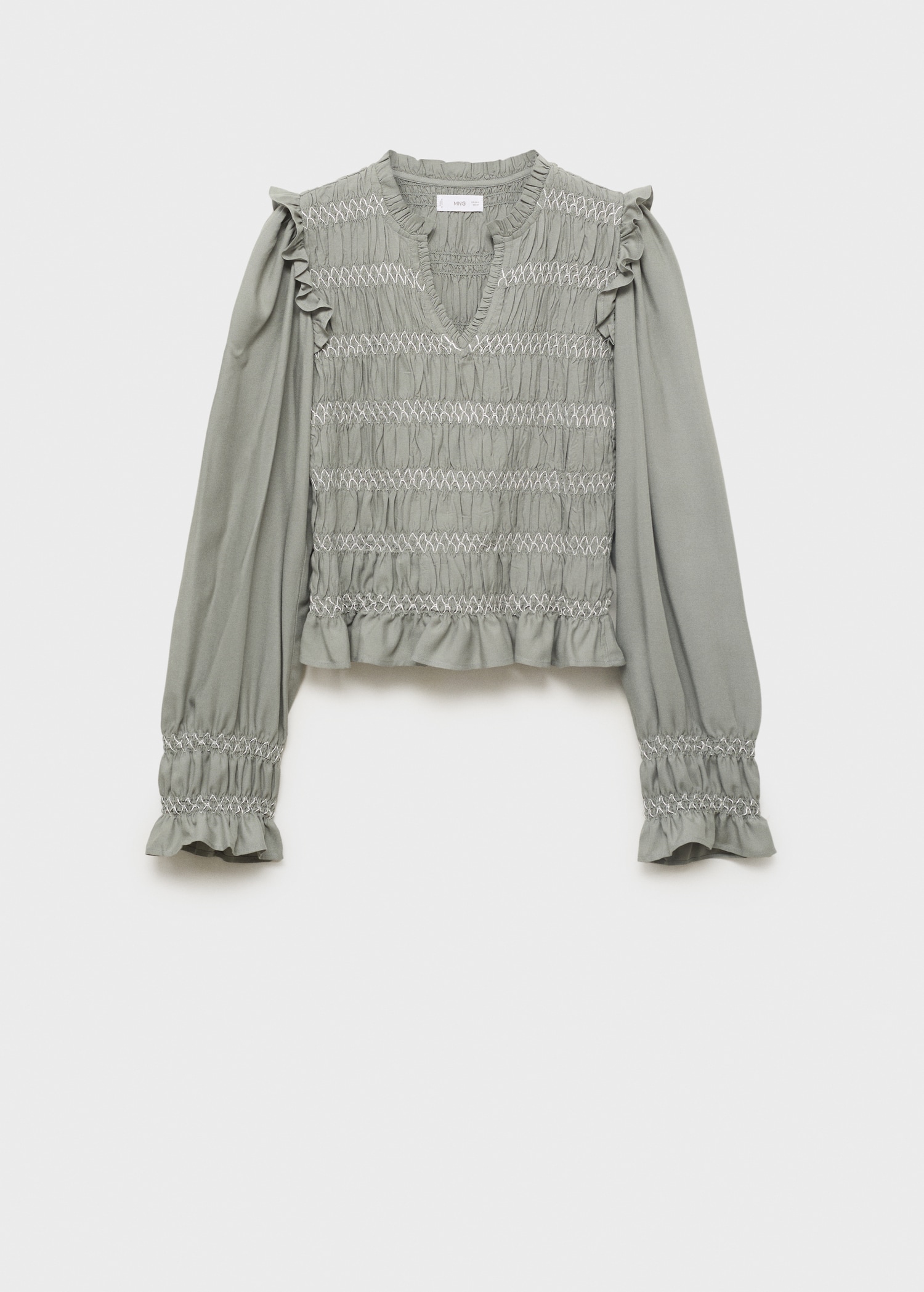 Viscose fabric. Stretch fabric. Straight Design. V-neck. Ruched detail at the neck. Long puffed sleeves. Ruffled detail on the sleeve. Ruched detail on the cuffs. Frill on the bottom. Embroidered details