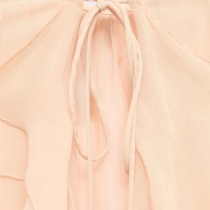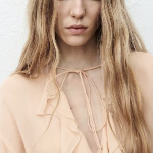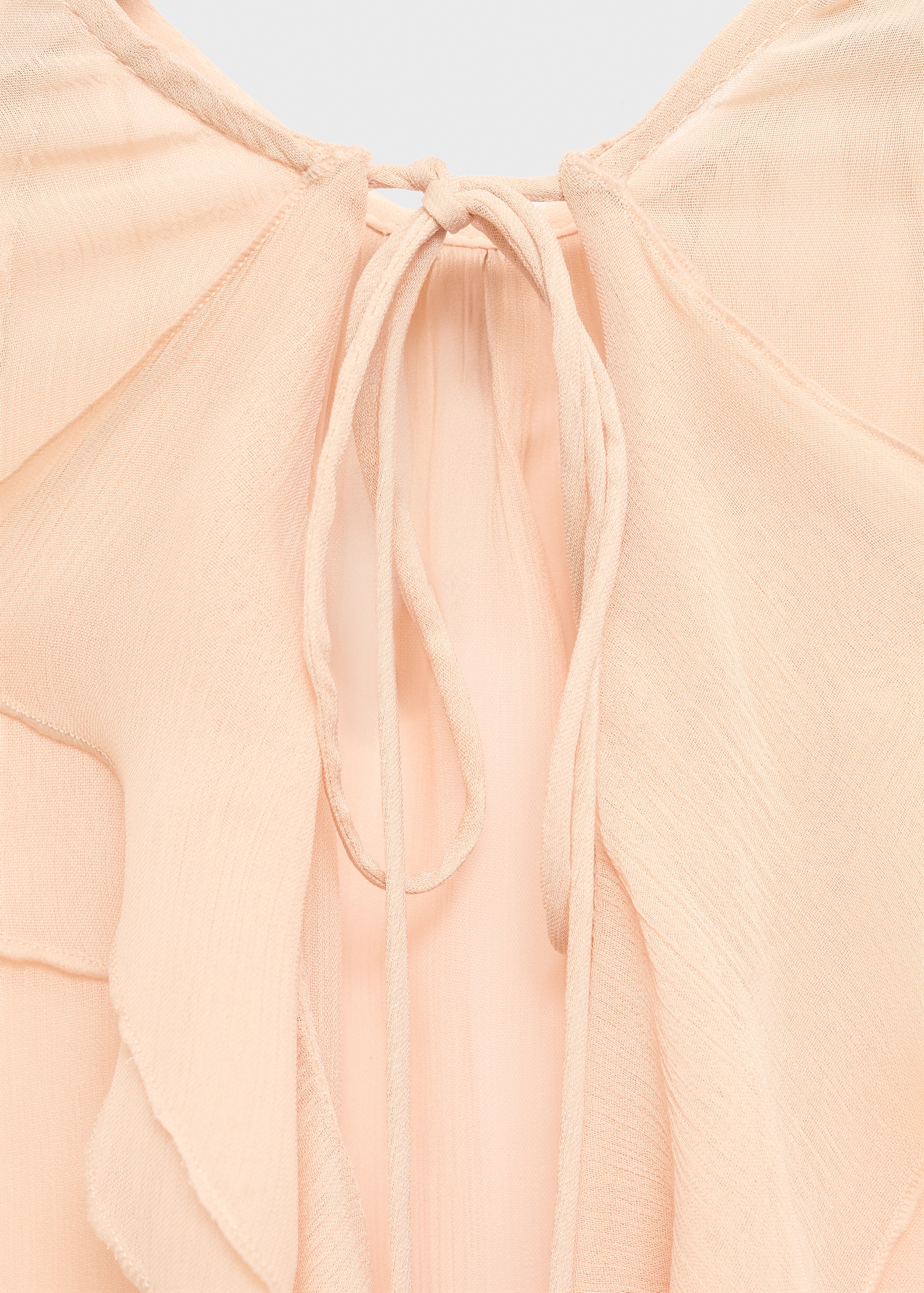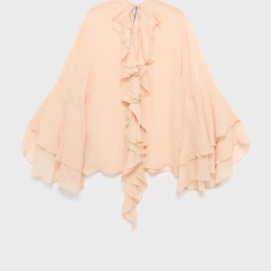 Straight Design. Low neckline. Ruffle detail. Long flared sleeve. Ruffles detail on the cuffs. Bow fastening on the neck