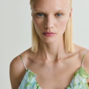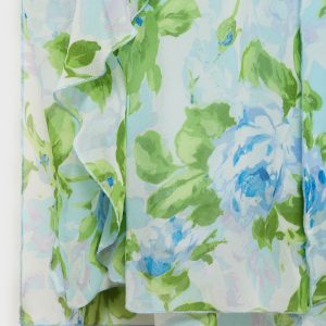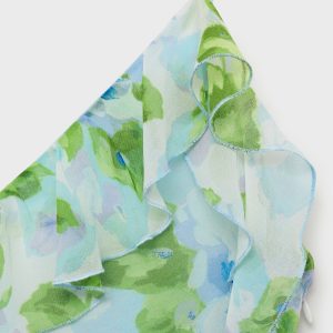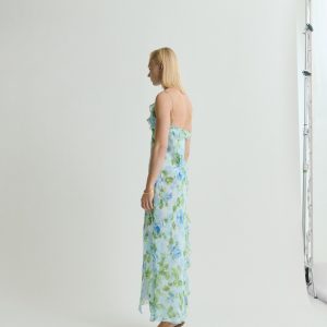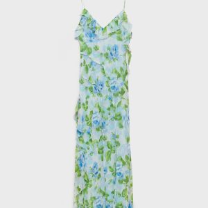 Long design. Straight Design. Ruffled design. Floral print. Low neckline. Sleeveless. Thin straps. Side slit at hem. Side zip closure. Inner lining. This garment is part of our event collection, designed to make you the perfect guest at any party, wedding, or ceremony.